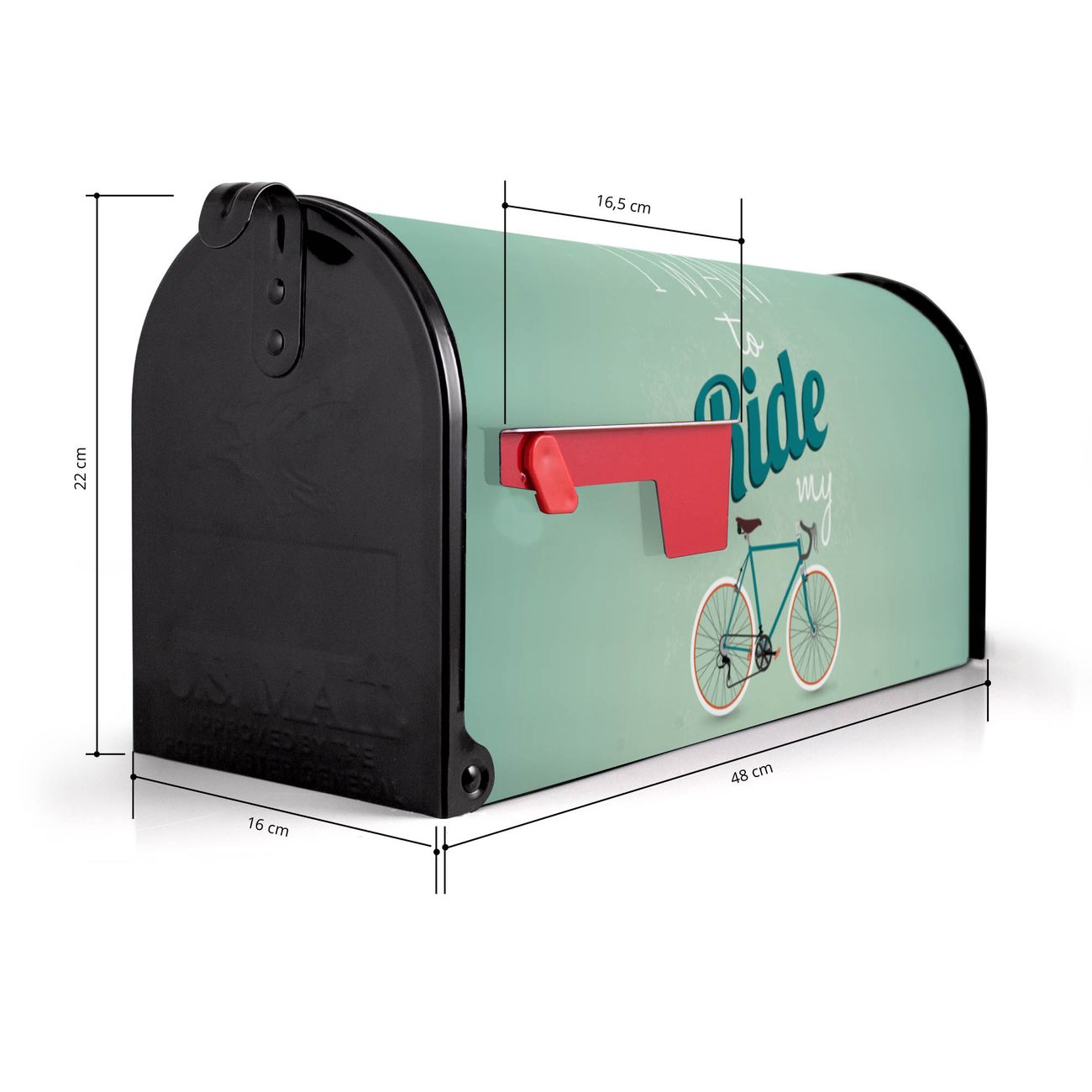 Der amerikanische Briefkasten von banjado mit I want to ride my bike Motiv bietet Ihnen ausreichend Fassungsvermögen, um große A4 Sendungen und Zeitschriften zu empfangen. Die typisch amerikanische rote Fahne zeigt Ihnen an, wenn Sie Post erhalten haben. Die US-Mailbox besteht aus verzinktem Stahlblech welches lackiert wurde und ist 48 x 22 x 16 CM (BxHxT) groß. Die Folie mit Motiv I want to ride my bike besteht aus einer wetter- und UV-resistenten Folie, die mit einem Schutzlaminat überzogen ist, sodass die US Mailbox zusätzlich vor Kratzern geschützt ist. An der Unterkante sind 4 Löcher je Seite um die Mailbox, typisch amerikanisch, an einem Holzpfahl oder einem Zaun zu befestigen. Auf Wunsch können Sie bei uns den passenden Standfuß oder die passende Wandhalterung kaufen um die US-Mailbox sicher zu befestigen. Wir bieten Ihnen ebenfalls Namensschilder, bereits beschriftet oder frei zu beschriften, und verschiedene selbst gestaltete Bitte-Keine-Werbung-Aufkleber.