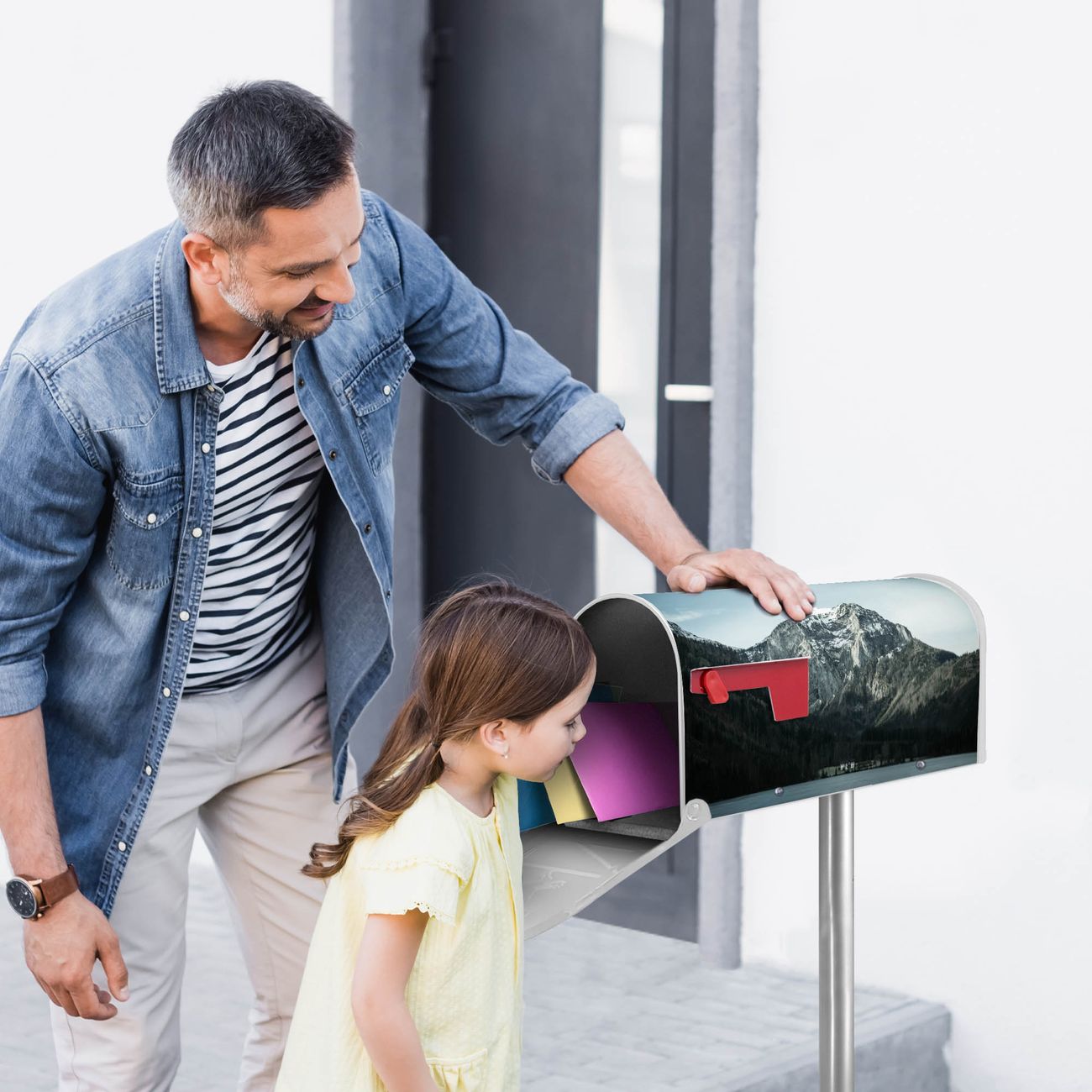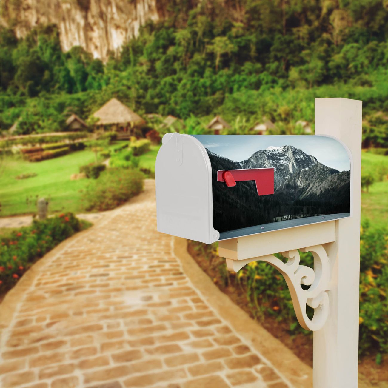 Der amerikanische Briefkasten von banjado mit Im Schatten des Bergs Motiv bietet Ihnen ausreichend Fassungsvermögen, um große A4 Sendungen und Zeitschriften zu empfangen. Die typisch amerikanische rote Fahne zeigt Ihnen an, wenn Sie Post erhalten haben. Die US-Mailbox besteht aus verzinktem Stahlblech welches lackiert wurde und ist 48 x 22 x 16 CM (BxHxT) groß. Die Folie mit Motiv Im Schatten des Bergs besteht aus einer wetter- und UV-resistenten Folie, die mit einem Schutzlaminat überzogen ist, sodass die US Mailbox zusätzlich vor Kratzern geschützt ist. An der Unterkante sind 4 Löcher je Seite um die Mailbox, typisch amerikanisch, an einem Holzpfahl oder einem Zaun zu befestigen. Auf Wunsch können Sie bei uns den passenden Standfuß oder die passende Wandhalterung kaufen um die US-Mailbox sicher zu befestigen. Wir bieten Ihnen ebenfalls Namensschilder, bereits beschriftet oder frei zu beschriften, und verschiedene selbst gestaltete Bitte-Keine-Werbung-Aufkleber.