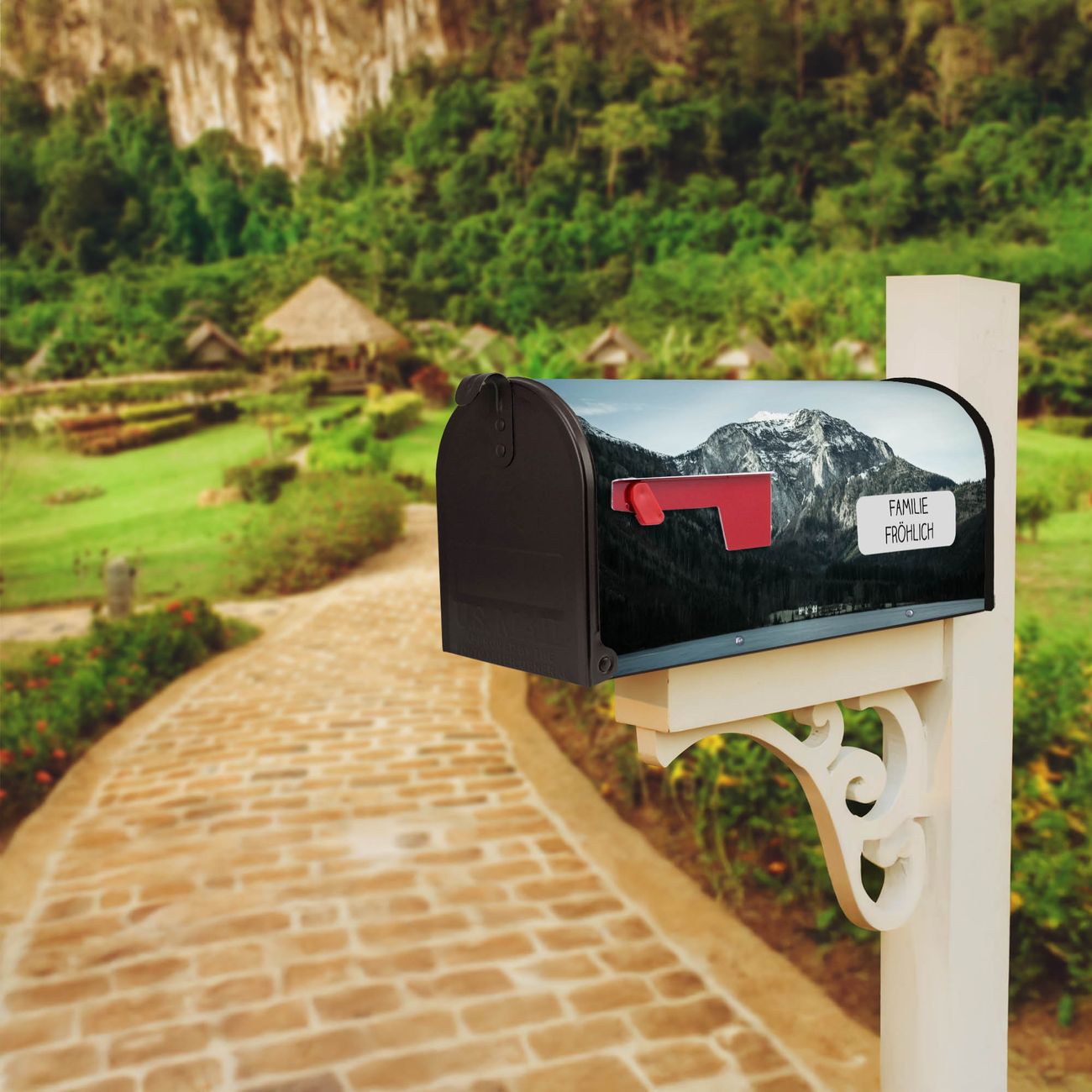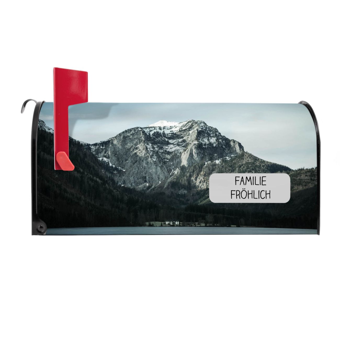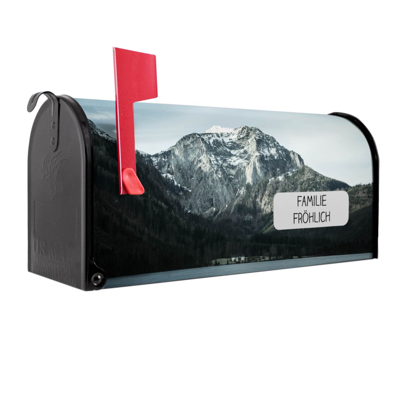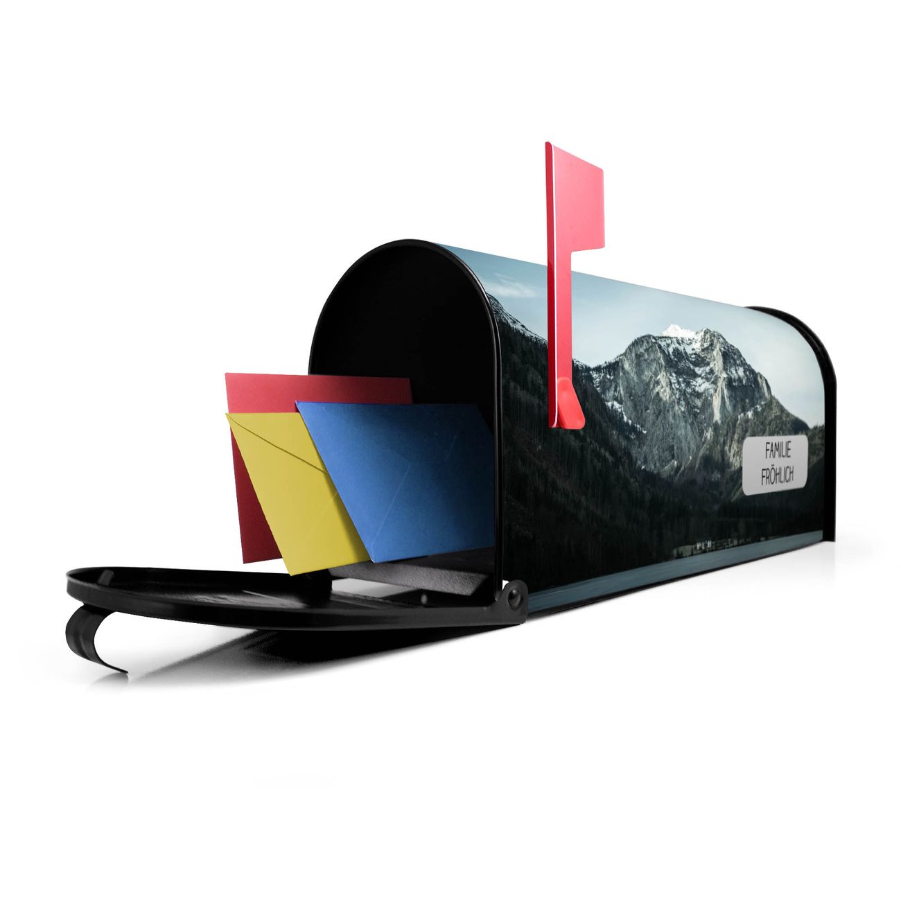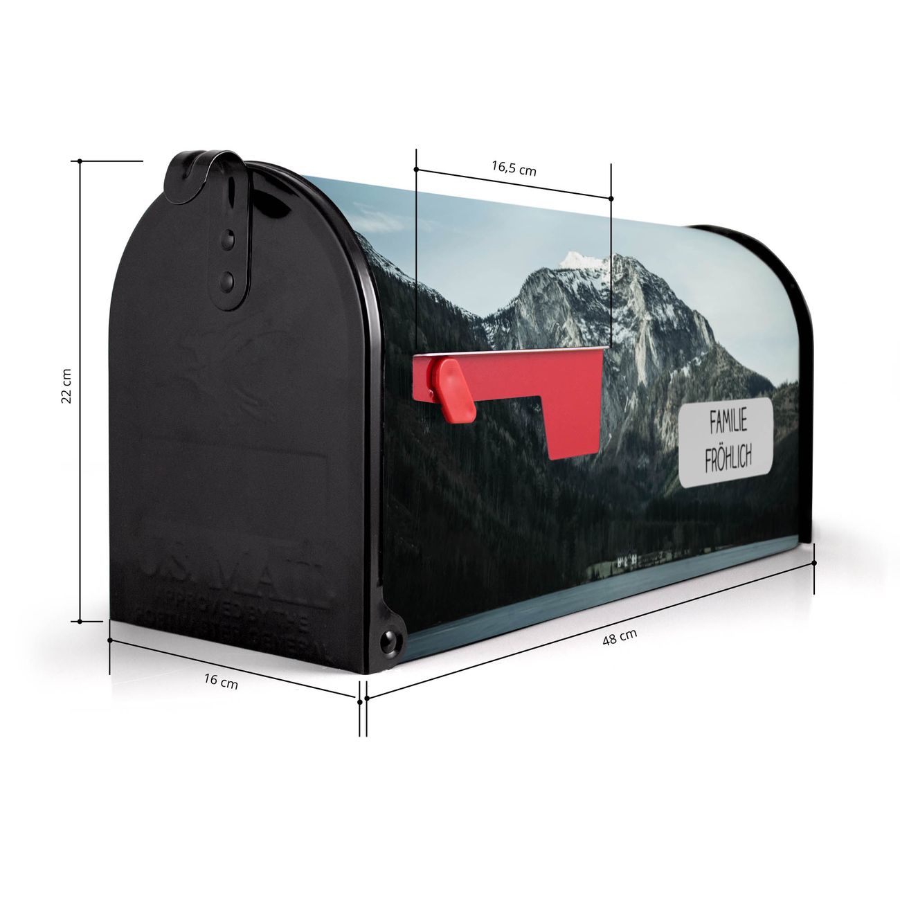 Der amerikanische Briefkasten von banjado mit Im Schatten des Bergs Motiv bietet Ihnen ausreichend Fassungsvermögen, um große A4 Sendungen und Zeitschriften zu empfangen. Die typisch amerikanische rote Fahne zeigt Ihnen an, wenn Sie Post erhalten haben. Die US-Mailbox besteht aus verzinktem Stahlblech welches lackiert wurde und ist 48 x 22 x 16 CM (BxHxT) groß. Die Folie mit Motiv Im Schatten des Bergs besteht aus einer wetter- und UV-resistenten Folie, die mit einem Schutzlaminat überzogen ist, sodass die US Mailbox zusätzlich vor Kratzern geschützt ist. An der Unterkante sind 4 Löcher je Seite um die Mailbox, typisch amerikanisch, an einem Holzpfahl oder einem Zaun zu befestigen. Auf Wunsch können Sie bei uns den passenden Standfuß oder die passende Wandhalterung kaufen um die US-Mailbox sicher zu befestigen. Wir bieten Ihnen ebenfalls Namensschilder, bereits beschriftet oder frei zu beschriften, und verschiedene selbst gestaltete Bitte-Keine-Werbung-Aufkleber.