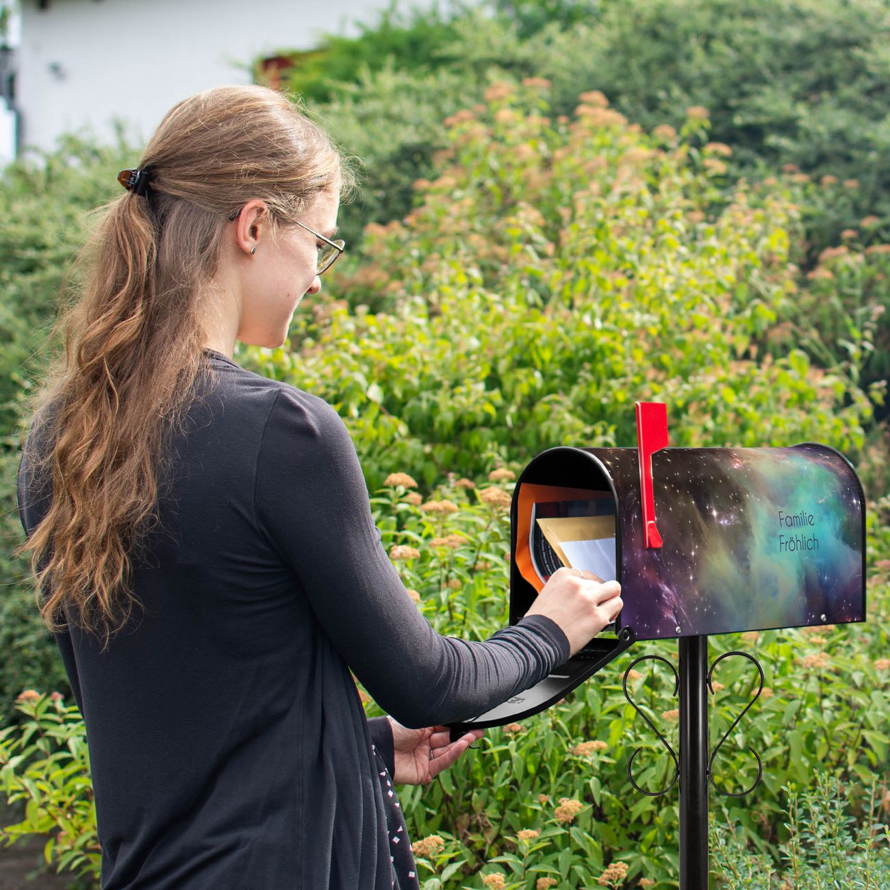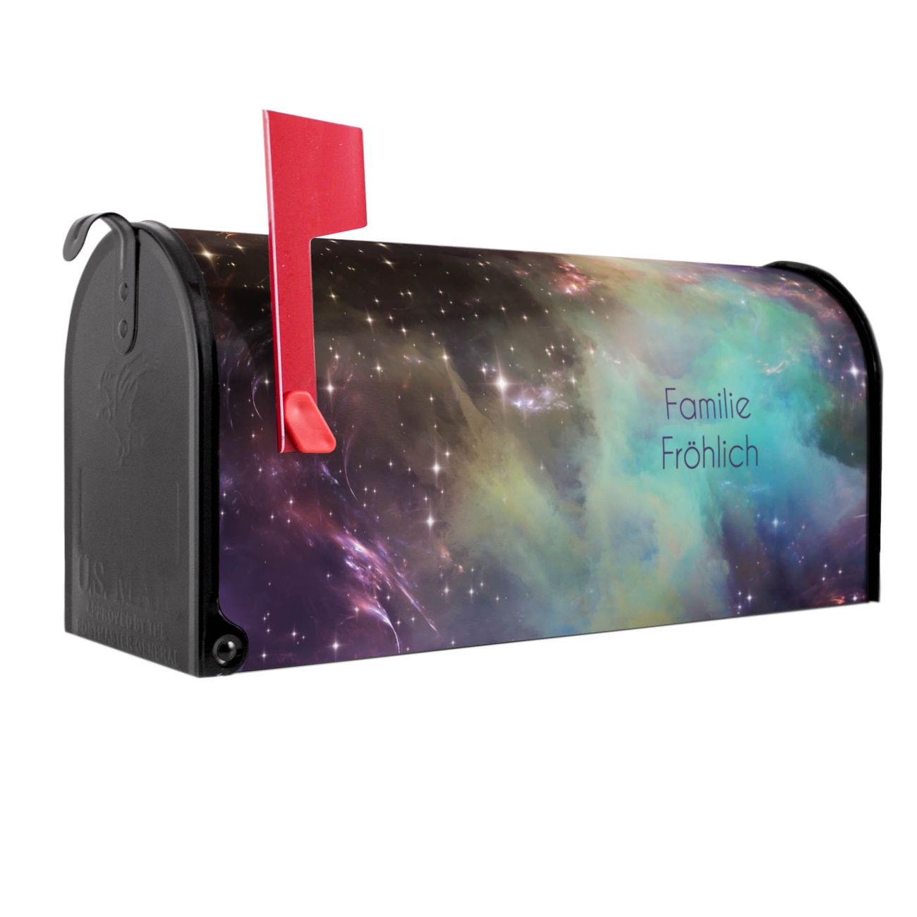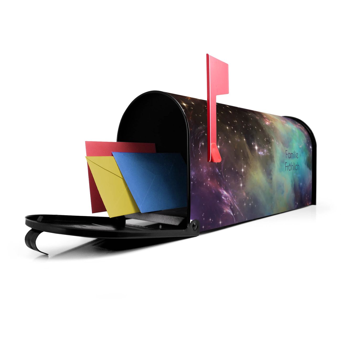 Unser amerikanischer Briefkasten mit dem Motiv Im Weltall 2 hat ein sehr ansprechendes und ausgefallenes Design, ist in der Grundfarbe weiß, grün oder schwarz erhältlich. Damit entlocken Sie Ihren Nachbarn und dem Postboten immer wieder ein Lächeln. Die Mailbox ist ein Original Import aus Mississippi USA und wird von unserer kleinen Manufaktur in Sachsen von Hand veredelt. Die US-Mailbox bietet ausreichend Platz auch für große Sendungen, eine Fahne die Ihnen Post anzeigt, wetterfestes und äußerst stabiles Material - so macht Post empfangen Freude.