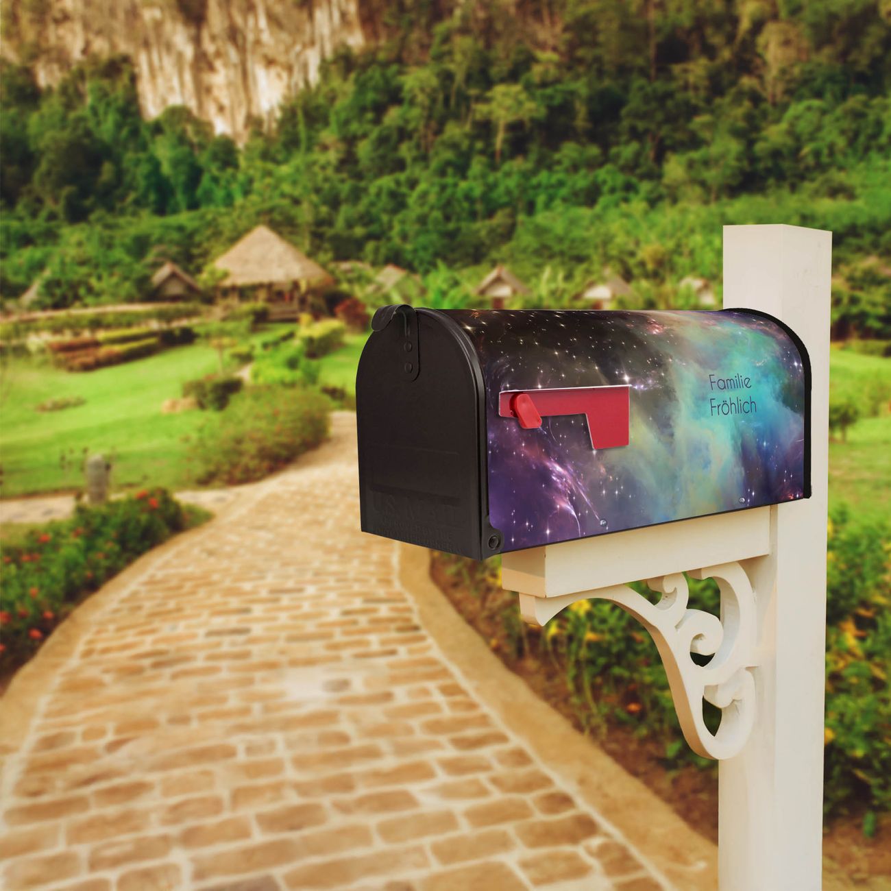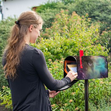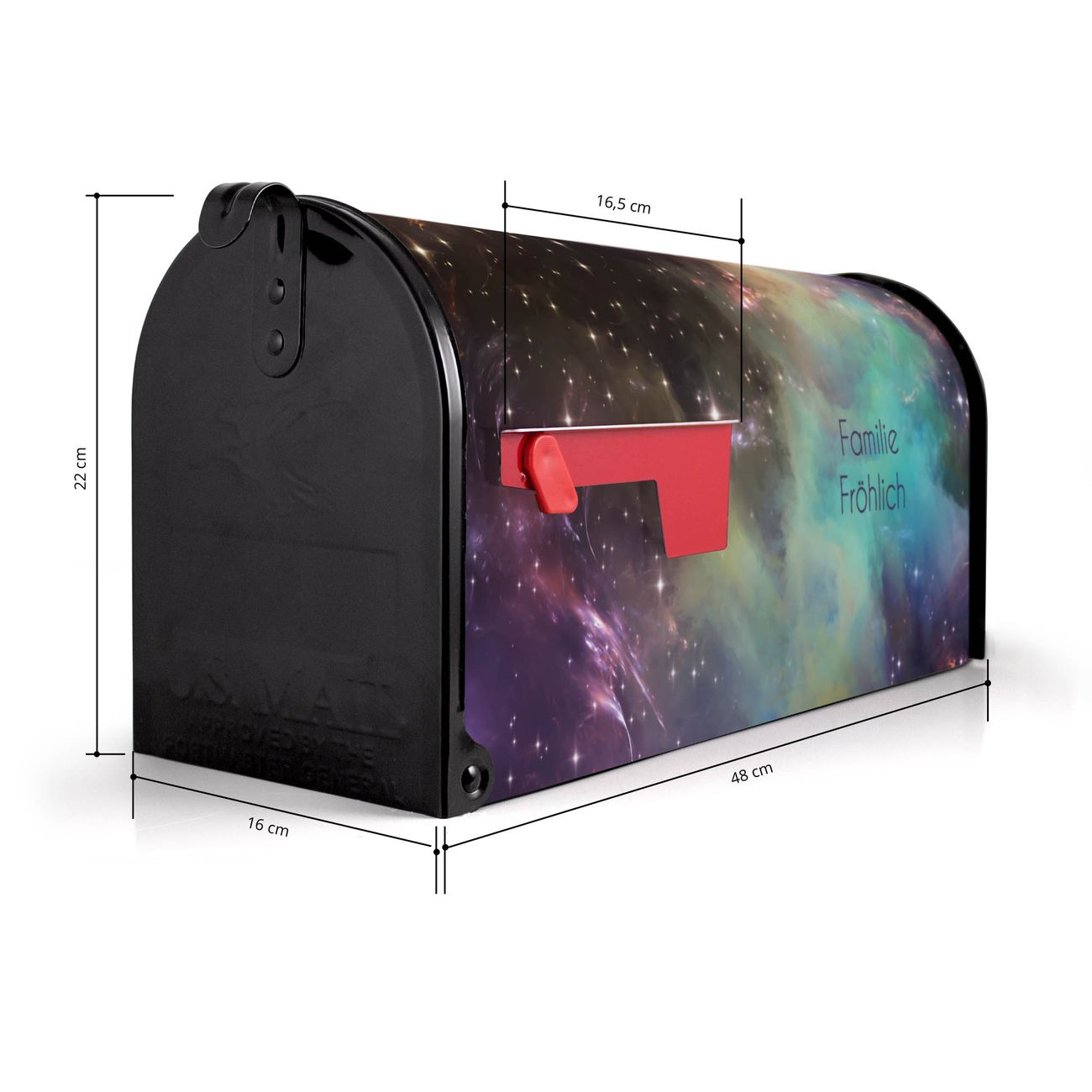 Der amerikanische Briefkasten von banjado mit Im Weltall 2 Motiv bietet Ihnen ausreichend Fassungsvermögen, um große A4 Sendungen und Zeitschriften zu empfangen. Die typisch amerikanische rote Fahne zeigt Ihnen an, wenn Sie Post erhalten haben. Die US-Mailbox besteht aus verzinktem Stahlblech welches lackiert wurde und ist 48 x 22 x 16 CM (BxHxT) groß. Die Folie mit Motiv Im Weltall 2 besteht aus einer wetter- und UV-resistenten Folie, die mit einem Schutzlaminat überzogen ist, sodass die US Mailbox zusätzlich vor Kratzern geschützt ist. An der Unterkante sind 4 Löcher je Seite um die Mailbox, typisch amerikanisch, an einem Holzpfahl oder einem Zaun zu befestigen. Auf Wunsch können Sie bei uns den passenden Standfuß oder die passende Wandhalterung kaufen um die US-Mailbox sicher zu befestigen. Wir bieten Ihnen ebenfalls Namensschilder, bereits beschriftet oder frei zu beschriften, und verschiedene selbst gestaltete Bitte-Keine-Werbung-Aufkleber.