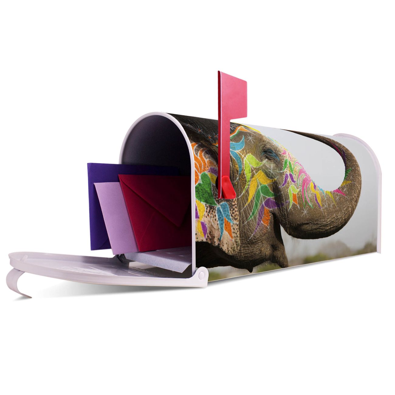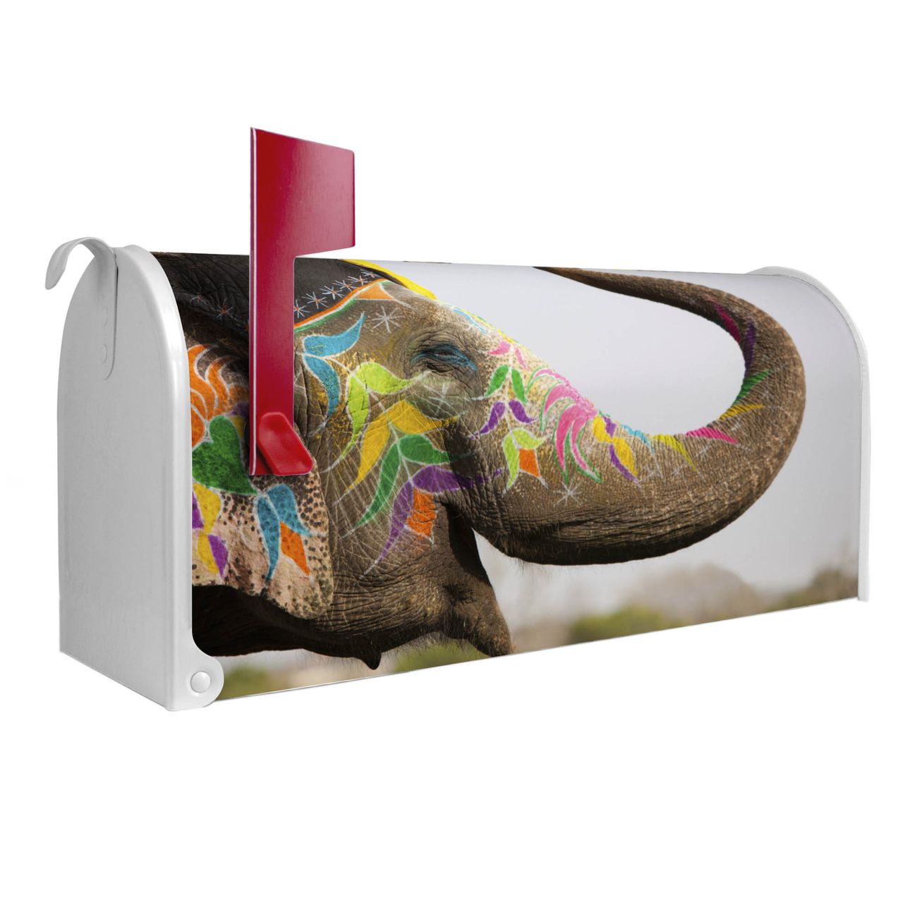 Der amerikanische Briefkasten von banjado mit Indischer Elephant Motiv bietet Ihnen ausreichend Fassungsvermögen, um große A4 Sendungen und Zeitschriften zu empfangen. Die typisch amerikanische rote Fahne zeigt Ihnen an, wenn Sie Post erhalten haben. Die US-Mailbox besteht aus verzinktem Stahlblech welches lackiert wurde und ist 48 x 22 x 16 CM (BxHxT) groß. Die Folie mit Motiv Indischer Elephant besteht aus einer wetter- und UV-resistenten Folie, die mit einem Schutzlaminat überzogen ist, sodass die US Mailbox zusätzlich vor Kratzern geschützt ist. An der Unterkante sind 4 Löcher je Seite um die Mailbox, typisch amerikanisch, an einem Holzpfahl oder einem Zaun zu befestigen. Auf Wunsch können Sie bei uns den passenden Standfuß oder die passende Wandhalterung kaufen um die US-Mailbox sicher zu befestigen. Wir bieten Ihnen ebenfalls Namensschilder, bereits beschriftet oder frei zu beschriften, und verschiedene selbst gestaltete Bitte-Keine-Werbung-Aufkleber.