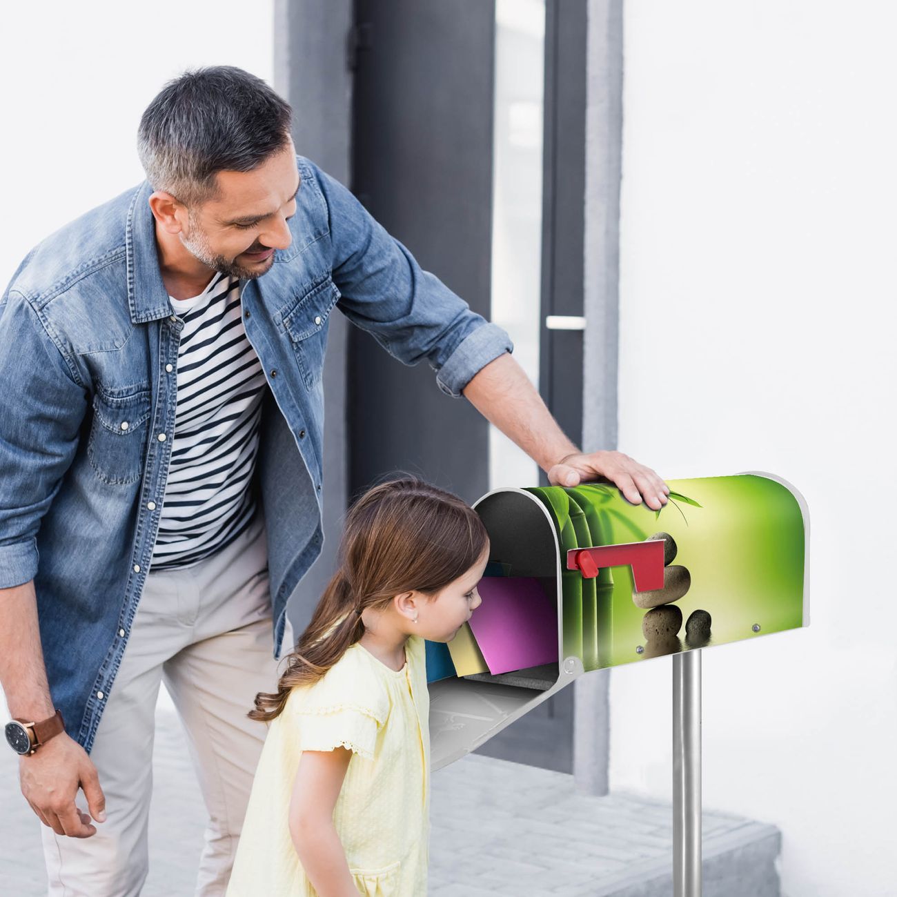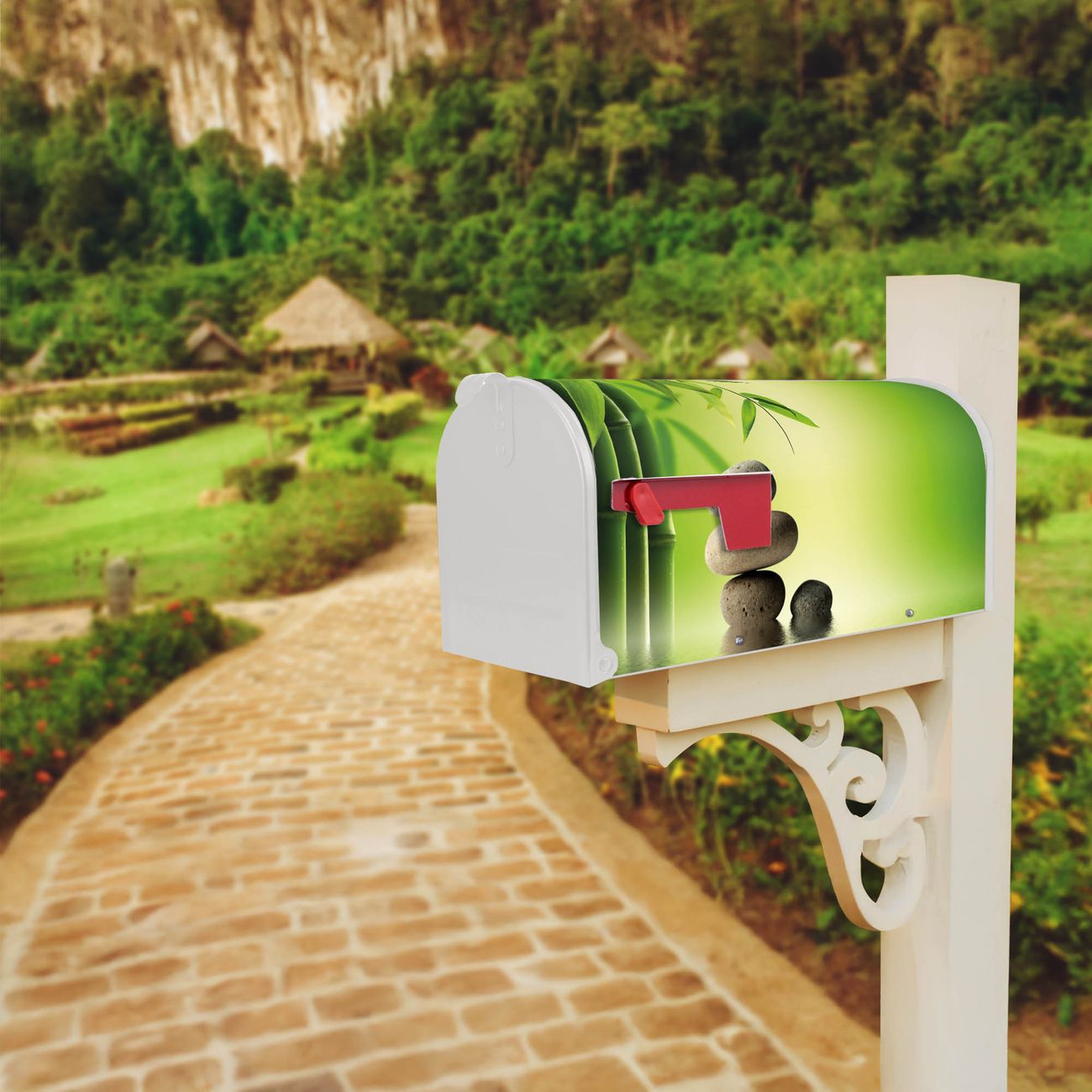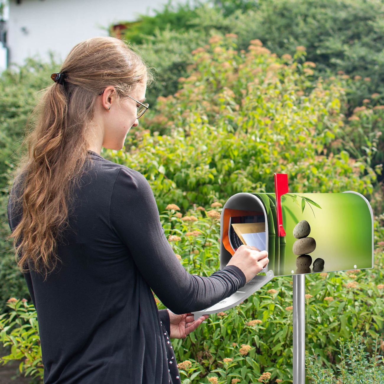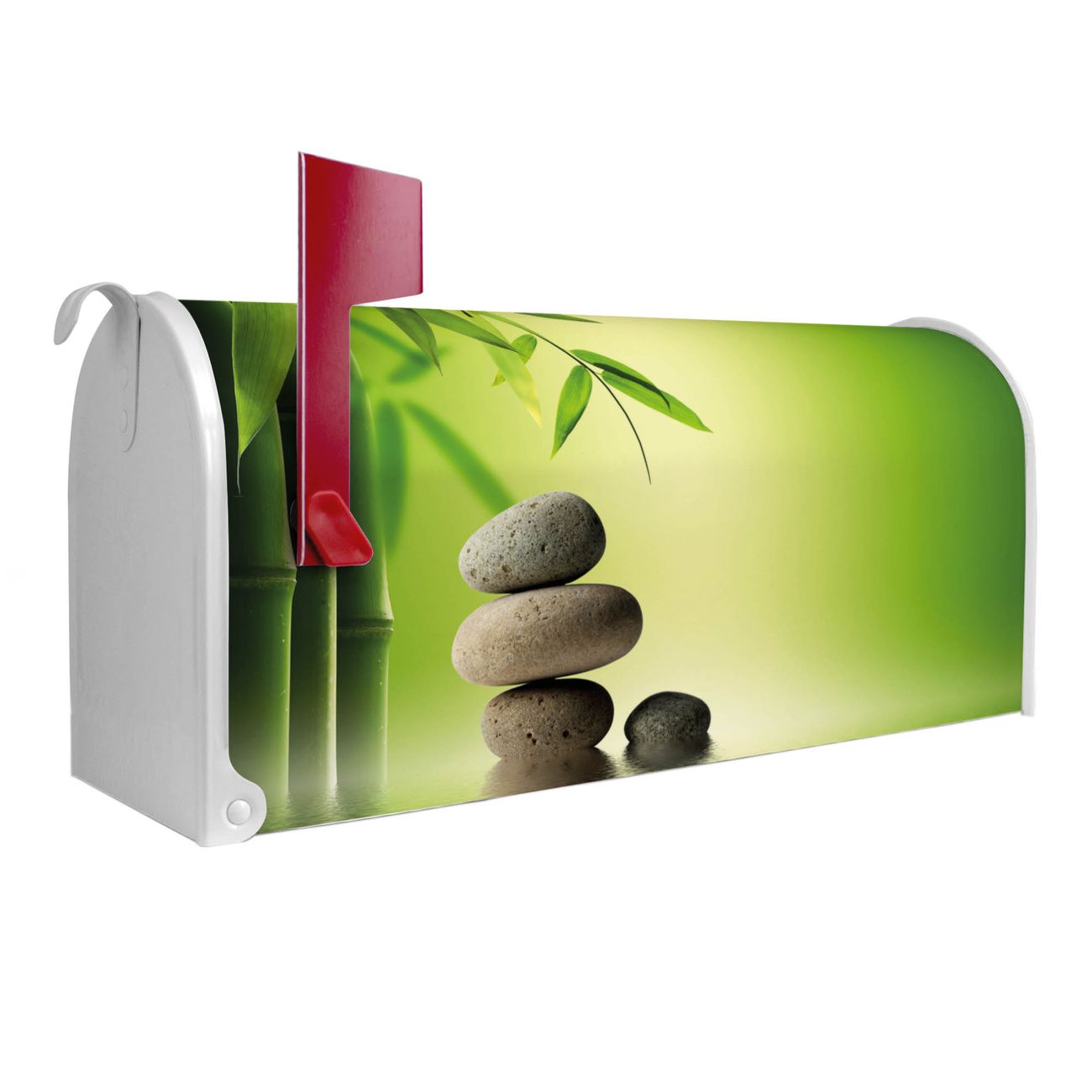 Der amerikanische Briefkasten von banjado mit Innere Ruhe Motiv bietet Ihnen ausreichend Fassungsvermögen, um große A4 Sendungen und Zeitschriften zu empfangen. Die typisch amerikanische rote Fahne zeigt Ihnen an, wenn Sie Post erhalten haben. Die US-Mailbox besteht aus verzinktem Stahlblech welches lackiert wurde und ist 48 x 22 x 16 CM (BxHxT) groß. Die Folie mit Motiv Innere Ruhe besteht aus einer wetter- und UV-resistenten Folie, die mit einem Schutzlaminat überzogen ist, sodass die US Mailbox zusätzlich vor Kratzern geschützt ist. An der Unterkante sind 4 Löcher je Seite um die Mailbox, typisch amerikanisch, an einem Holzpfahl oder einem Zaun zu befestigen. Auf Wunsch können Sie bei uns den passenden Standfuß oder die passende Wandhalterung kaufen um die US-Mailbox sicher zu befestigen. Wir bieten Ihnen ebenfalls Namensschilder, bereits beschriftet oder frei zu beschriften, und verschiedene selbst gestaltete Bitte-Keine-Werbung-Aufkleber.