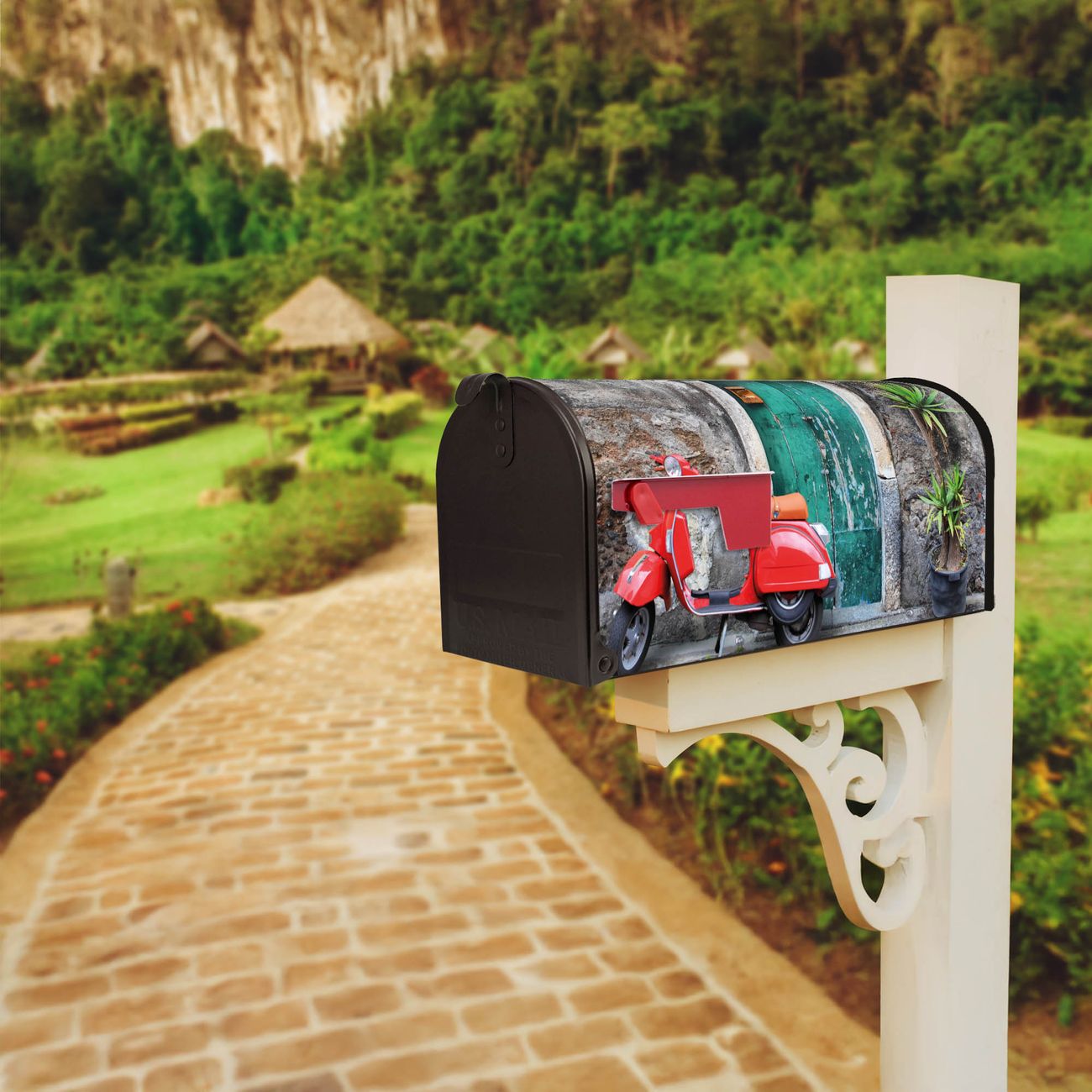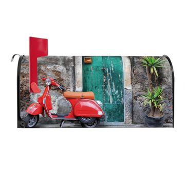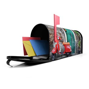 Der amerikanische Briefkasten von banjado mit Italienischer Roller Motiv bietet Ihnen ausreichend Fassungsvermögen, um große A4 Sendungen und Zeitschriften zu empfangen. Die typisch amerikanische rote Fahne zeigt Ihnen an, wenn Sie Post erhalten haben. Die US-Mailbox besteht aus verzinktem Stahlblech welches lackiert wurde und ist 48 x 22 x 16 CM (BxHxT) groß. Die Folie mit Motiv Italienischer Roller besteht aus einer wetter- und UV-resistenten Folie, die mit einem Schutzlaminat überzogen ist, sodass die US Mailbox zusätzlich vor Kratzern geschützt ist. An der Unterkante sind 4 Löcher je Seite um die Mailbox, typisch amerikanisch, an einem Holzpfahl oder einem Zaun zu befestigen. Auf Wunsch können Sie bei uns den passenden Standfuß oder die passende Wandhalterung kaufen um die US-Mailbox sicher zu befestigen. Wir bieten Ihnen ebenfalls Namensschilder, bereits beschriftet oder frei zu beschriften, und verschiedene selbst gestaltete Bitte-Keine-Werbung-Aufkleber.