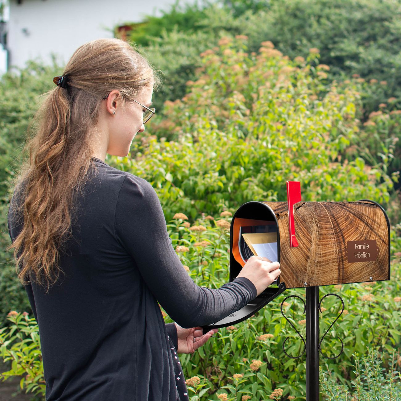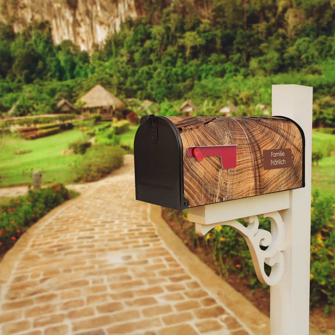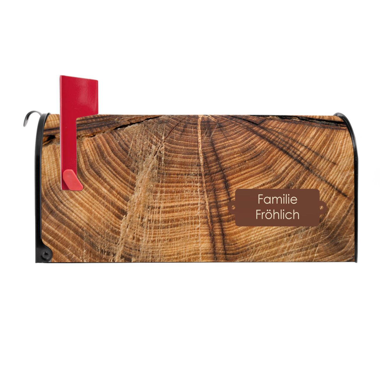 Der amerikanische Briefkasten von banjado mit Jahresringe Motiv bietet Ihnen ausreichend Fassungsvermögen, um große A4 Sendungen und Zeitschriften zu empfangen. Die typisch amerikanische rote Fahne zeigt Ihnen an, wenn Sie Post erhalten haben. Die US-Mailbox besteht aus verzinktem Stahlblech welches lackiert wurde und ist 48 x 22 x 16 CM (BxHxT) groß. Die Folie mit Motiv Jahresringe besteht aus einer wetter- und UV-resistenten Folie, die mit einem Schutzlaminat überzogen ist, sodass die US Mailbox zusätzlich vor Kratzern geschützt ist. An der Unterkante sind 4 Löcher je Seite um die Mailbox, typisch amerikanisch, an einem Holzpfahl oder einem Zaun zu befestigen. Auf Wunsch können Sie bei uns den passenden Standfuß oder die passende Wandhalterung kaufen um die US-Mailbox sicher zu befestigen. Wir bieten Ihnen ebenfalls Namensschilder, bereits beschriftet oder frei zu beschriften, und verschiedene selbst gestaltete Bitte-Keine-Werbung-Aufkleber.