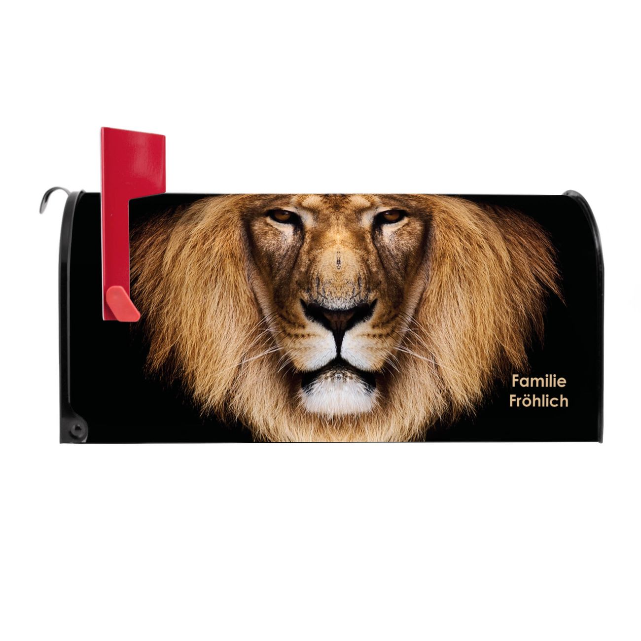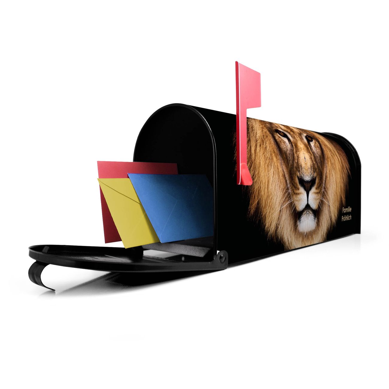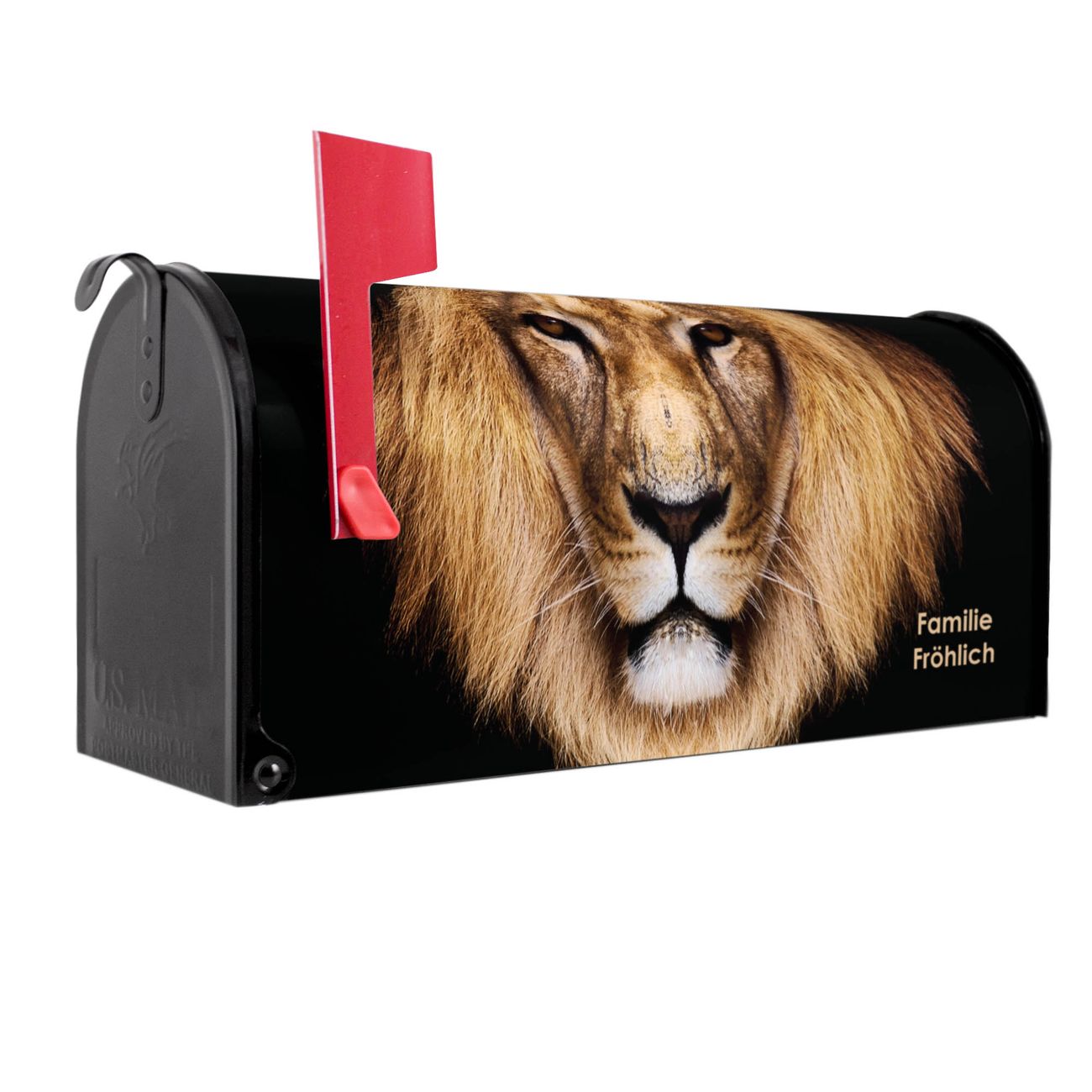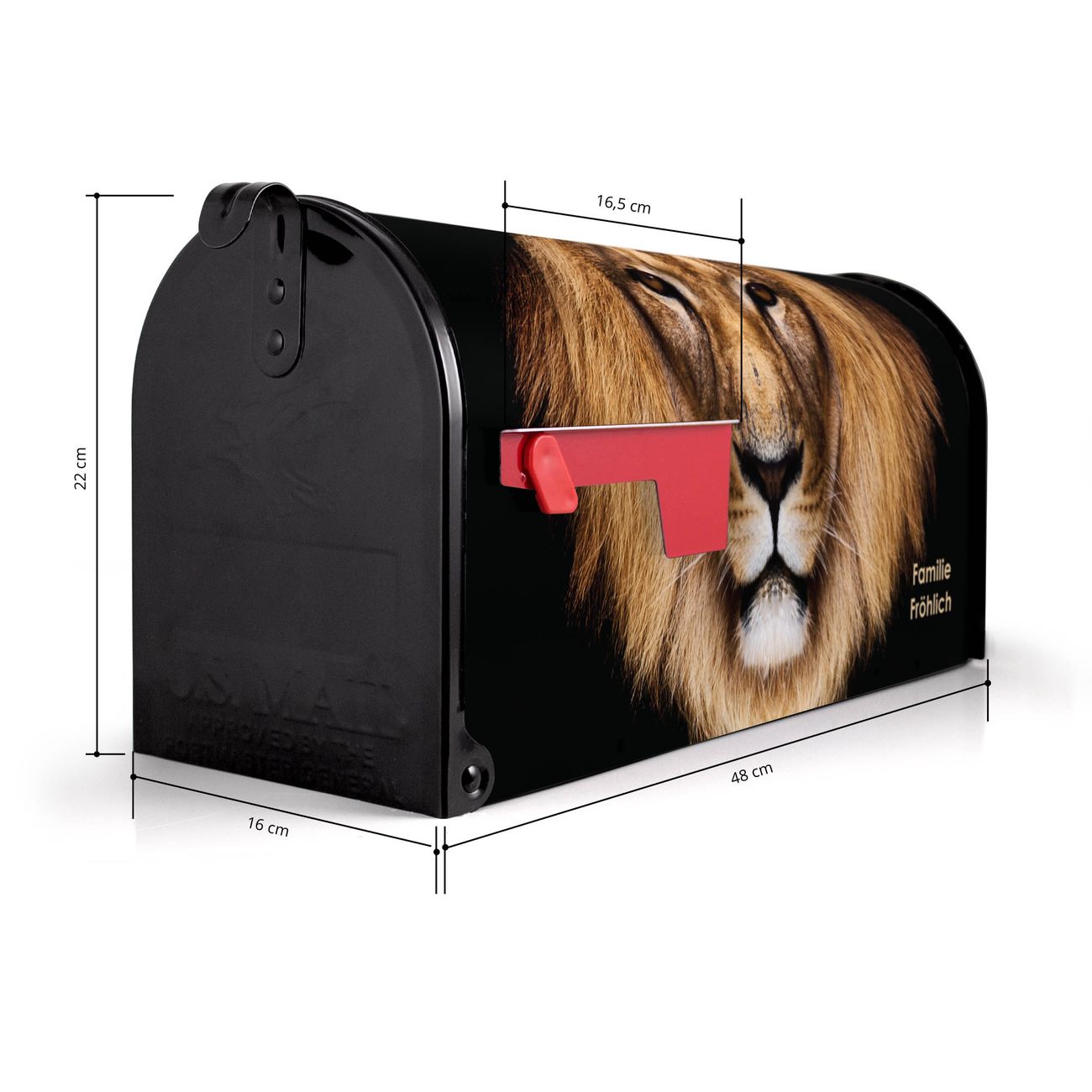 Der amerikanische Briefkasten von banjado mit Jakob Motiv bietet Ihnen ausreichend Fassungsvermögen, um große A4 Sendungen und Zeitschriften zu empfangen. Die typisch amerikanische rote Fahne zeigt Ihnen an, wenn Sie Post erhalten haben. Die US-Mailbox besteht aus verzinktem Stahlblech welches lackiert wurde und ist 48 x 22 x 16 CM (BxHxT) groß. Die Folie mit Motiv Jakob besteht aus einer wetter- und UV-resistenten Folie, die mit einem Schutzlaminat überzogen ist, sodass die US Mailbox zusätzlich vor Kratzern geschützt ist. An der Unterkante sind 4 Löcher je Seite um die Mailbox, typisch amerikanisch, an einem Holzpfahl oder einem Zaun zu befestigen. Auf Wunsch können Sie bei uns den passenden Standfuß oder die passende Wandhalterung kaufen um die US-Mailbox sicher zu befestigen. Wir bieten Ihnen ebenfalls Namensschilder, bereits beschriftet oder frei zu beschriften, und verschiedene selbst gestaltete Bitte-Keine-Werbung-Aufkleber.