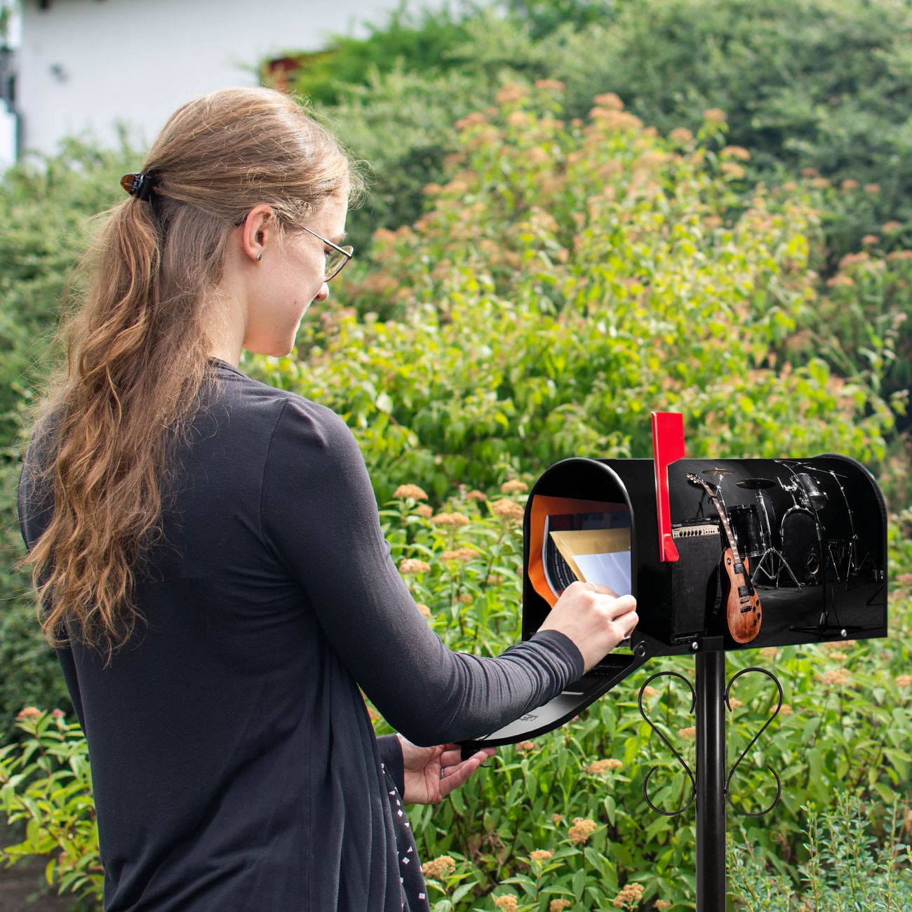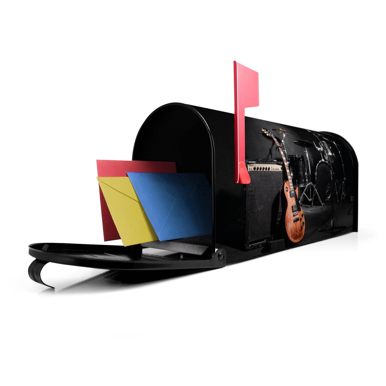 Der amerikanische Briefkasten von banjado mit Jam Session Motiv bietet Ihnen ausreichend Fassungsvermögen, um große A4 Sendungen und Zeitschriften zu empfangen. Die typisch amerikanische rote Fahne zeigt Ihnen an, wenn Sie Post erhalten haben. Die US-Mailbox besteht aus verzinktem Stahlblech welches lackiert wurde und ist 48 x 22 x 16 CM (BxHxT) groß. Die Folie mit Motiv Jam Session besteht aus einer wetter- und UV-resistenten Folie, die mit einem Schutzlaminat überzogen ist, sodass die US Mailbox zusätzlich vor Kratzern geschützt ist. An der Unterkante sind 4 Löcher je Seite um die Mailbox, typisch amerikanisch, an einem Holzpfahl oder einem Zaun zu befestigen. Auf Wunsch können Sie bei uns den passenden Standfuß oder die passende Wandhalterung kaufen um die US-Mailbox sicher zu befestigen. Wir bieten Ihnen ebenfalls Namensschilder, bereits beschriftet oder frei zu beschriften, und verschiedene selbst gestaltete Bitte-Keine-Werbung-Aufkleber.
