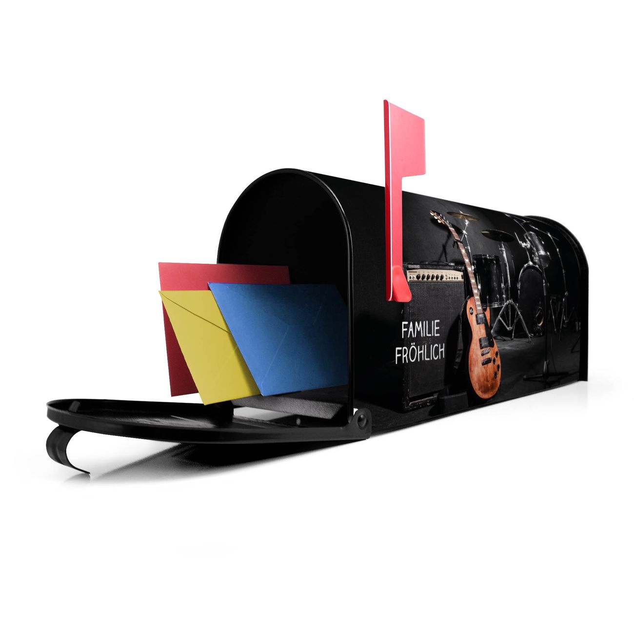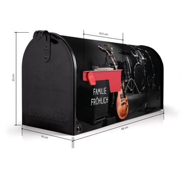 Der amerikanische Briefkasten von banjado mit Jam Session Motiv bietet Ihnen ausreichend Fassungsvermögen, um große A4 Sendungen und Zeitschriften zu empfangen. Die typisch amerikanische rote Fahne zeigt Ihnen an, wenn Sie Post erhalten haben. Die US-Mailbox besteht aus verzinktem Stahlblech welches lackiert wurde und ist 48 x 22 x 16 CM (BxHxT) groß. Die Folie mit Motiv Jam Session besteht aus einer wetter- und UV-resistenten Folie, die mit einem Schutzlaminat überzogen ist, sodass die US Mailbox zusätzlich vor Kratzern geschützt ist. An der Unterkante sind 4 Löcher je Seite um die Mailbox, typisch amerikanisch, an einem Holzpfahl oder einem Zaun zu befestigen. Auf Wunsch können Sie bei uns den passenden Standfuß oder die passende Wandhalterung kaufen um die US-Mailbox sicher zu befestigen. Wir bieten Ihnen ebenfalls Namensschilder, bereits beschriftet oder frei zu beschriften, und verschiedene selbst gestaltete Bitte-Keine-Werbung-Aufkleber.
