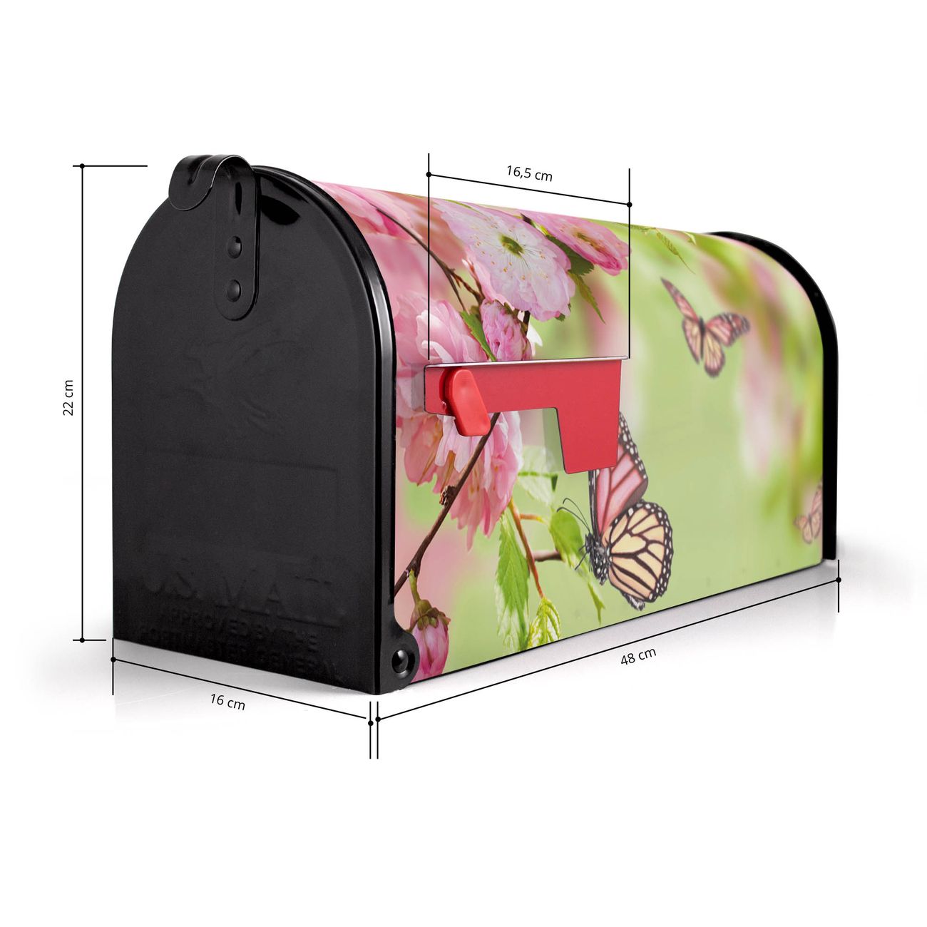Der amerikanische Briefkasten von banjado mit Japanische Kirschblüte Motiv bietet Ihnen ausreichend Fassungsvermögen, um große A4 Sendungen und Zeitschriften zu empfangen. Die typisch amerikanische rote Fahne zeigt Ihnen an, wenn Sie Post erhalten haben. Die US-Mailbox besteht aus verzinktem Stahlblech welches lackiert wurde und ist 48 x 22 x 16 CM (BxHxT) groß. Die Folie mit Motiv Japanische Kirschblüte besteht aus einer wetter- und UV-resistenten Folie, die mit einem Schutzlaminat überzogen ist, sodass die US Mailbox zusätzlich vor Kratzern geschützt ist. An der Unterkante sind 4 Löcher je Seite um die Mailbox, typisch amerikanisch, an einem Holzpfahl oder einem Zaun zu befestigen. Auf Wunsch können Sie bei uns den passenden Standfuß oder die passende Wandhalterung kaufen um die US-Mailbox sicher zu befestigen. Wir bieten Ihnen ebenfalls Namensschilder, bereits beschriftet oder frei zu beschriften, und verschiedene selbst gestaltete Bitte-Keine-Werbung-Aufkleber.