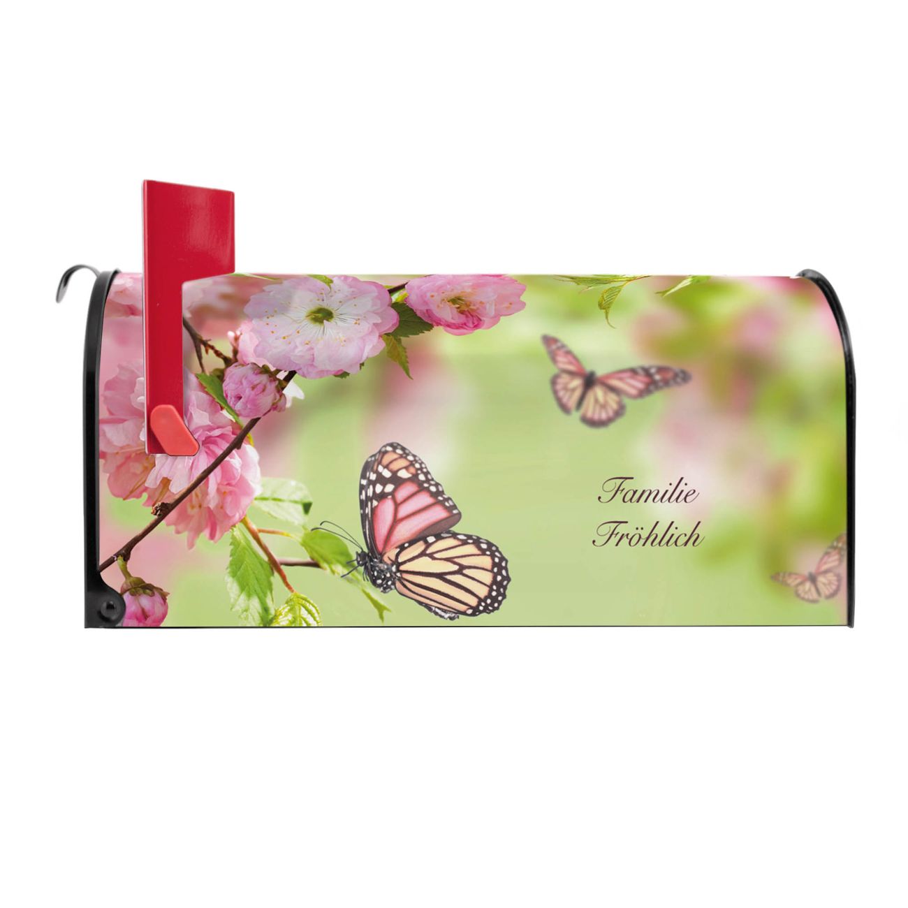 Der amerikanische Briefkasten von banjado mit Japanische Kirschblüte Motiv bietet Ihnen ausreichend Fassungsvermögen, um große A4 Sendungen und Zeitschriften zu empfangen. Die typisch amerikanische rote Fahne zeigt Ihnen an, wenn Sie Post erhalten haben. Die US-Mailbox besteht aus verzinktem Stahlblech welches lackiert wurde und ist 48 x 22 x 16 CM (BxHxT) groß. Die Folie mit Motiv Japanische Kirschblüte besteht aus einer wetter- und UV-resistenten Folie, die mit einem Schutzlaminat überzogen ist, sodass die US Mailbox zusätzlich vor Kratzern geschützt ist. An der Unterkante sind 4 Löcher je Seite um die Mailbox, typisch amerikanisch, an einem Holzpfahl oder einem Zaun zu befestigen. Auf Wunsch können Sie bei uns den passenden Standfuß oder die passende Wandhalterung kaufen um die US-Mailbox sicher zu befestigen. Wir bieten Ihnen ebenfalls Namensschilder, bereits beschriftet oder frei zu beschriften, und verschiedene selbst gestaltete Bitte-Keine-Werbung-Aufkleber.