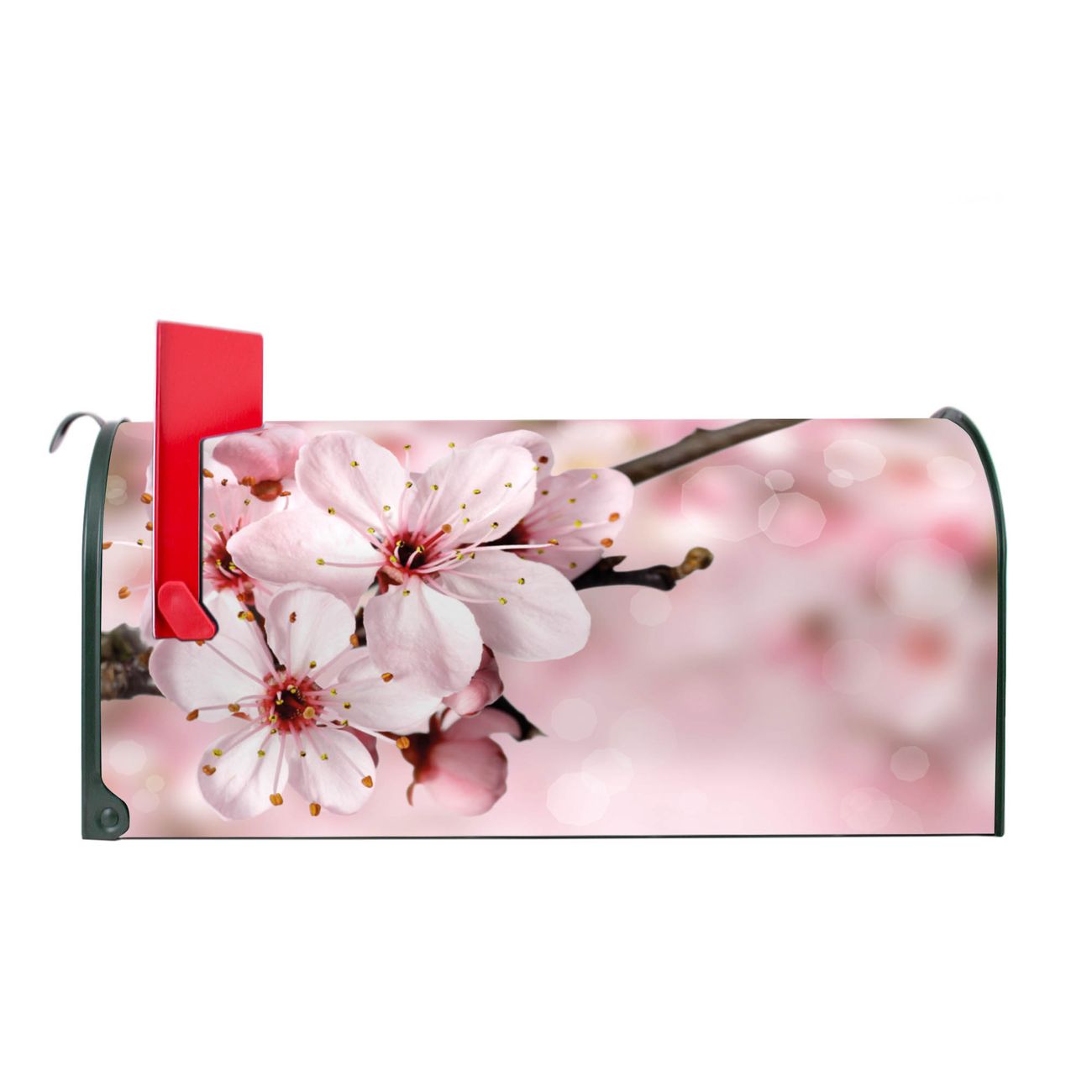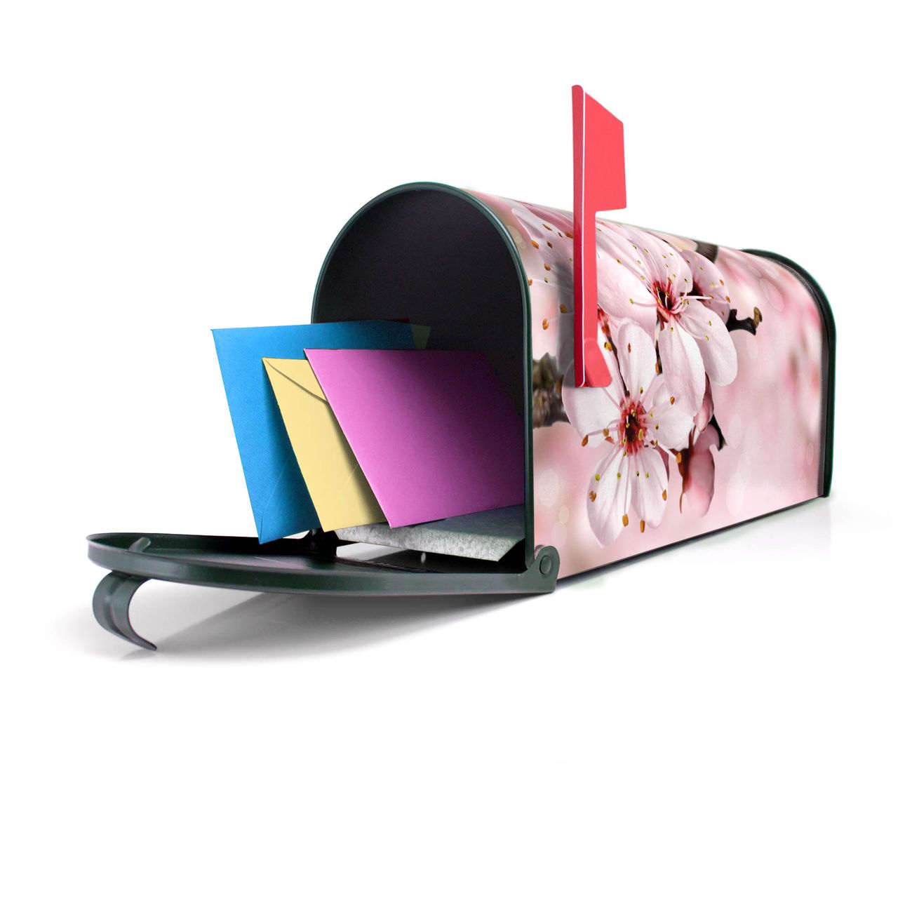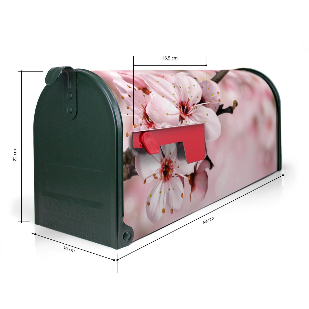 Der amerikanische Briefkasten von banjado mit Japanische Kirsche Motiv bietet Ihnen ausreichend Fassungsvermögen, um große A4 Sendungen und Zeitschriften zu empfangen. Die typisch amerikanische rote Fahne zeigt Ihnen an, wenn Sie Post erhalten haben. Die US-Mailbox besteht aus verzinktem Stahlblech welches lackiert wurde und ist 48 x 22 x 16 CM (BxHxT) groß. Die Folie mit Motiv Japanische Kirsche besteht aus einer wetter- und UV-resistenten Folie, die mit einem Schutzlaminat überzogen ist, sodass die US Mailbox zusätzlich vor Kratzern geschützt ist. An der Unterkante sind 4 Löcher je Seite um die Mailbox, typisch amerikanisch, an einem Holzpfahl oder einem Zaun zu befestigen. Auf Wunsch können Sie bei uns den passenden Standfuß oder die passende Wandhalterung kaufen um die US-Mailbox sicher zu befestigen. Wir bieten Ihnen ebenfalls Namensschilder, bereits beschriftet oder frei zu beschriften, und verschiedene selbst gestaltete Bitte-Keine-Werbung-Aufkleber.