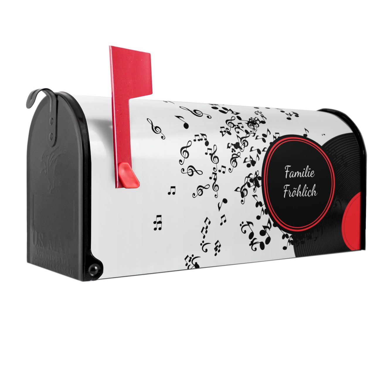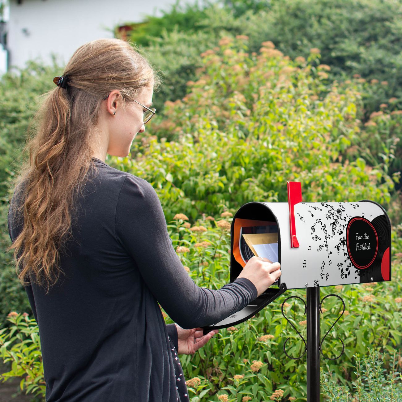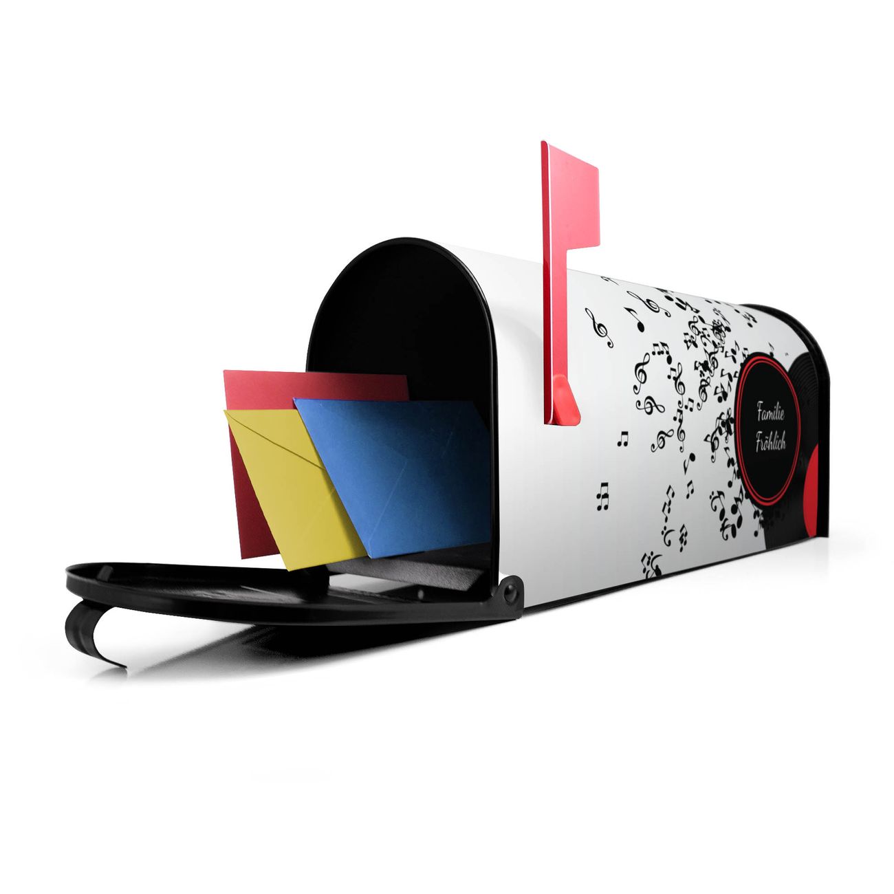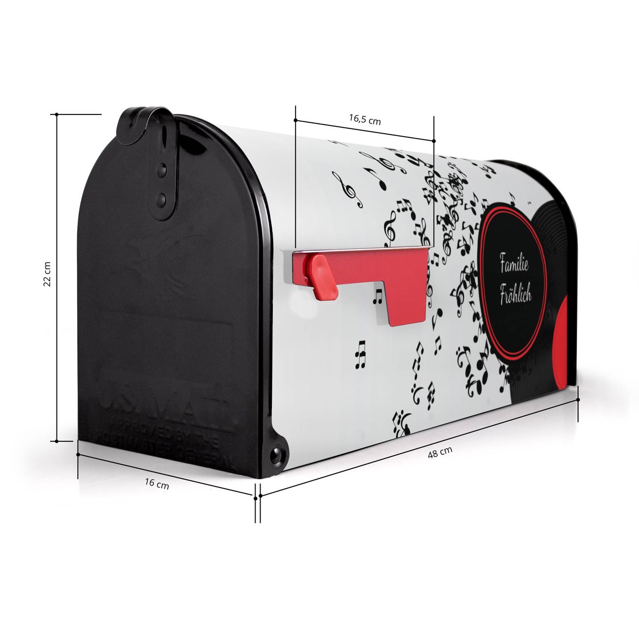 Der amerikanische Briefkasten von banjado mit Juke Box Motiv bietet Ihnen ausreichend Fassungsvermögen, um große A4 Sendungen und Zeitschriften zu empfangen. Die typisch amerikanische rote Fahne zeigt Ihnen an, wenn Sie Post erhalten haben. Die US-Mailbox besteht aus verzinktem Stahlblech welches lackiert wurde und ist 48 x 22 x 16 CM (BxHxT) groß. Die Folie mit Motiv Juke Box besteht aus einer wetter- und UV-resistenten Folie, die mit einem Schutzlaminat überzogen ist, sodass die US Mailbox zusätzlich vor Kratzern geschützt ist. An der Unterkante sind 4 Löcher je Seite um die Mailbox, typisch amerikanisch, an einem Holzpfahl oder einem Zaun zu befestigen. Auf Wunsch können Sie bei uns den passenden Standfuß oder die passende Wandhalterung kaufen um die US-Mailbox sicher zu befestigen. Wir bieten Ihnen ebenfalls Namensschilder, bereits beschriftet oder frei zu beschriften, und verschiedene selbst gestaltete Bitte-Keine-Werbung-Aufkleber.