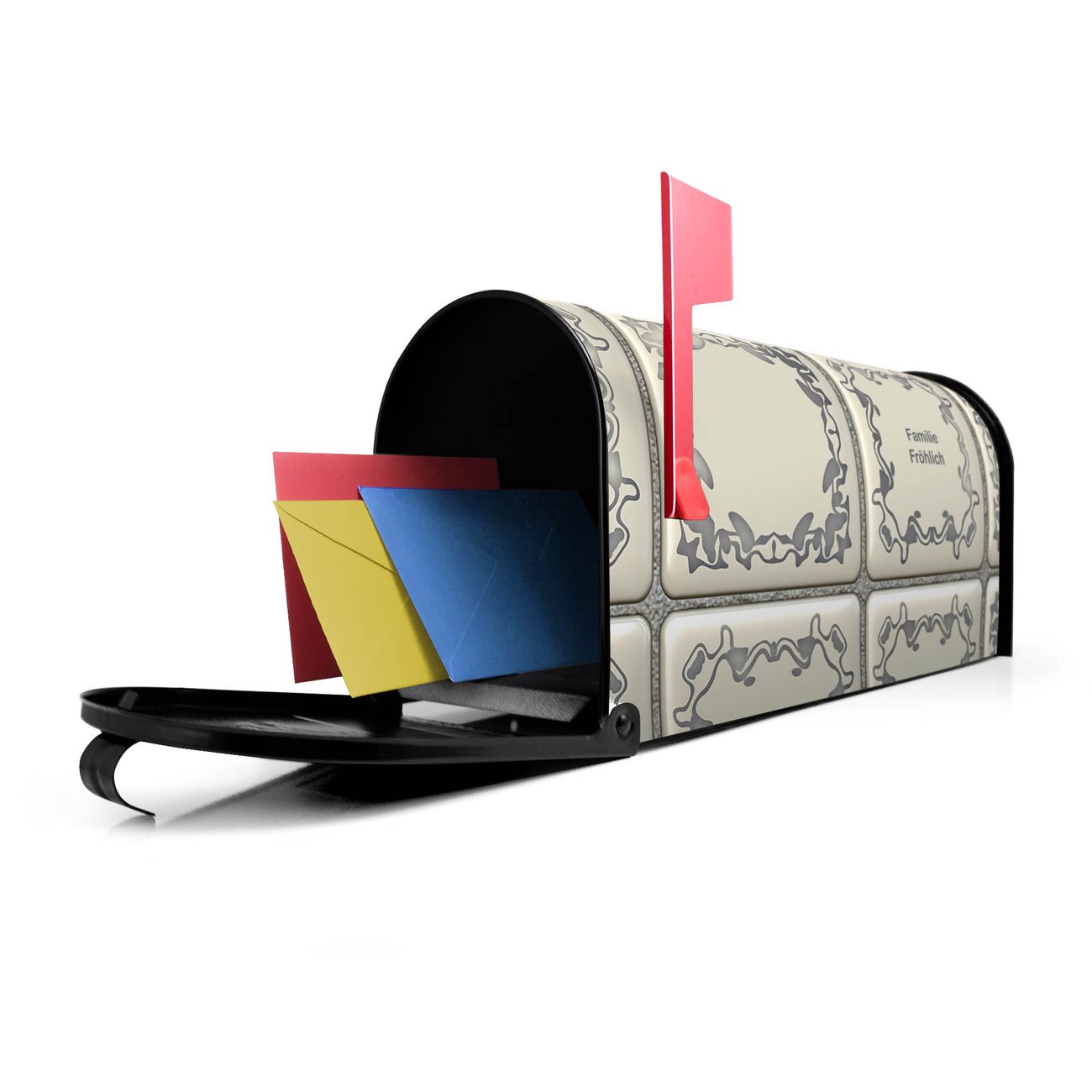 Der amerikanische Briefkasten von banjado mit Kacheln Motiv bietet Ihnen ausreichend Fassungsvermögen, um große A4 Sendungen und Zeitschriften zu empfangen. Die typisch amerikanische rote Fahne zeigt Ihnen an, wenn Sie Post erhalten haben. Die US-Mailbox besteht aus verzinktem Stahlblech welches lackiert wurde und ist 48 x 22 x 16 CM (BxHxT) groß. Die Folie mit Motiv Kacheln besteht aus einer wetter- und UV-resistenten Folie, die mit einem Schutzlaminat überzogen ist, sodass die US Mailbox zusätzlich vor Kratzern geschützt ist. An der Unterkante sind 4 Löcher je Seite um die Mailbox, typisch amerikanisch, an einem Holzpfahl oder einem Zaun zu befestigen. Auf Wunsch können Sie bei uns den passenden Standfuß oder die passende Wandhalterung kaufen um die US-Mailbox sicher zu befestigen. Wir bieten Ihnen ebenfalls Namensschilder, bereits beschriftet oder frei zu beschriften, und verschiedene selbst gestaltete Bitte-Keine-Werbung-Aufkleber.