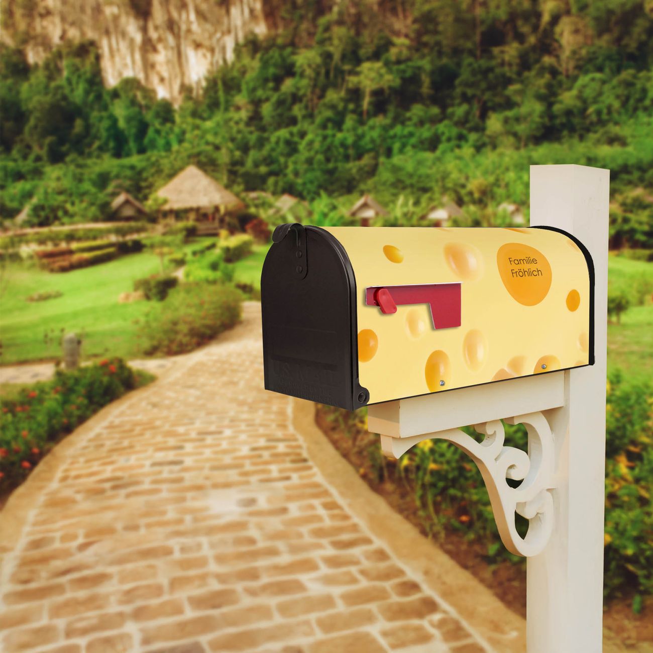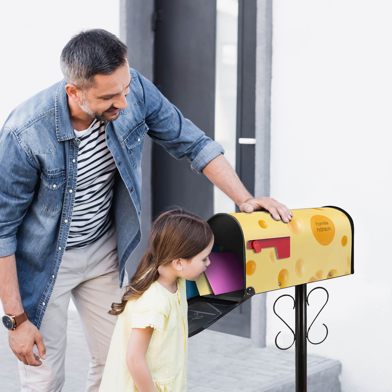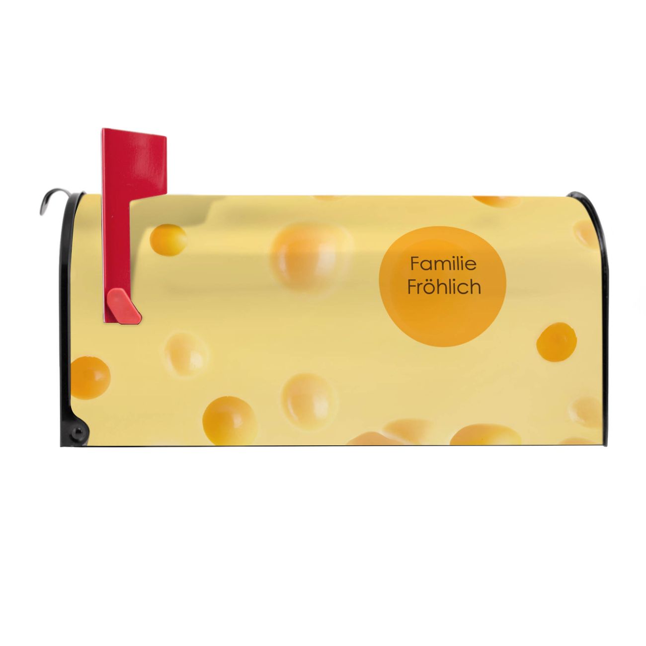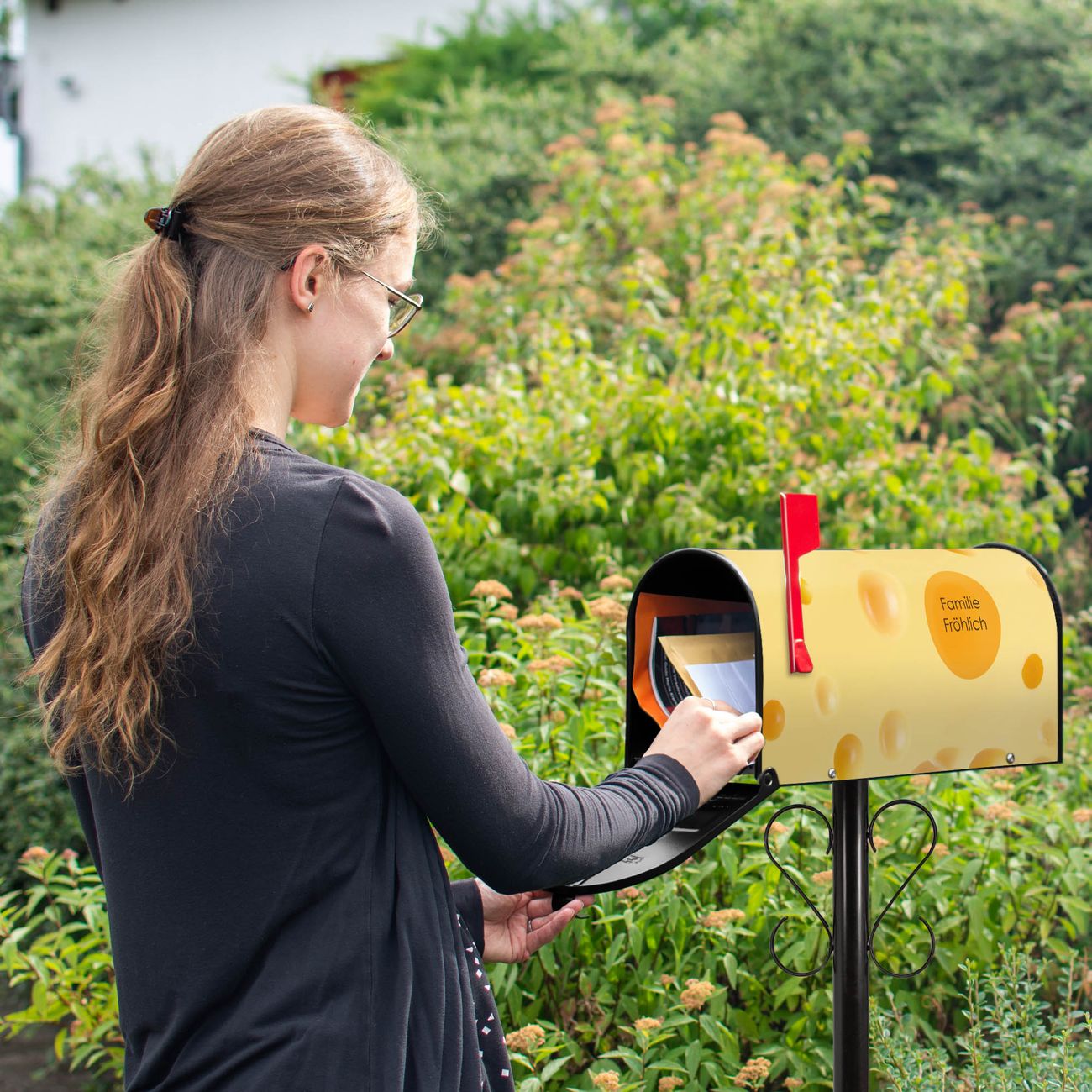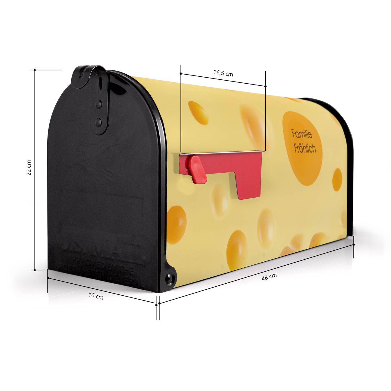 Der amerikanische Briefkasten von banjado mit Käse Motiv bietet Ihnen ausreichend Fassungsvermögen, um große A4 Sendungen und Zeitschriften zu empfangen. Die typisch amerikanische rote Fahne zeigt Ihnen an, wenn Sie Post erhalten haben. Die US-Mailbox besteht aus verzinktem Stahlblech welches lackiert wurde und ist 48 x 22 x 16 CM (BxHxT) groß. Die Folie mit Motiv Käse besteht aus einer wetter- und UV-resistenten Folie, die mit einem Schutzlaminat überzogen ist, sodass die US Mailbox zusätzlich vor Kratzern geschützt ist. An der Unterkante sind 4 Löcher je Seite um die Mailbox, typisch amerikanisch, an einem Holzpfahl oder einem Zaun zu befestigen. Auf Wunsch können Sie bei uns den passenden Standfuß oder die passende Wandhalterung kaufen um die US-Mailbox sicher zu befestigen. Wir bieten Ihnen ebenfalls Namensschilder, bereits beschriftet oder frei zu beschriften, und verschiedene selbst gestaltete Bitte-Keine-Werbung-Aufkleber.