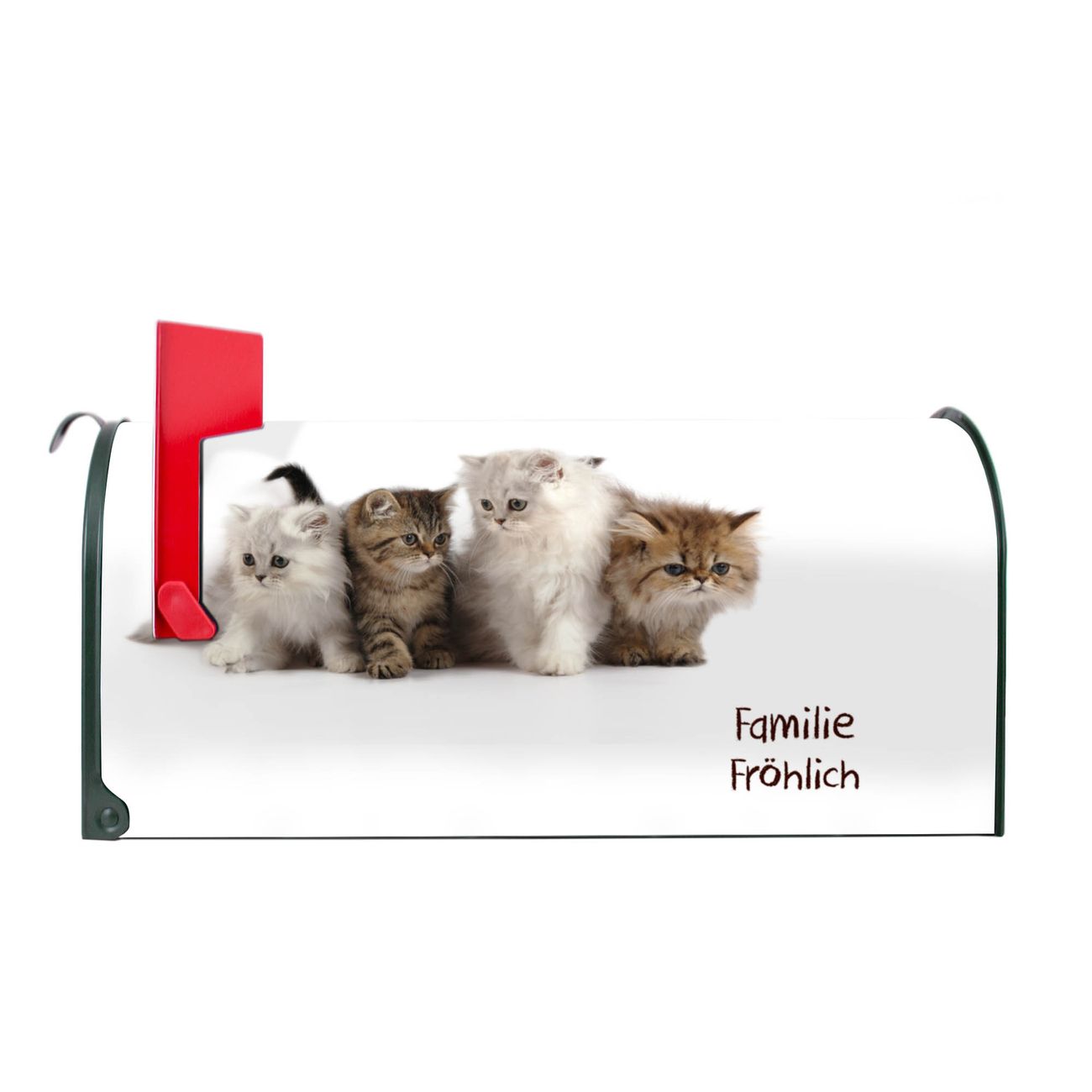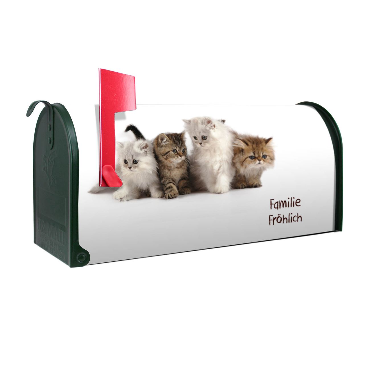 Unser amerikanischer Briefkasten mit dem Motiv Kaetzchen hat ein sehr ansprechendes und ausgefallenes Design, ist in der Grundfarbe weiß, grün oder schwarz erhältlich. Damit entlocken Sie Ihren Nachbarn und dem Postboten immer wieder ein Lächeln. Die Mailbox ist ein Original Import aus Mississippi USA und wird von unserer kleinen Manufaktur in Sachsen von Hand veredelt. Die US-Mailbox bietet ausreichend Platz auch für große Sendungen, eine Fahne die Ihnen Post anzeigt, wetterfestes und äußerst stabiles Material - so macht Post empfangen Freude.