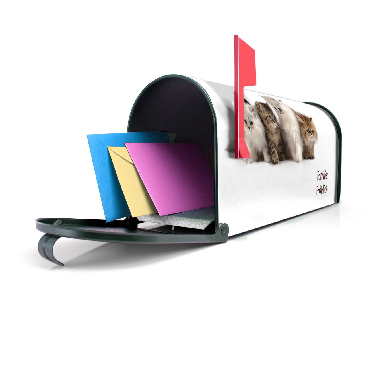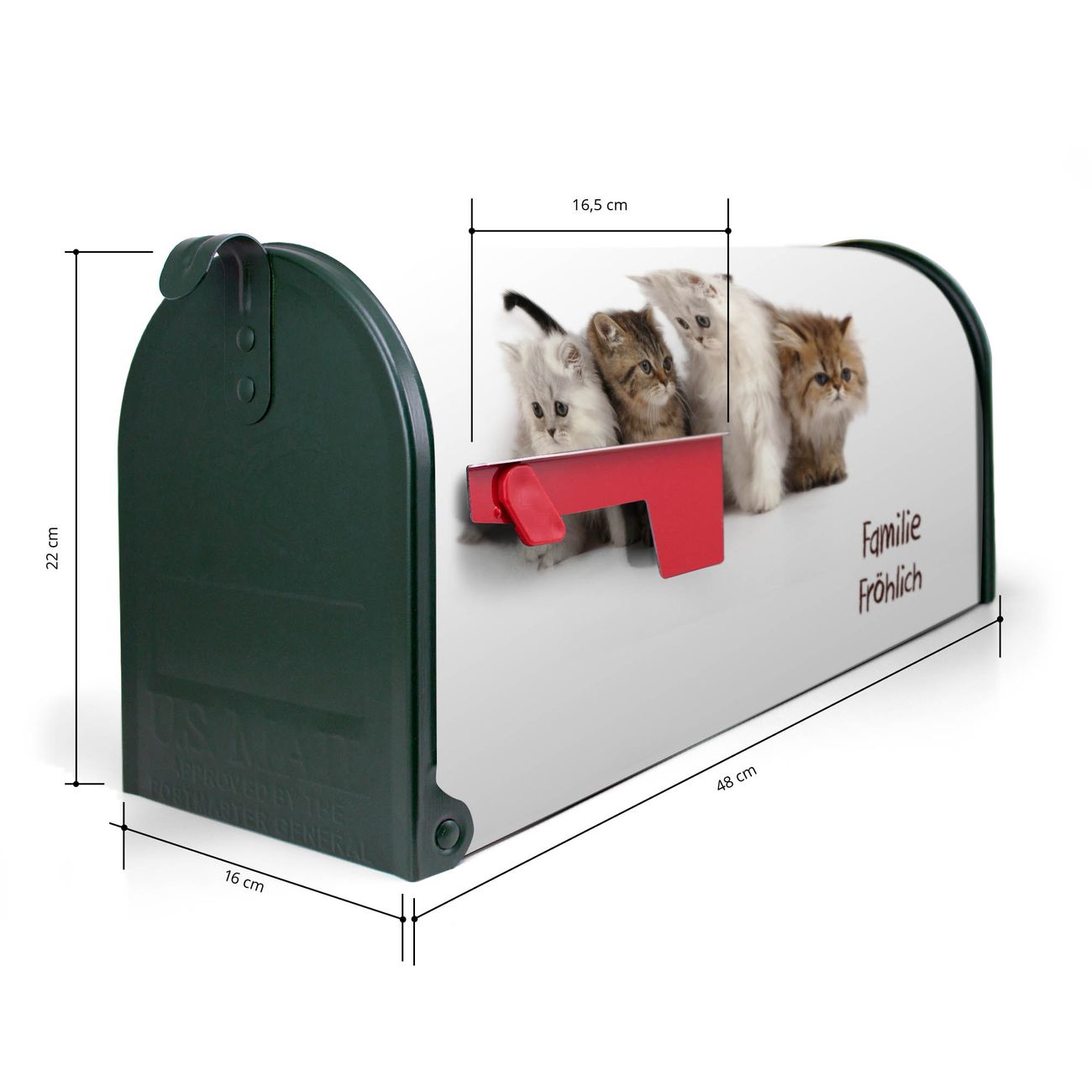 Der amerikanische Briefkasten von banjado mit Kaetzchen Motiv bietet Ihnen ausreichend Fassungsvermögen, um große A4 Sendungen und Zeitschriften zu empfangen. Die typisch amerikanische rote Fahne zeigt Ihnen an, wenn Sie Post erhalten haben. Die US-Mailbox besteht aus verzinktem Stahlblech welches lackiert wurde und ist 48 x 22 x 16 CM (BxHxT) groß. Die Folie mit Motiv Kaetzchen besteht aus einer wetter- und UV-resistenten Folie, die mit einem Schutzlaminat überzogen ist, sodass die US Mailbox zusätzlich vor Kratzern geschützt ist. An der Unterkante sind 4 Löcher je Seite um die Mailbox, typisch amerikanisch, an einem Holzpfahl oder einem Zaun zu befestigen. Auf Wunsch können Sie bei uns den passenden Standfuß oder die passende Wandhalterung kaufen um die US-Mailbox sicher zu befestigen. Wir bieten Ihnen ebenfalls Namensschilder, bereits beschriftet oder frei zu beschriften, und verschiedene selbst gestaltete Bitte-Keine-Werbung-Aufkleber.