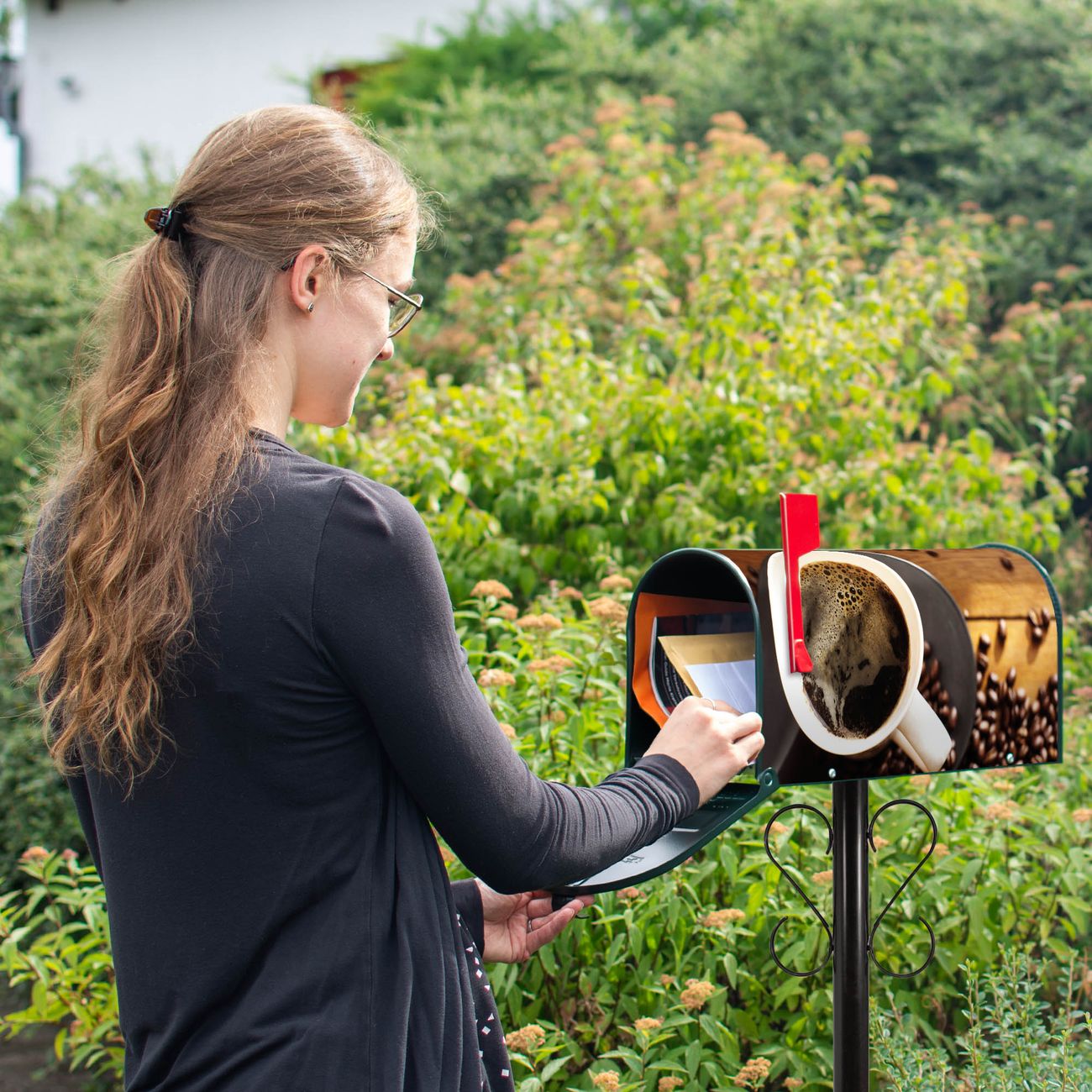 Der amerikanische Briefkasten von banjado mit Kaffee&Schokolade Motiv bietet Ihnen ausreichend Fassungsvermögen, um große A4 Sendungen und Zeitschriften zu empfangen. Die typisch amerikanische rote Fahne zeigt Ihnen an, wenn Sie Post erhalten haben. Die US-Mailbox besteht aus verzinktem Stahlblech welches lackiert wurde und ist 48 x 22 x 16 CM (BxHxT) groß. Die Folie mit Motiv Kaffee&Schokolade besteht aus einer wetter- und UV-resistenten Folie, die mit einem Schutzlaminat überzogen ist, sodass die US Mailbox zusätzlich vor Kratzern geschützt ist. An der Unterkante sind 4 Löcher je Seite um die Mailbox, typisch amerikanisch, an einem Holzpfahl oder einem Zaun zu befestigen. Auf Wunsch können Sie bei uns den passenden Standfuß oder die passende Wandhalterung kaufen um die US-Mailbox sicher zu befestigen. Wir bieten Ihnen ebenfalls Namensschilder, bereits beschriftet oder frei zu beschriften, und verschiedene selbst gestaltete Bitte-Keine-Werbung-Aufkleber.