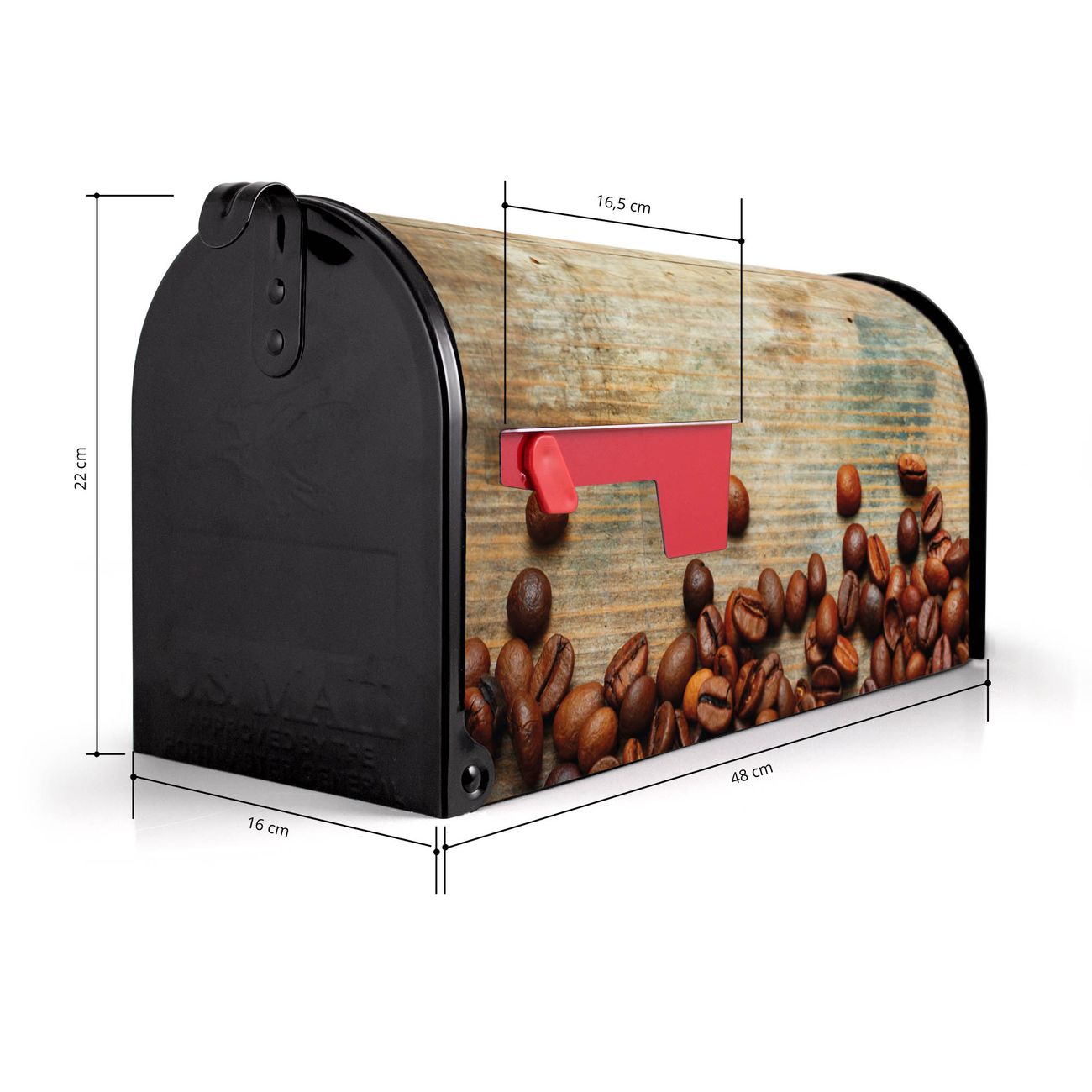 Der amerikanische Briefkasten von banjado mit Kaffeebohnen Motiv bietet Ihnen ausreichend Fassungsvermögen, um große A4 Sendungen und Zeitschriften zu empfangen. Die typisch amerikanische rote Fahne zeigt Ihnen an, wenn Sie Post erhalten haben. Die US-Mailbox besteht aus verzinktem Stahlblech welches lackiert wurde und ist 48 x 22 x 16 CM (BxHxT) groß. Die Folie mit Motiv Kaffeebohnen besteht aus einer wetter- und UV-resistenten Folie, die mit einem Schutzlaminat überzogen ist, sodass die US Mailbox zusätzlich vor Kratzern geschützt ist. An der Unterkante sind 4 Löcher je Seite um die Mailbox, typisch amerikanisch, an einem Holzpfahl oder einem Zaun zu befestigen. Auf Wunsch können Sie bei uns den passenden Standfuß oder die passende Wandhalterung kaufen um die US-Mailbox sicher zu befestigen. Wir bieten Ihnen ebenfalls Namensschilder, bereits beschriftet oder frei zu beschriften, und verschiedene selbst gestaltete Bitte-Keine-Werbung-Aufkleber.