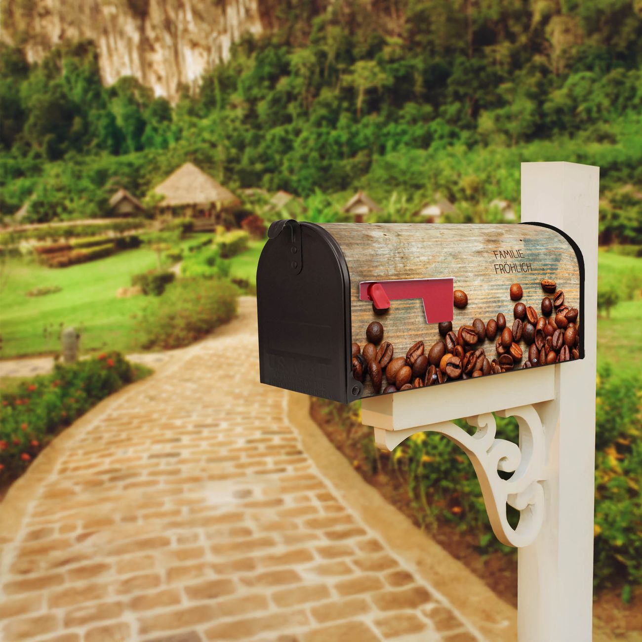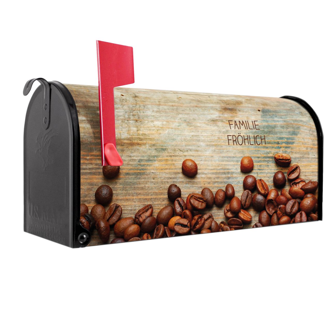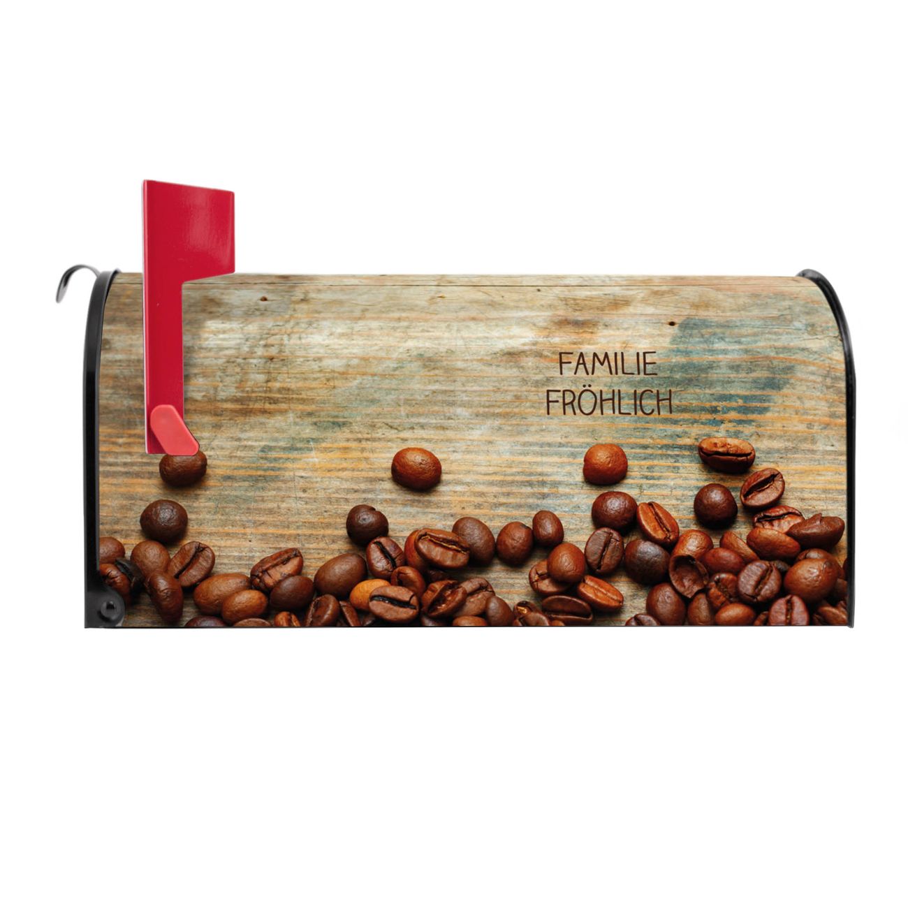 Der amerikanische Briefkasten von banjado mit Kaffeebohnen Motiv bietet Ihnen ausreichend Fassungsvermögen, um große A4 Sendungen und Zeitschriften zu empfangen. Die typisch amerikanische rote Fahne zeigt Ihnen an, wenn Sie Post erhalten haben. Die US-Mailbox besteht aus verzinktem Stahlblech welches lackiert wurde und ist 48 x 22 x 16 CM (BxHxT) groß. Die Folie mit Motiv Kaffeebohnen besteht aus einer wetter- und UV-resistenten Folie, die mit einem Schutzlaminat überzogen ist, sodass die US Mailbox zusätzlich vor Kratzern geschützt ist. An der Unterkante sind 4 Löcher je Seite um die Mailbox, typisch amerikanisch, an einem Holzpfahl oder einem Zaun zu befestigen. Auf Wunsch können Sie bei uns den passenden Standfuß oder die passende Wandhalterung kaufen um die US-Mailbox sicher zu befestigen. Wir bieten Ihnen ebenfalls Namensschilder, bereits beschriftet oder frei zu beschriften, und verschiedene selbst gestaltete Bitte-Keine-Werbung-Aufkleber.