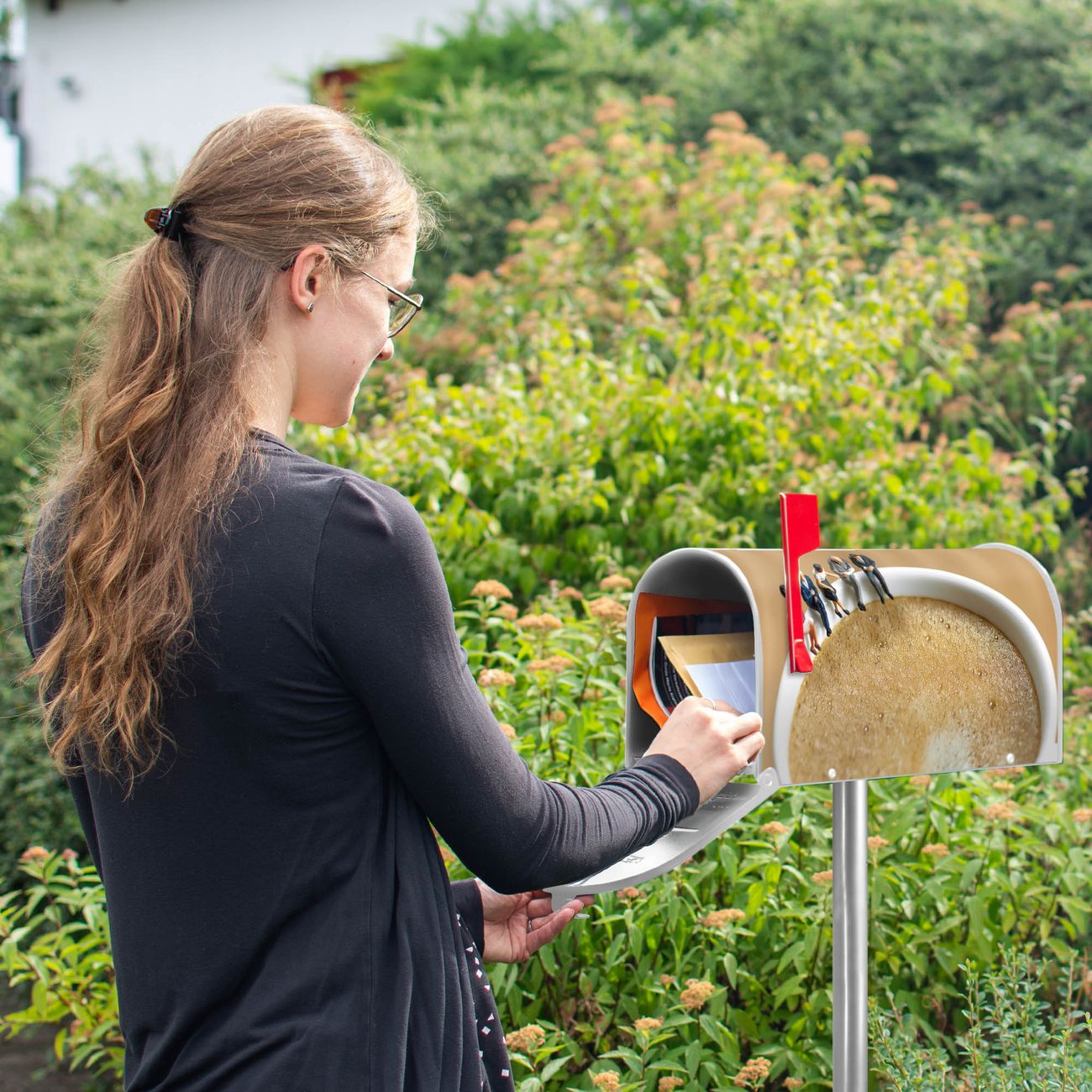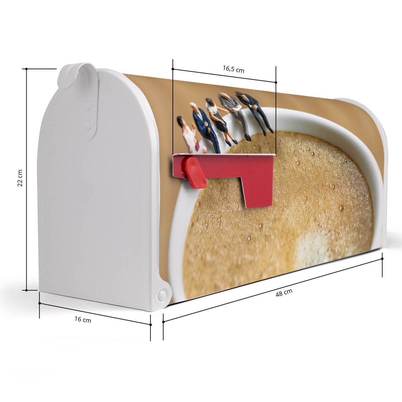 Der amerikanische Briefkasten von banjado mit Kaffeepause Motiv bietet Ihnen ausreichend Fassungsvermögen, um große A4 Sendungen und Zeitschriften zu empfangen. Die typisch amerikanische rote Fahne zeigt Ihnen an, wenn Sie Post erhalten haben. Die US-Mailbox besteht aus verzinktem Stahlblech welches lackiert wurde und ist 48 x 22 x 16 CM (BxHxT) groß. Die Folie mit Motiv Kaffeepause besteht aus einer wetter- und UV-resistenten Folie, die mit einem Schutzlaminat überzogen ist, sodass die US Mailbox zusätzlich vor Kratzern geschützt ist. An der Unterkante sind 4 Löcher je Seite um die Mailbox, typisch amerikanisch, an einem Holzpfahl oder einem Zaun zu befestigen. Auf Wunsch können Sie bei uns den passenden Standfuß oder die passende Wandhalterung kaufen um die US-Mailbox sicher zu befestigen. Wir bieten Ihnen ebenfalls Namensschilder, bereits beschriftet oder frei zu beschriften, und verschiedene selbst gestaltete Bitte-Keine-Werbung-Aufkleber.