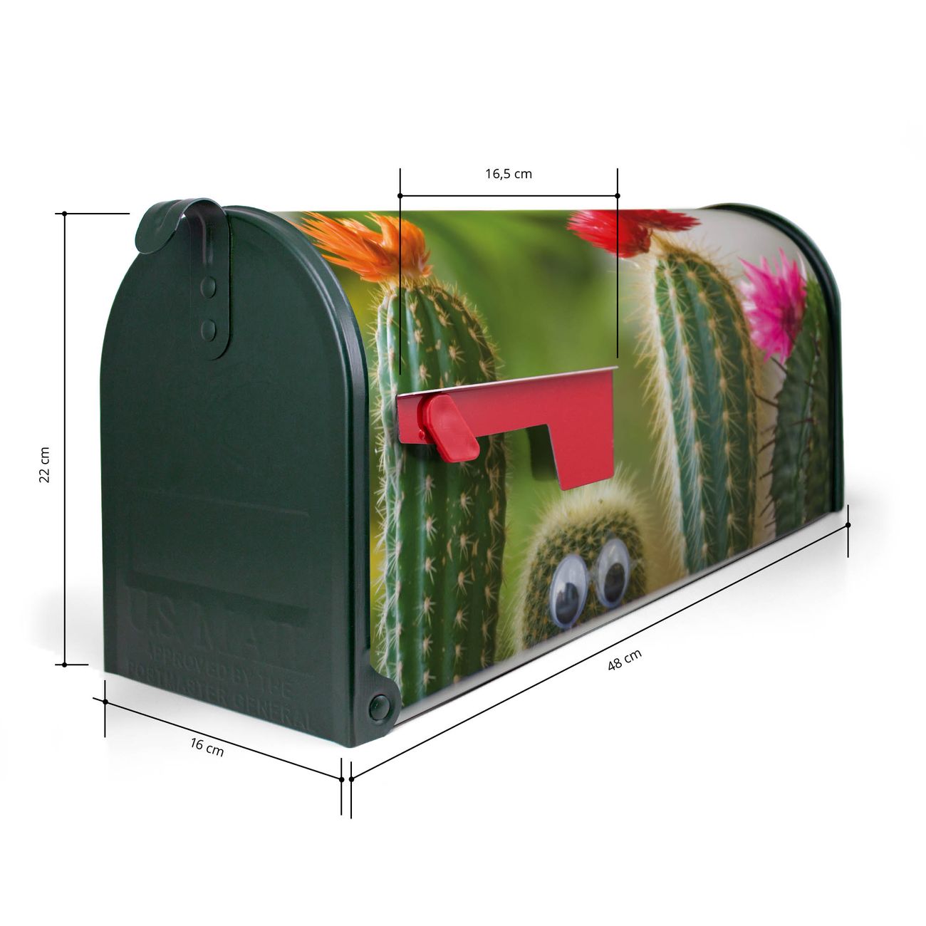 Der amerikanische Briefkasten von banjado mit Kakteen Motiv bietet Ihnen ausreichend Fassungsvermögen, um große A4 Sendungen und Zeitschriften zu empfangen. Die typisch amerikanische rote Fahne zeigt Ihnen an, wenn Sie Post erhalten haben. Die US-Mailbox besteht aus verzinktem Stahlblech welches lackiert wurde und ist 48 x 22 x 16 CM (BxHxT) groß. Die Folie mit Motiv Kakteen besteht aus einer wetter- und UV-resistenten Folie, die mit einem Schutzlaminat überzogen ist, sodass die US Mailbox zusätzlich vor Kratzern geschützt ist. An der Unterkante sind 4 Löcher je Seite um die Mailbox, typisch amerikanisch, an einem Holzpfahl oder einem Zaun zu befestigen. Auf Wunsch können Sie bei uns den passenden Standfuß oder die passende Wandhalterung kaufen um die US-Mailbox sicher zu befestigen. Wir bieten Ihnen ebenfalls Namensschilder, bereits beschriftet oder frei zu beschriften, und verschiedene selbst gestaltete Bitte-Keine-Werbung-Aufkleber.
