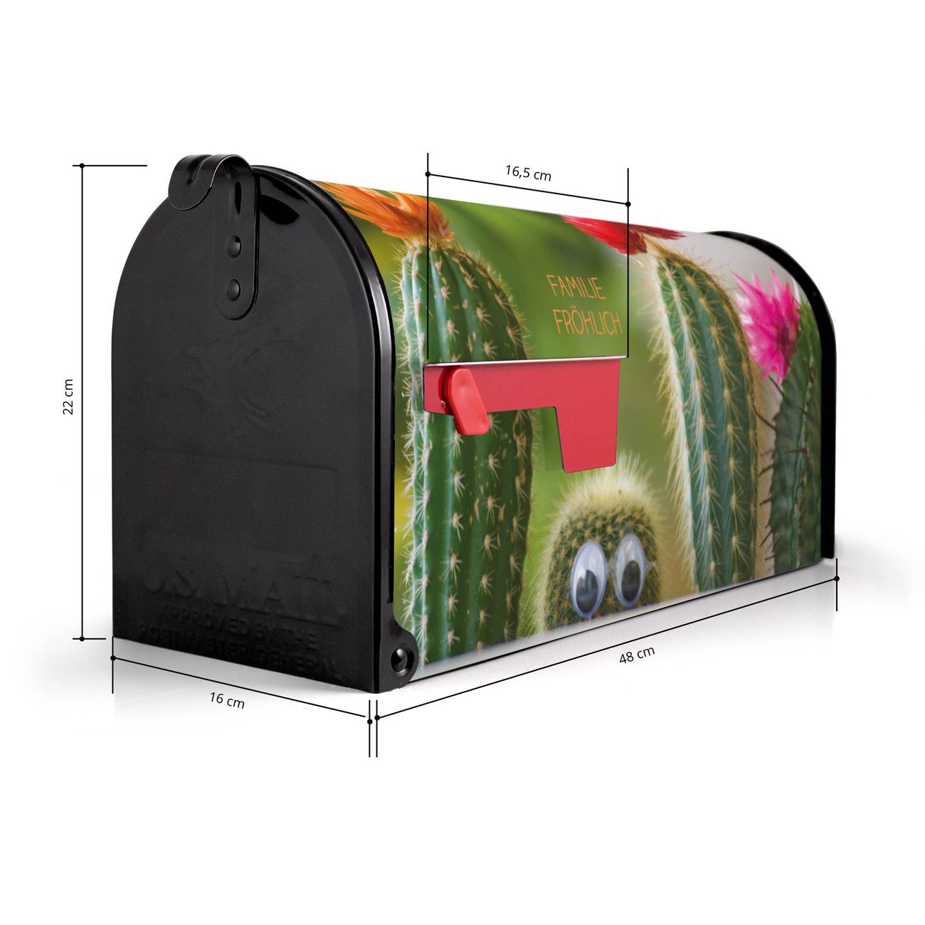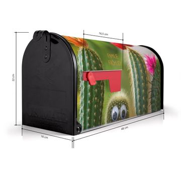 Der amerikanische Briefkasten von banjado mit Kakteen Motiv bietet Ihnen ausreichend Fassungsvermögen, um große A4 Sendungen und Zeitschriften zu empfangen. Die typisch amerikanische rote Fahne zeigt Ihnen an, wenn Sie Post erhalten haben. Die US-Mailbox besteht aus verzinktem Stahlblech welches lackiert wurde und ist 48 x 22 x 16 CM (BxHxT) groß. Die Folie mit Motiv Kakteen besteht aus einer wetter- und UV-resistenten Folie, die mit einem Schutzlaminat überzogen ist, sodass die US Mailbox zusätzlich vor Kratzern geschützt ist. An der Unterkante sind 4 Löcher je Seite um die Mailbox, typisch amerikanisch, an einem Holzpfahl oder einem Zaun zu befestigen. Auf Wunsch können Sie bei uns den passenden Standfuß oder die passende Wandhalterung kaufen um die US-Mailbox sicher zu befestigen. Wir bieten Ihnen ebenfalls Namensschilder, bereits beschriftet oder frei zu beschriften, und verschiedene selbst gestaltete Bitte-Keine-Werbung-Aufkleber.