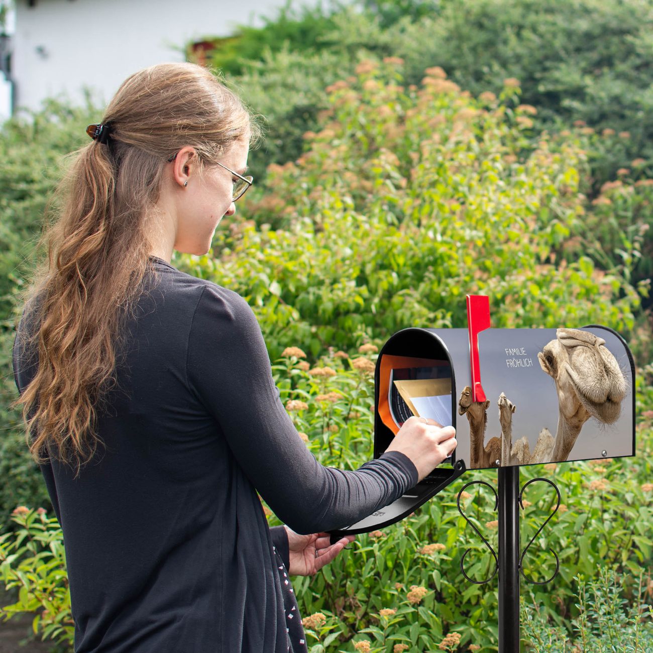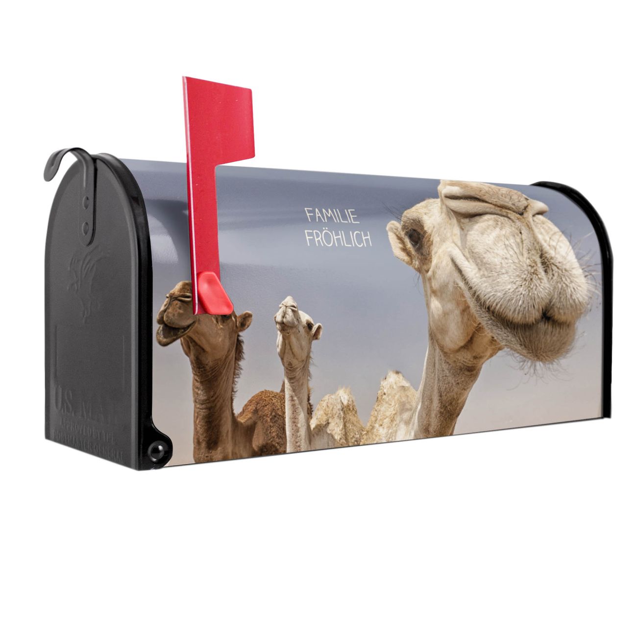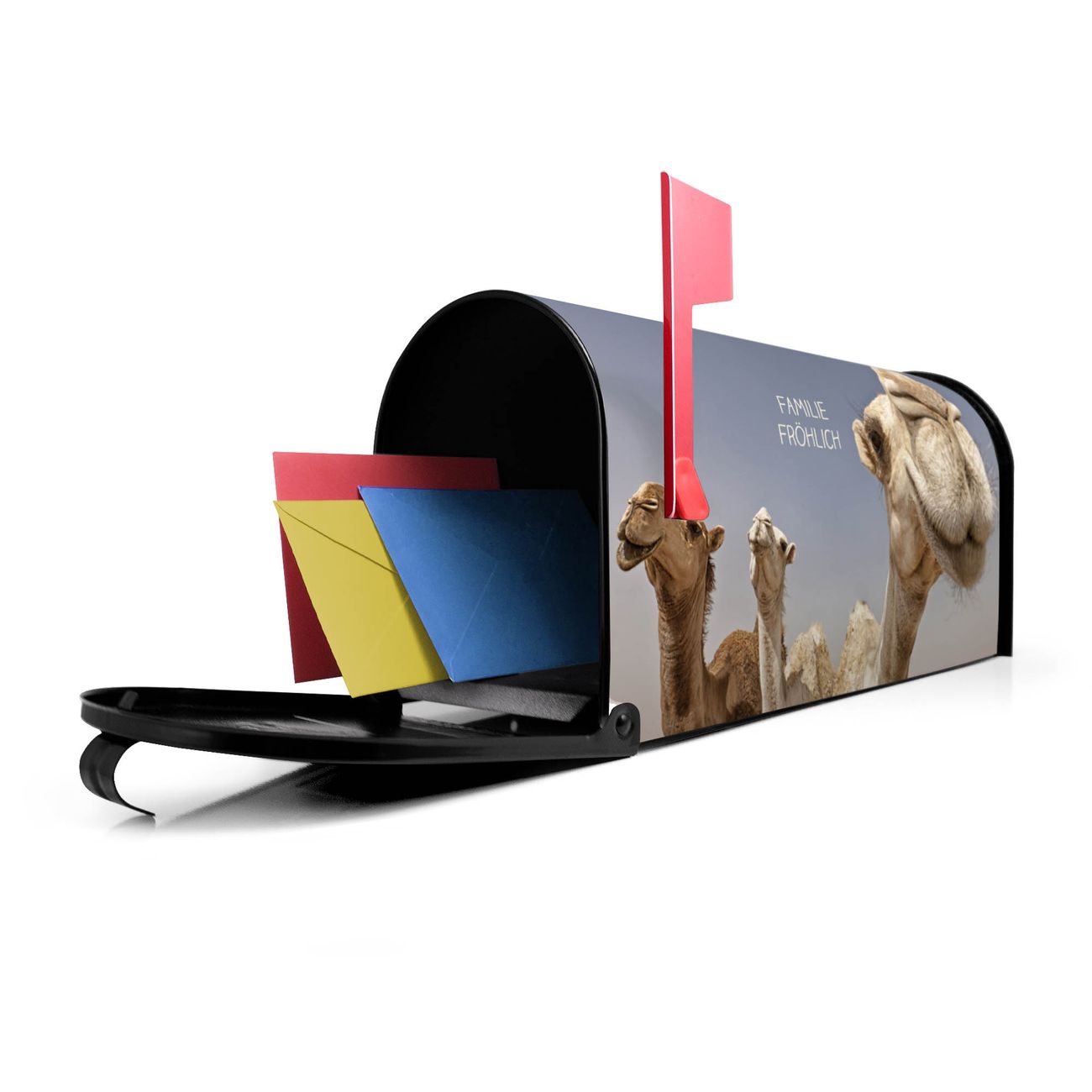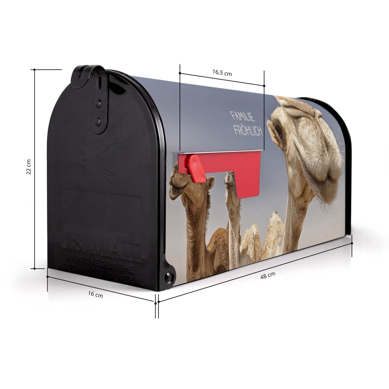 Der amerikanische Briefkasten von banjado mit Kamele Motiv bietet Ihnen ausreichend Fassungsvermögen, um große A4 Sendungen und Zeitschriften zu empfangen. Die typisch amerikanische rote Fahne zeigt Ihnen an, wenn Sie Post erhalten haben. Die US-Mailbox besteht aus verzinktem Stahlblech welches lackiert wurde und ist 48 x 22 x 16 CM (BxHxT) groß. Die Folie mit Motiv Kamele besteht aus einer wetter- und UV-resistenten Folie, die mit einem Schutzlaminat überzogen ist, sodass die US Mailbox zusätzlich vor Kratzern geschützt ist. An der Unterkante sind 4 Löcher je Seite um die Mailbox, typisch amerikanisch, an einem Holzpfahl oder einem Zaun zu befestigen. Auf Wunsch können Sie bei uns den passenden Standfuß oder die passende Wandhalterung kaufen um die US-Mailbox sicher zu befestigen. Wir bieten Ihnen ebenfalls Namensschilder, bereits beschriftet oder frei zu beschriften, und verschiedene selbst gestaltete Bitte-Keine-Werbung-Aufkleber.