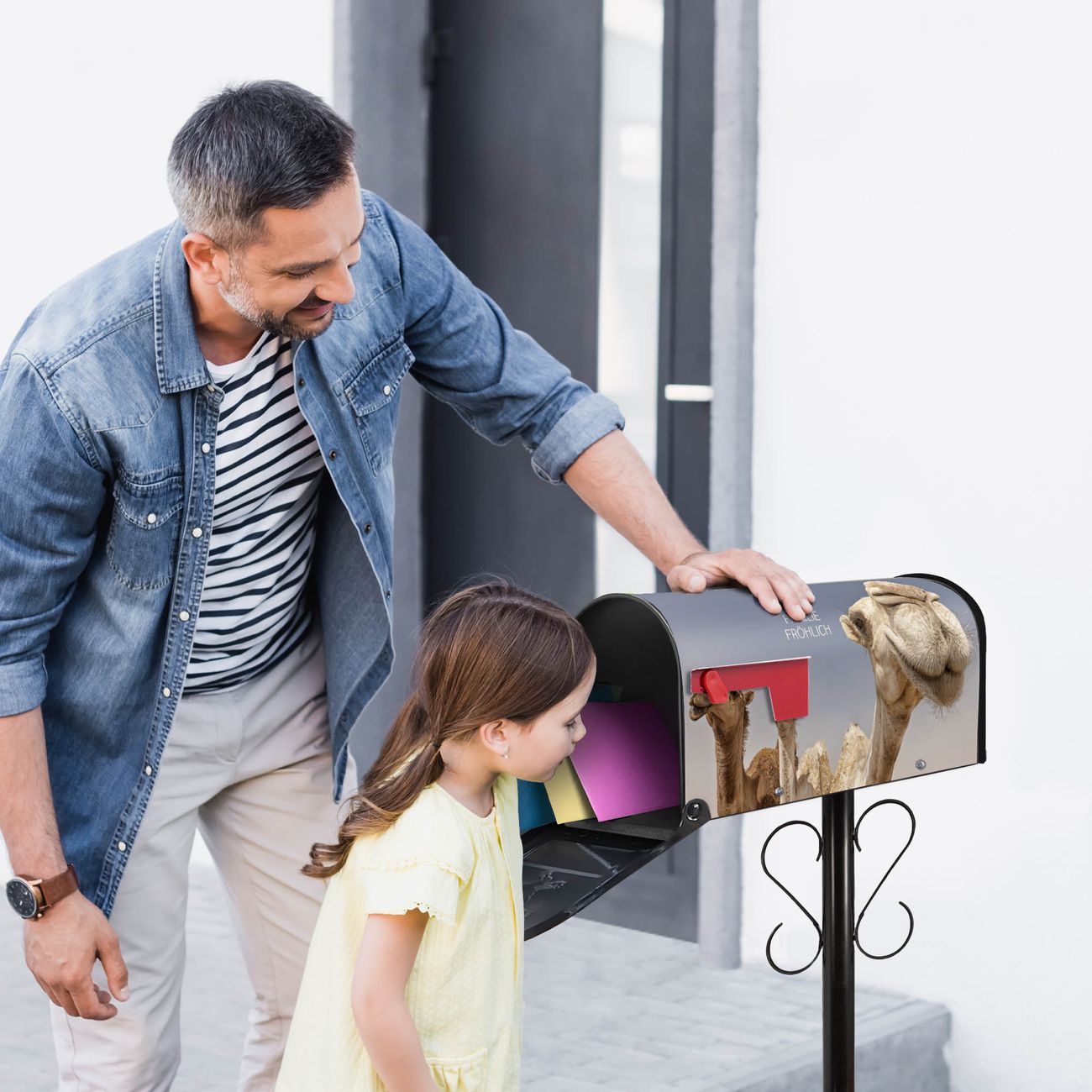 Unser amerikanischer Briefkasten mit dem Motiv Kamele hat ein sehr ansprechendes und ausgefallenes Design, ist in der Grundfarbe weiß, grün oder schwarz erhältlich. Damit entlocken Sie Ihren Nachbarn und dem Postboten immer wieder ein Lächeln. Die Mailbox ist ein Original Import aus Mississippi USA und wird von unserer kleinen Manufaktur in Sachsen von Hand veredelt. Die US-Mailbox bietet ausreichend Platz auch für große Sendungen, eine Fahne die Ihnen Post anzeigt, wetterfestes und äußerst stabiles Material - so macht Post empfangen Freude.