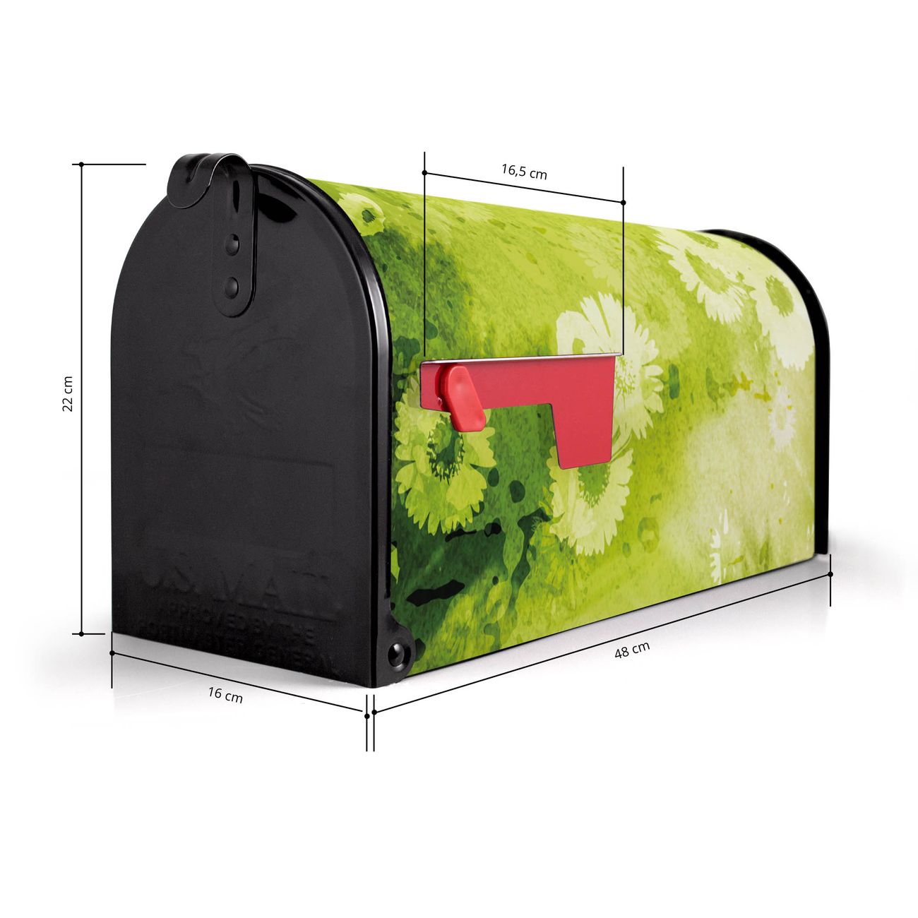 Der amerikanische Briefkasten von banjado mit Kamille Grün Motiv bietet Ihnen ausreichend Fassungsvermögen, um große A4 Sendungen und Zeitschriften zu empfangen. Die typisch amerikanische rote Fahne zeigt Ihnen an, wenn Sie Post erhalten haben. Die US-Mailbox besteht aus verzinktem Stahlblech welches lackiert wurde und ist 48 x 22 x 16 CM (BxHxT) groß. Die Folie mit Motiv Kamille Grün besteht aus einer wetter- und UV-resistenten Folie, die mit einem Schutzlaminat überzogen ist, sodass die US Mailbox zusätzlich vor Kratzern geschützt ist. An der Unterkante sind 4 Löcher je Seite um die Mailbox, typisch amerikanisch, an einem Holzpfahl oder einem Zaun zu befestigen. Auf Wunsch können Sie bei uns den passenden Standfuß oder die passende Wandhalterung kaufen um die US-Mailbox sicher zu befestigen. Wir bieten Ihnen ebenfalls Namensschilder, bereits beschriftet oder frei zu beschriften, und verschiedene selbst gestaltete Bitte-Keine-Werbung-Aufkleber.