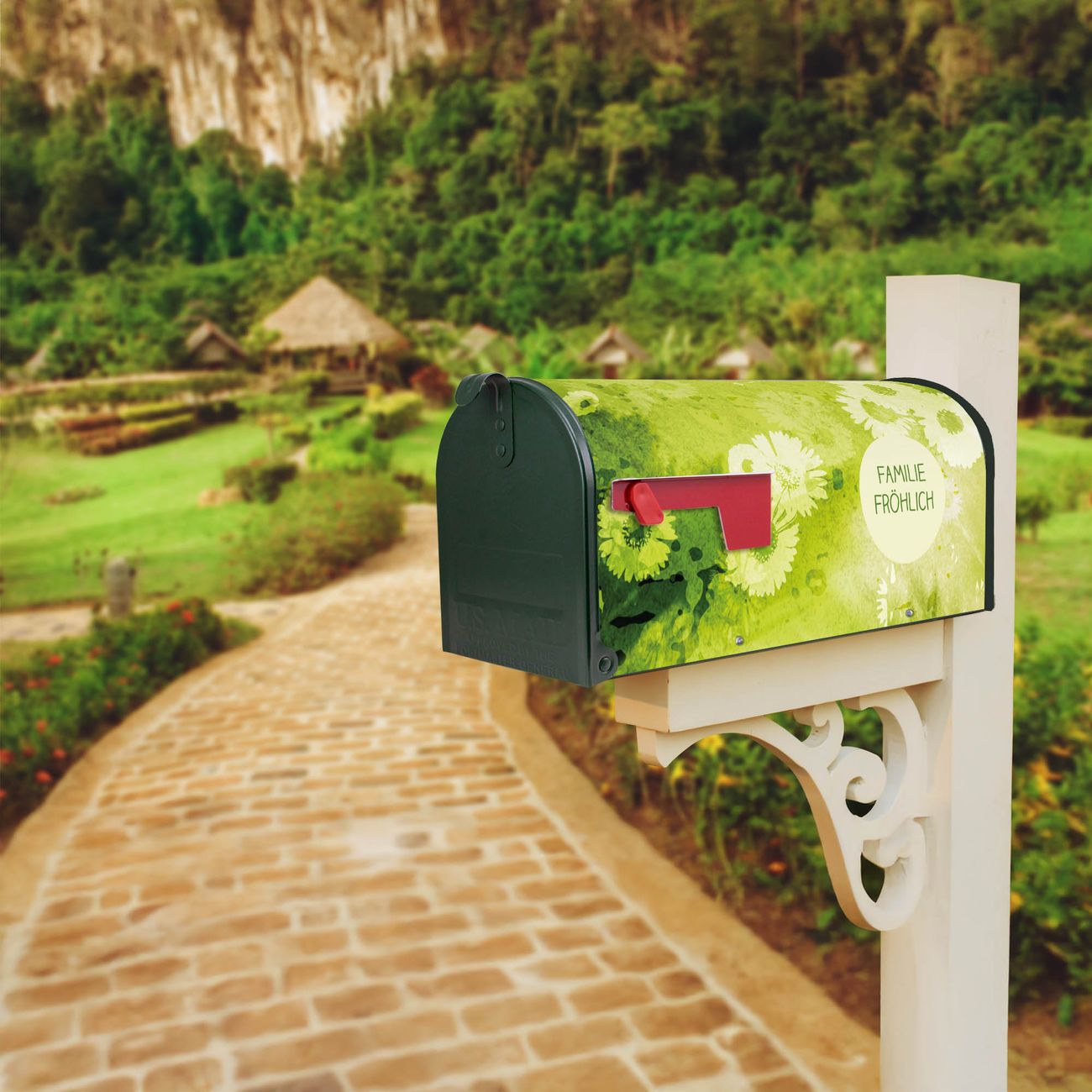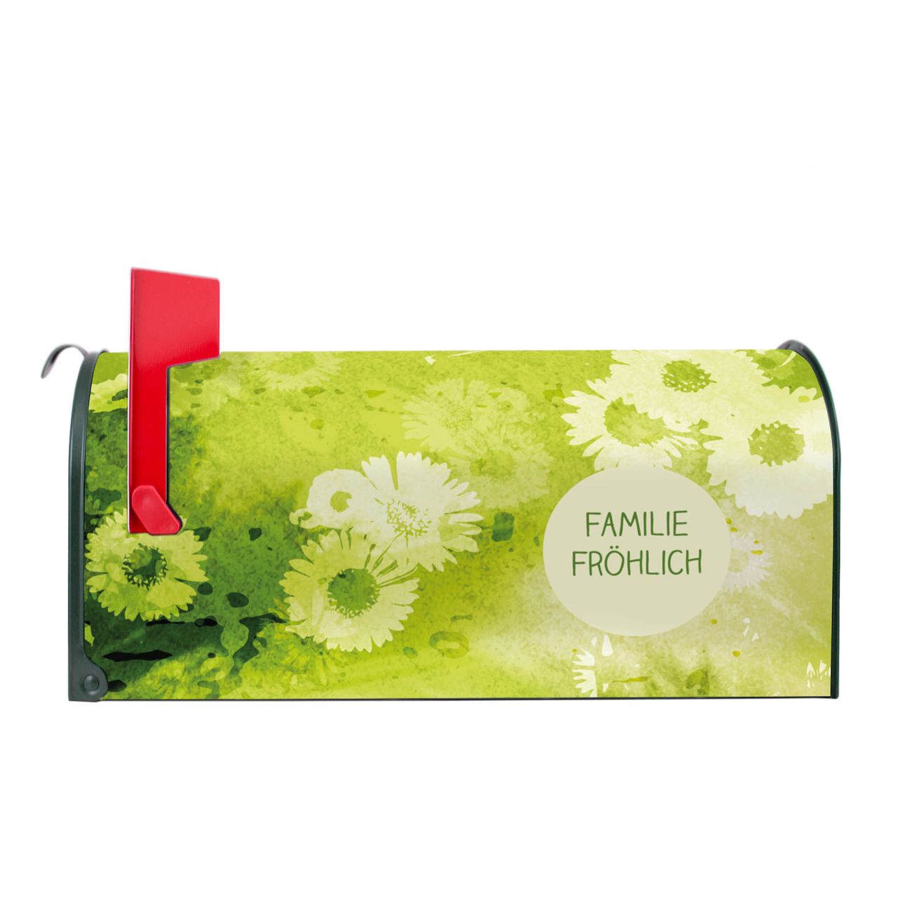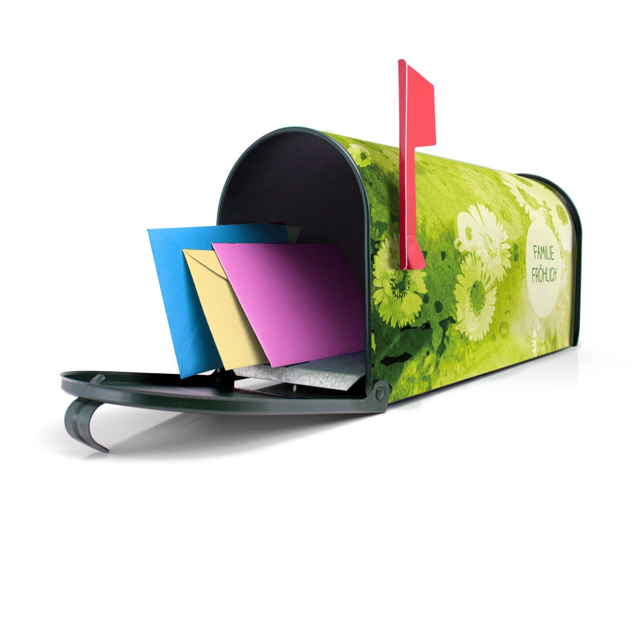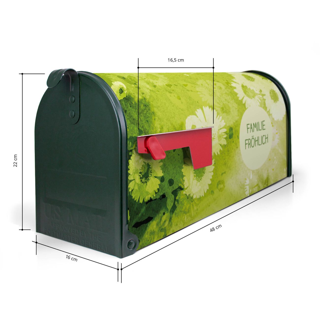 Der amerikanische Briefkasten von banjado mit WT Kamille Grün Motiv bietet Ihnen ausreichend Fassungsvermögen, um große A4 Sendungen und Zeitschriften zu empfangen. Die typisch amerikanische rote Fahne zeigt Ihnen an, wenn Sie Post erhalten haben. Die US-Mailbox besteht aus verzinktem Stahlblech welches lackiert wurde und ist 48 x 22 x 16 CM (BxHxT) groß. Die Folie mit Motiv WT Kamille Grün besteht aus einer wetter- und UV-resistenten Folie, die mit einem Schutzlaminat überzogen ist, sodass die US Mailbox zusätzlich vor Kratzern geschützt ist. An der Unterkante sind 4 Löcher je Seite um die Mailbox, typisch amerikanisch, an einem Holzpfahl oder einem Zaun zu befestigen. Auf Wunsch können Sie bei uns den passenden Standfuß oder die passende Wandhalterung kaufen um die US-Mailbox sicher zu befestigen. Wir bieten Ihnen ebenfalls Namensschilder, bereits beschriftet oder frei zu beschriften, und verschiedene selbst gestaltete Bitte-Keine-Werbung-Aufkleber.
