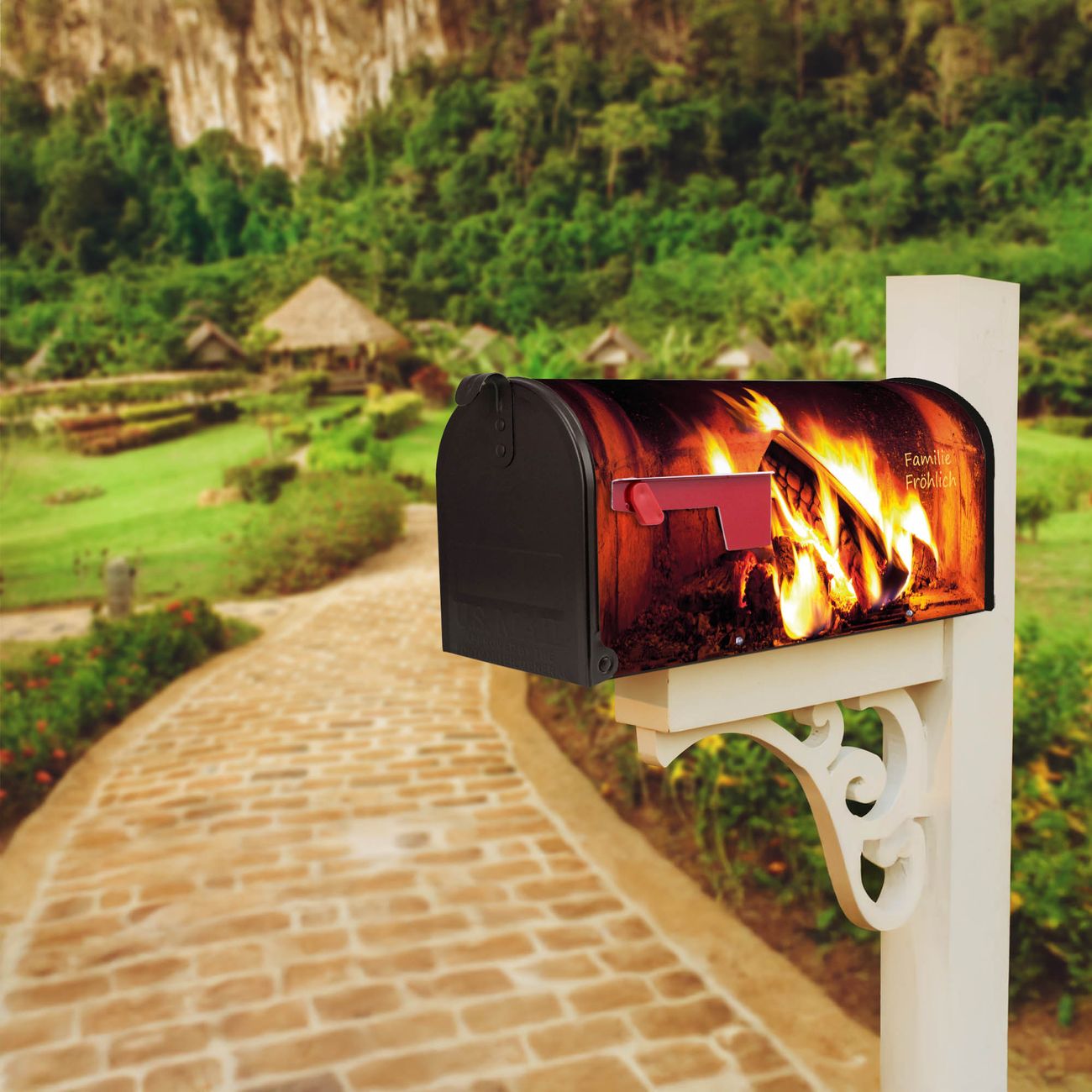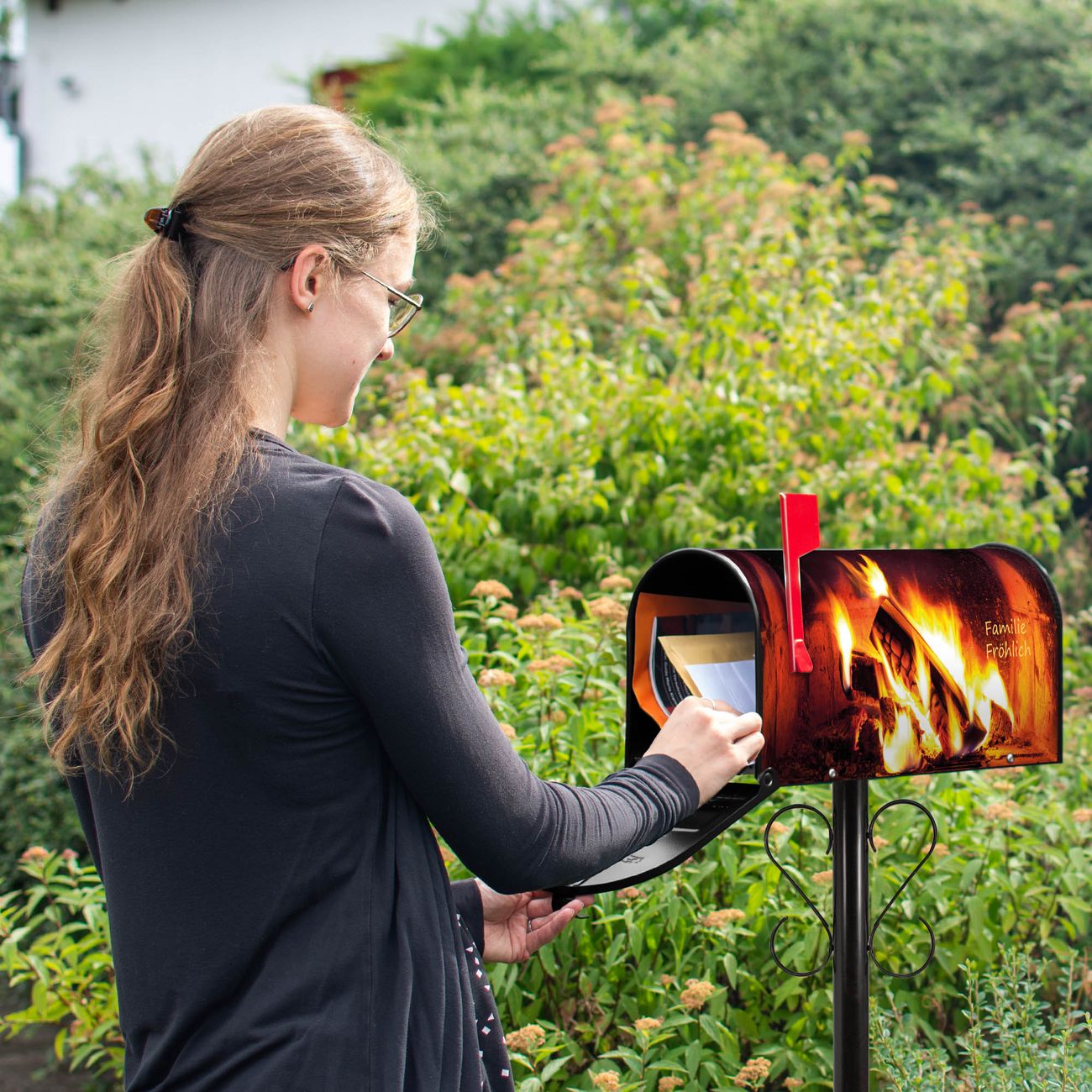Der amerikanische Briefkasten von banjado mit Kaminfeuer Motiv bietet Ihnen ausreichend Fassungsvermögen, um große A4 Sendungen und Zeitschriften zu empfangen. Die typisch amerikanische rote Fahne zeigt Ihnen an, wenn Sie Post erhalten haben. Die US-Mailbox besteht aus verzinktem Stahlblech welches lackiert wurde und ist 48 x 22 x 16 CM (BxHxT) groß. Die Folie mit Motiv Kaminfeuer besteht aus einer wetter- und UV-resistenten Folie, die mit einem Schutzlaminat überzogen ist, sodass die US Mailbox zusätzlich vor Kratzern geschützt ist. An der Unterkante sind 4 Löcher je Seite um die Mailbox, typisch amerikanisch, an einem Holzpfahl oder einem Zaun zu befestigen. Auf Wunsch können Sie bei uns den passenden Standfuß oder die passende Wandhalterung kaufen um die US-Mailbox sicher zu befestigen. Wir bieten Ihnen ebenfalls Namensschilder, bereits beschriftet oder frei zu beschriften, und verschiedene selbst gestaltete Bitte-Keine-Werbung-Aufkleber.