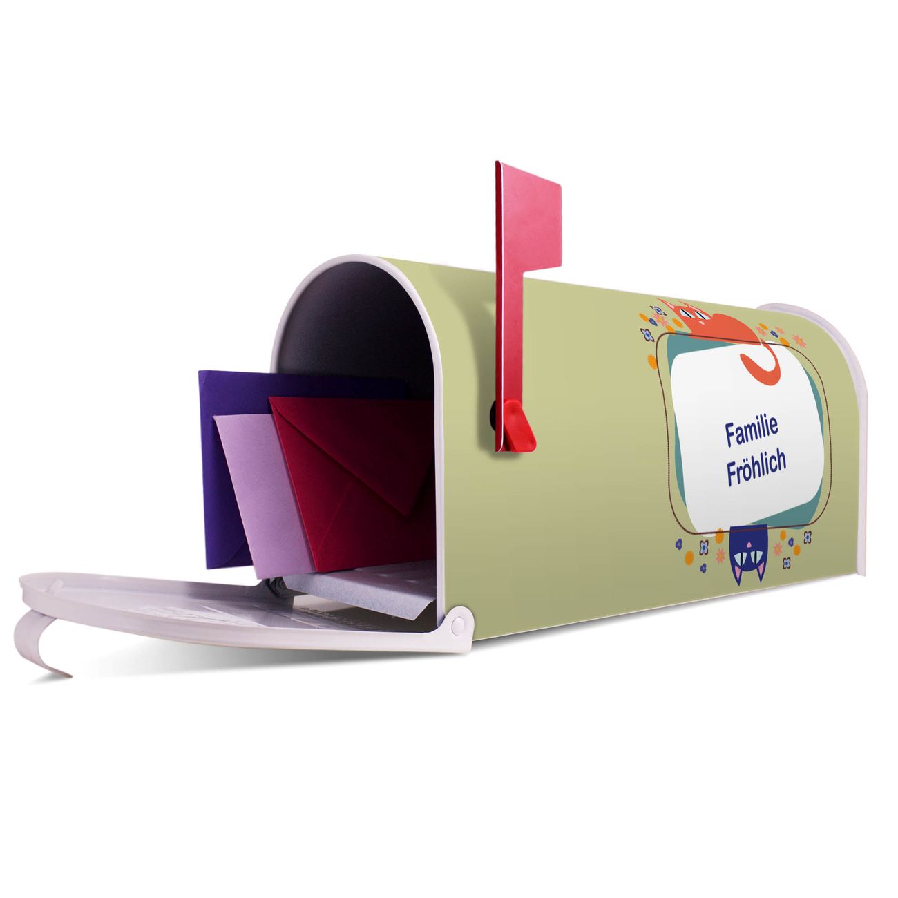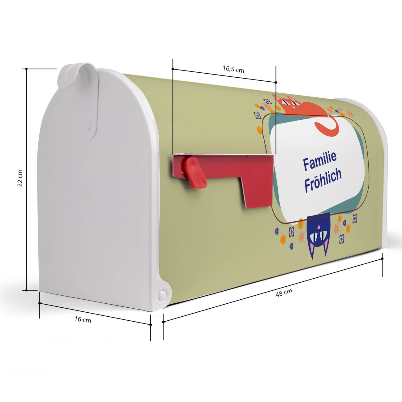 Der amerikanische Briefkasten von banjado mit WT Karikatur Katzen Motiv bietet Ihnen ausreichend Fassungsvermögen, um große A4 Sendungen und Zeitschriften zu empfangen. Die typisch amerikanische rote Fahne zeigt Ihnen an, wenn Sie Post erhalten haben. Die US-Mailbox besteht aus verzinktem Stahlblech welches lackiert wurde und ist 48 x 22 x 16 CM (BxHxT) groß. Die Folie mit Motiv WT Karikatur Katzen besteht aus einer wetter- und UV-resistenten Folie, die mit einem Schutzlaminat überzogen ist, sodass die US Mailbox zusätzlich vor Kratzern geschützt ist. An der Unterkante sind 4 Löcher je Seite um die Mailbox, typisch amerikanisch, an einem Holzpfahl oder einem Zaun zu befestigen. Auf Wunsch können Sie bei uns den passenden Standfuß oder die passende Wandhalterung kaufen um die US-Mailbox sicher zu befestigen. Wir bieten Ihnen ebenfalls Namensschilder, bereits beschriftet oder frei zu beschriften, und verschiedene selbst gestaltete Bitte-Keine-Werbung-Aufkleber.