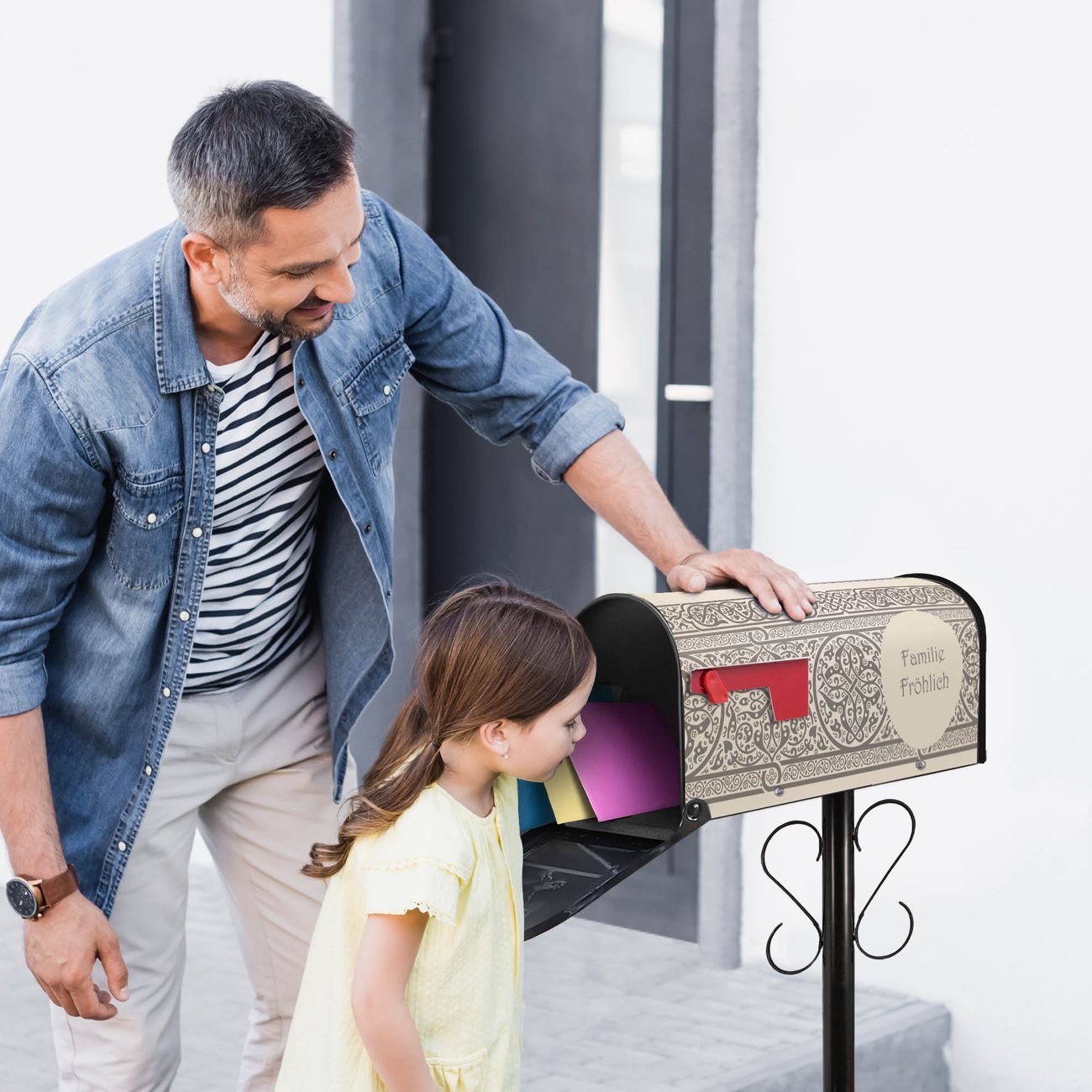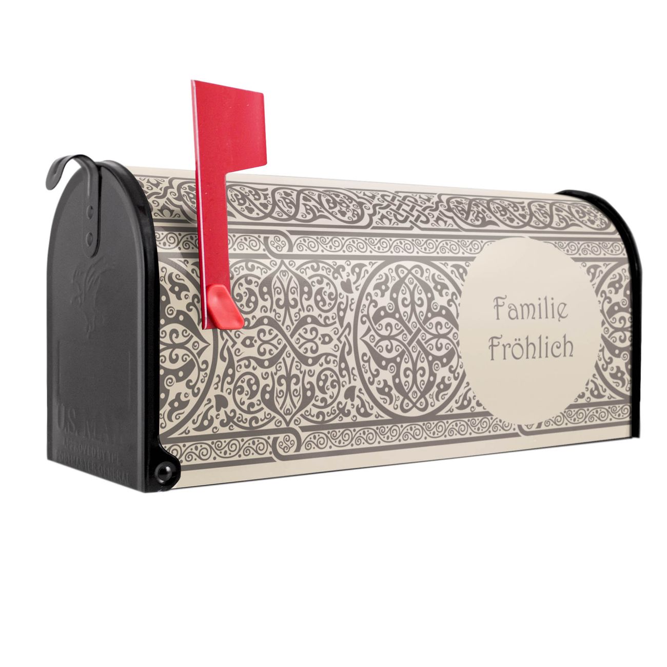 Der amerikanische Briefkasten von banjado mit Keltischer Knoten Motiv bietet Ihnen ausreichend Fassungsvermögen, um große A4 Sendungen und Zeitschriften zu empfangen. Die typisch amerikanische rote Fahne zeigt Ihnen an, wenn Sie Post erhalten haben. Die US-Mailbox besteht aus verzinktem Stahlblech welches lackiert wurde und ist 48 x 22 x 16 CM (BxHxT) groß. Die Folie mit Motiv Keltischer Knoten besteht aus einer wetter- und UV-resistenten Folie, die mit einem Schutzlaminat überzogen ist, sodass die US Mailbox zusätzlich vor Kratzern geschützt ist. An der Unterkante sind 4 Löcher je Seite um die Mailbox, typisch amerikanisch, an einem Holzpfahl oder einem Zaun zu befestigen. Auf Wunsch können Sie bei uns den passenden Standfuß oder die passende Wandhalterung kaufen um die US-Mailbox sicher zu befestigen. Wir bieten Ihnen ebenfalls Namensschilder, bereits beschriftet oder frei zu beschriften, und verschiedene selbst gestaltete Bitte-Keine-Werbung-Aufkleber.