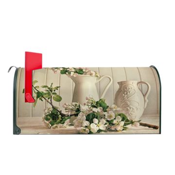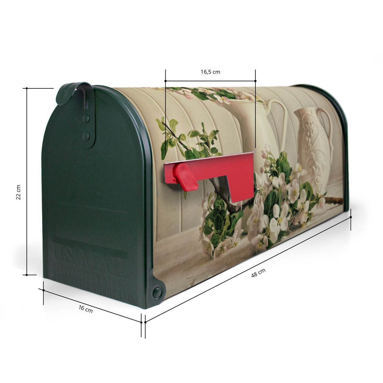 Der amerikanische Briefkasten von banjado mit Kirschzweige Motiv bietet Ihnen ausreichend Fassungsvermögen, um große A4 Sendungen und Zeitschriften zu empfangen. Die typisch amerikanische rote Fahne zeigt Ihnen an, wenn Sie Post erhalten haben. Die US-Mailbox besteht aus verzinktem Stahlblech welches lackiert wurde und ist 48 x 22 x 16 CM (BxHxT) groß. Die Folie mit Motiv Kirschzweige besteht aus einer wetter- und UV-resistenten Folie, die mit einem Schutzlaminat überzogen ist, sodass die US Mailbox zusätzlich vor Kratzern geschützt ist. An der Unterkante sind 4 Löcher je Seite um die Mailbox, typisch amerikanisch, an einem Holzpfahl oder einem Zaun zu befestigen. Auf Wunsch können Sie bei uns den passenden Standfuß oder die passende Wandhalterung kaufen um die US-Mailbox sicher zu befestigen. Wir bieten Ihnen ebenfalls Namensschilder, bereits beschriftet oder frei zu beschriften, und verschiedene selbst gestaltete Bitte-Keine-Werbung-Aufkleber.