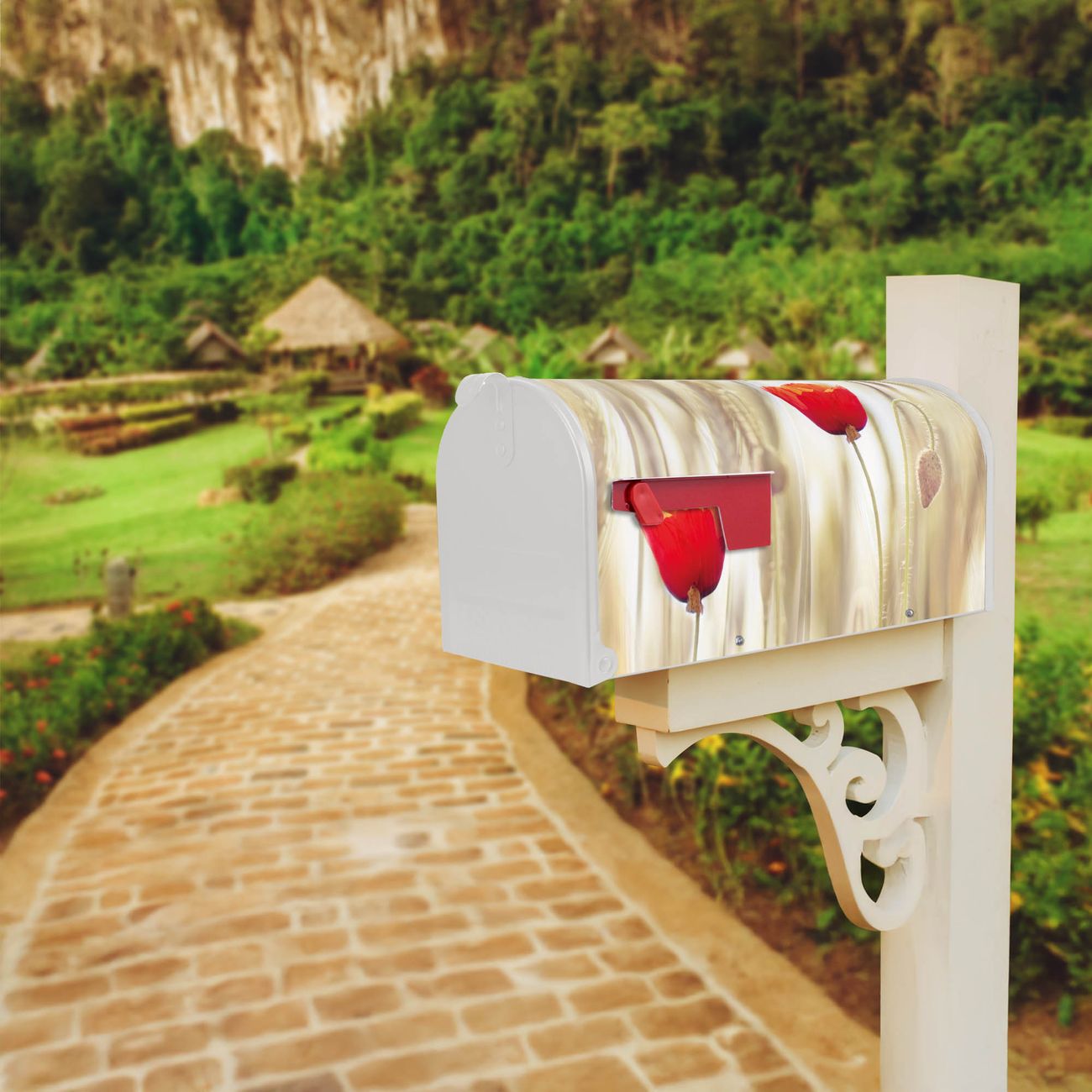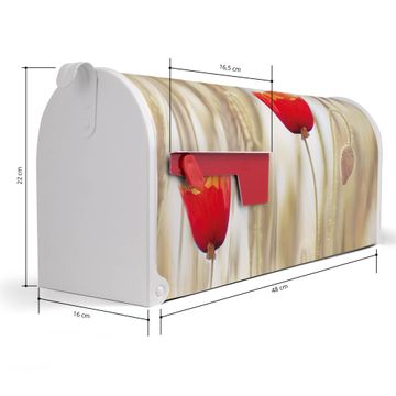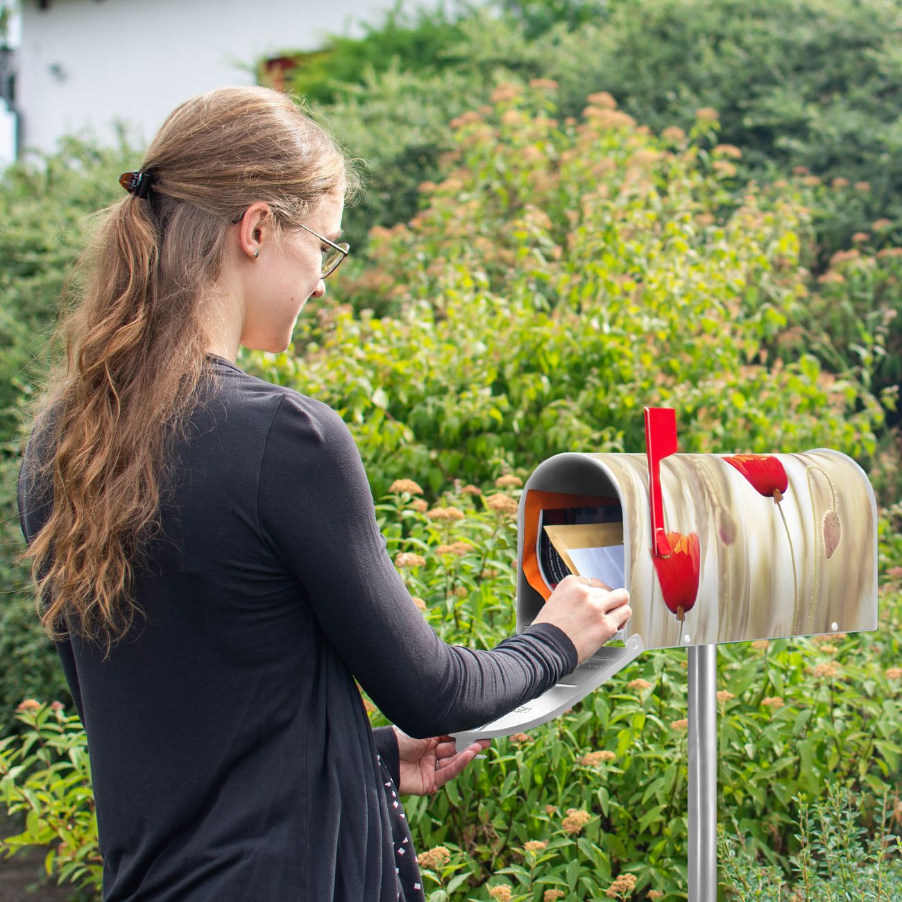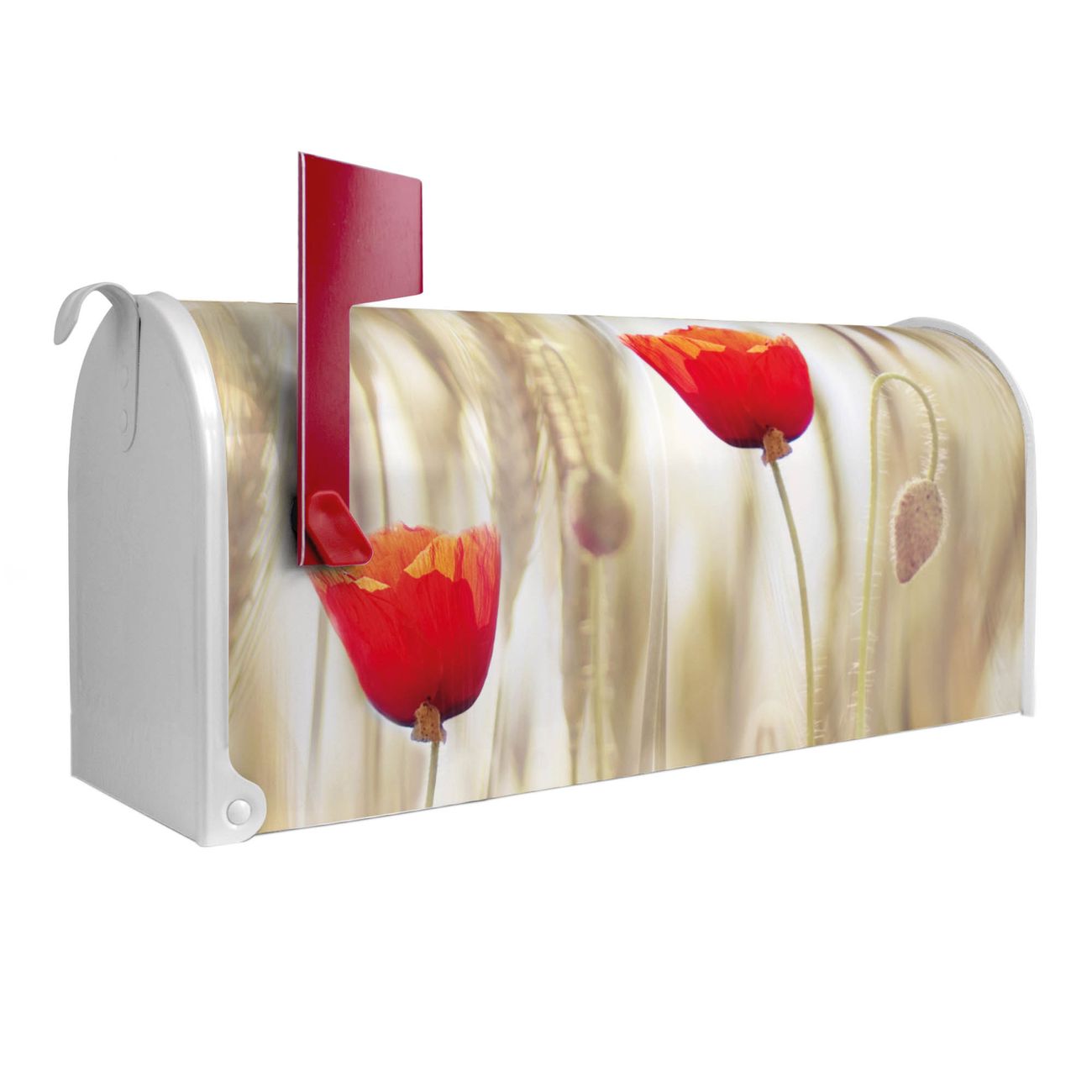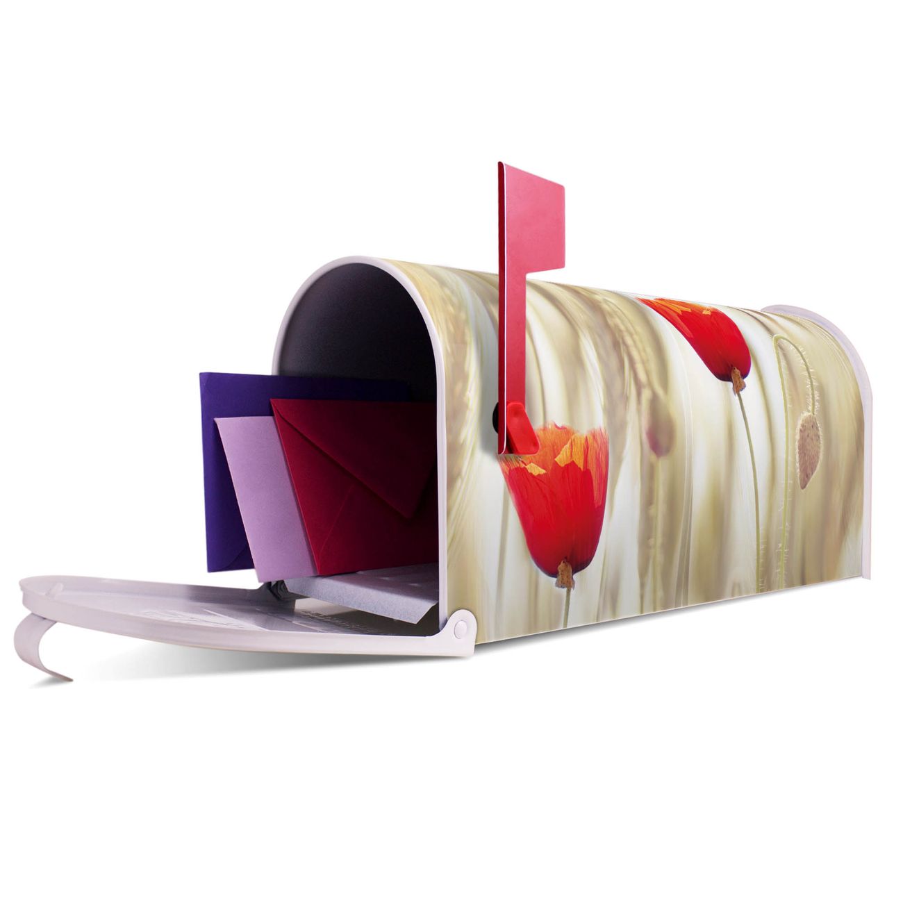 Der amerikanische Briefkasten von banjado mit Klatschmohn Motiv bietet Ihnen ausreichend Fassungsvermögen, um große A4 Sendungen und Zeitschriften zu empfangen. Die typisch amerikanische rote Fahne zeigt Ihnen an, wenn Sie Post erhalten haben. Die US-Mailbox besteht aus verzinktem Stahlblech welches lackiert wurde und ist 48 x 22 x 16 CM (BxHxT) groß. Die Folie mit Motiv Klatschmohn besteht aus einer wetter- und UV-resistenten Folie, die mit einem Schutzlaminat überzogen ist, sodass die US Mailbox zusätzlich vor Kratzern geschützt ist. An der Unterkante sind 4 Löcher je Seite um die Mailbox, typisch amerikanisch, an einem Holzpfahl oder einem Zaun zu befestigen. Auf Wunsch können Sie bei uns den passenden Standfuß oder die passende Wandhalterung kaufen um die US-Mailbox sicher zu befestigen. Wir bieten Ihnen ebenfalls Namensschilder, bereits beschriftet oder frei zu beschriften, und verschiedene selbst gestaltete Bitte-Keine-Werbung-Aufkleber.