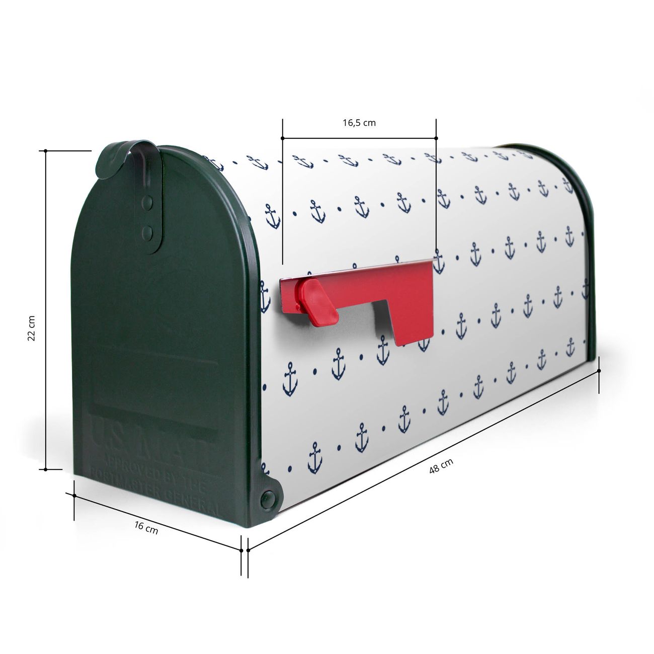 Der amerikanische Briefkasten von banjado mit Kleine Anker Motiv bietet Ihnen ausreichend Fassungsvermögen, um große A4 Sendungen und Zeitschriften zu empfangen. Die typisch amerikanische rote Fahne zeigt Ihnen an, wenn Sie Post erhalten haben. Die US-Mailbox besteht aus verzinktem Stahlblech welches lackiert wurde und ist 48 x 22 x 16 CM (BxHxT) groß. Die Folie mit Motiv Kleine Anker besteht aus einer wetter- und UV-resistenten Folie, die mit einem Schutzlaminat überzogen ist, sodass die US Mailbox zusätzlich vor Kratzern geschützt ist. An der Unterkante sind 4 Löcher je Seite um die Mailbox, typisch amerikanisch, an einem Holzpfahl oder einem Zaun zu befestigen. Auf Wunsch können Sie bei uns den passenden Standfuß oder die passende Wandhalterung kaufen um die US-Mailbox sicher zu befestigen. Wir bieten Ihnen ebenfalls Namensschilder, bereits beschriftet oder frei zu beschriften, und verschiedene selbst gestaltete Bitte-Keine-Werbung-Aufkleber.