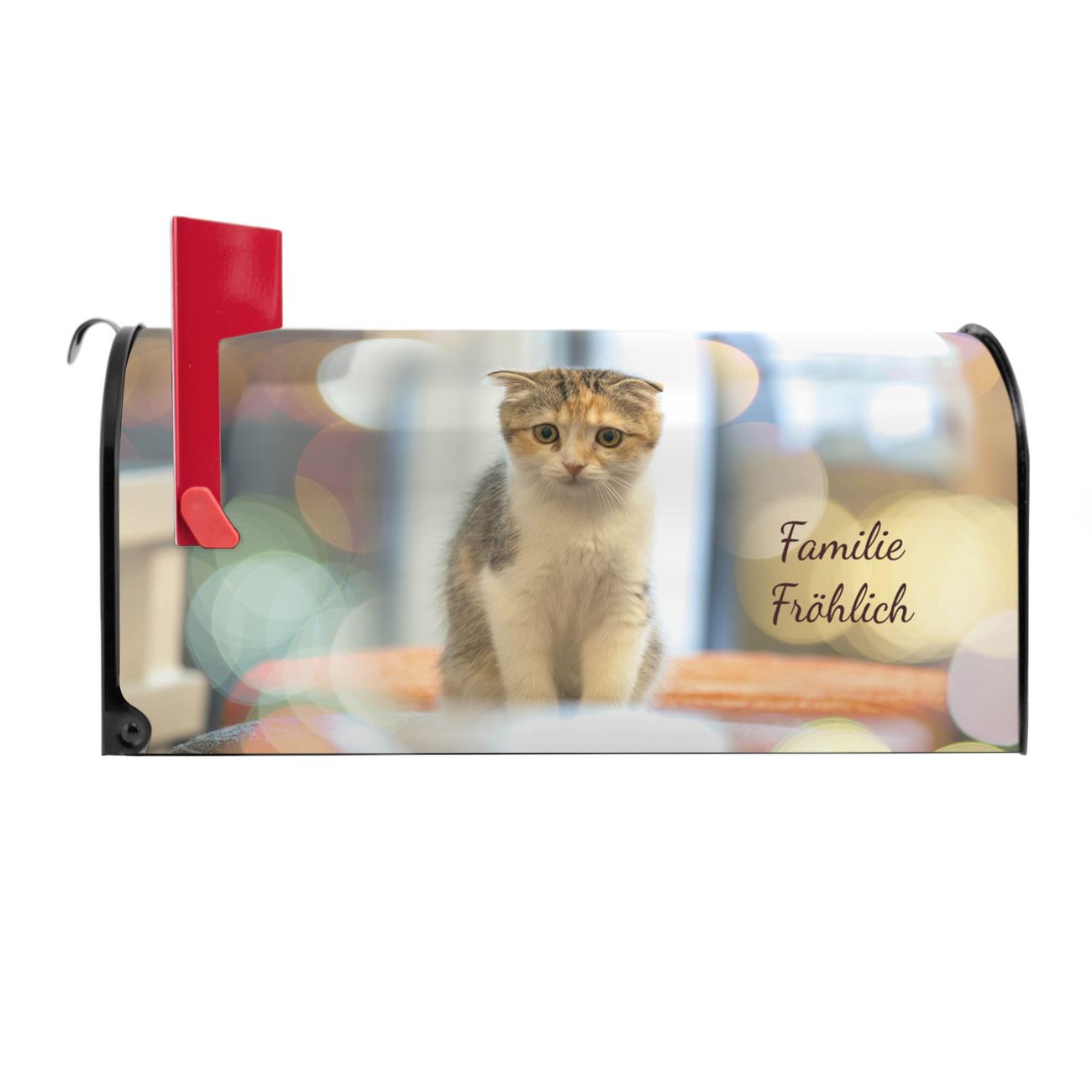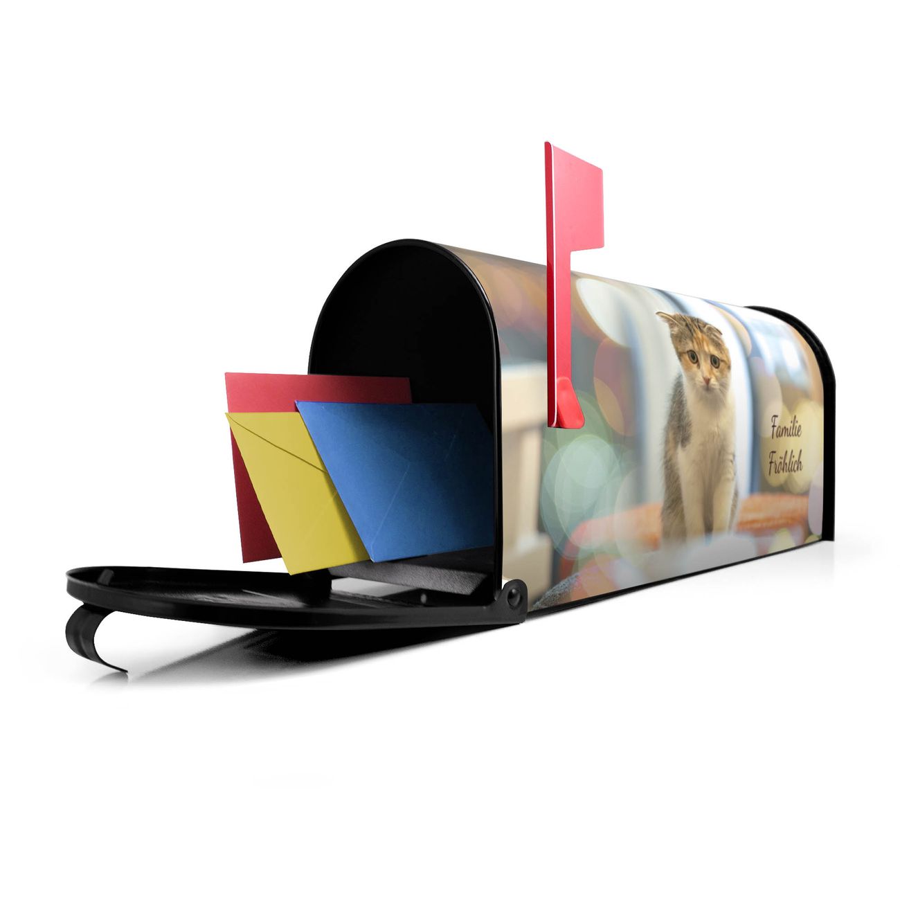 Der amerikanische Briefkasten von banjado mit Kleine Katze Motiv bietet Ihnen ausreichend Fassungsvermögen, um große A4 Sendungen und Zeitschriften zu empfangen. Die typisch amerikanische rote Fahne zeigt Ihnen an, wenn Sie Post erhalten haben. Die US-Mailbox besteht aus verzinktem Stahlblech welches lackiert wurde und ist 48 x 22 x 16 CM (BxHxT) groß. Die Folie mit Motiv Kleine Katze besteht aus einer wetter- und UV-resistenten Folie, die mit einem Schutzlaminat überzogen ist, sodass die US Mailbox zusätzlich vor Kratzern geschützt ist. An der Unterkante sind 4 Löcher je Seite um die Mailbox, typisch amerikanisch, an einem Holzpfahl oder einem Zaun zu befestigen. Auf Wunsch können Sie bei uns den passenden Standfuß oder die passende Wandhalterung kaufen um die US-Mailbox sicher zu befestigen. Wir bieten Ihnen ebenfalls Namensschilder, bereits beschriftet oder frei zu beschriften, und verschiedene selbst gestaltete Bitte-Keine-Werbung-Aufkleber.