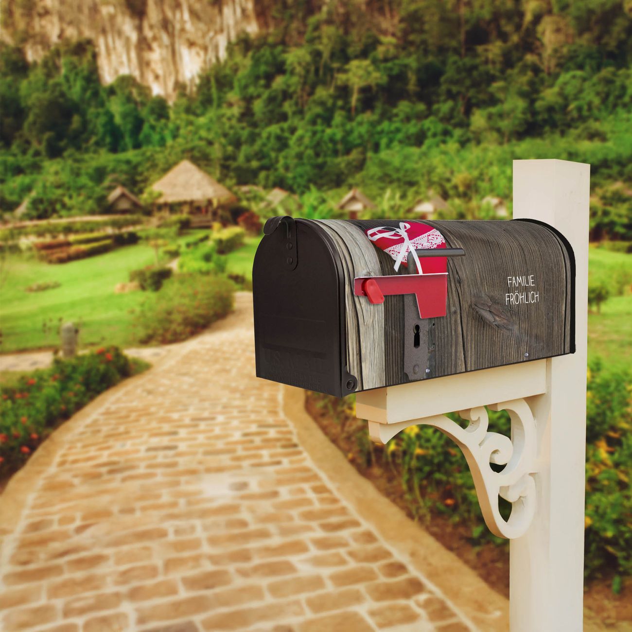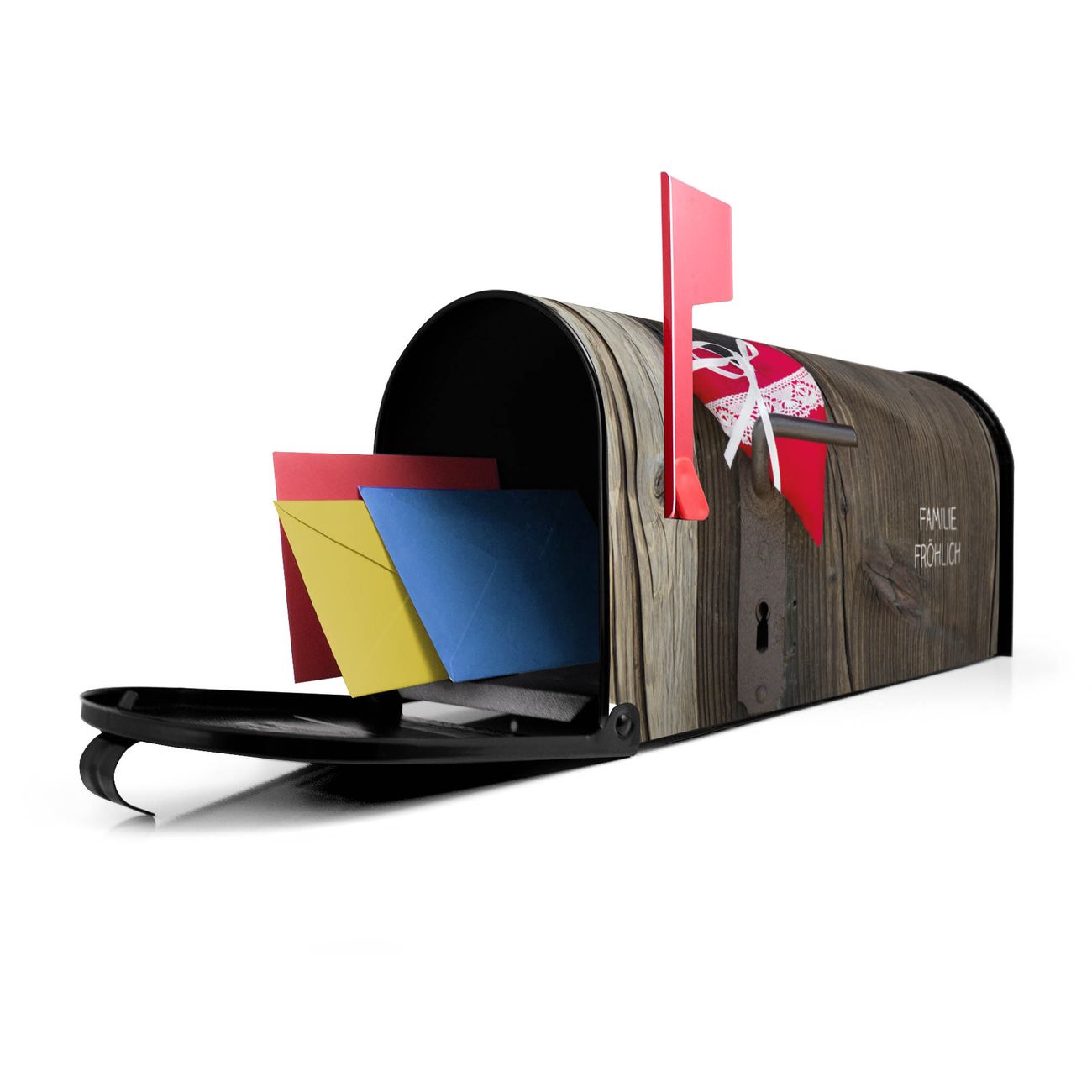 Der amerikanische Briefkasten von banjado mit Knock On Your Door Motiv bietet Ihnen ausreichend Fassungsvermögen, um große A4 Sendungen und Zeitschriften zu empfangen. Die typisch amerikanische rote Fahne zeigt Ihnen an, wenn Sie Post erhalten haben. Die US-Mailbox besteht aus verzinktem Stahlblech welches lackiert wurde und ist 48 x 22 x 16 CM (BxHxT) groß. Die Folie mit Motiv Knock On Your Door besteht aus einer wetter- und UV-resistenten Folie, die mit einem Schutzlaminat überzogen ist, sodass die US Mailbox zusätzlich vor Kratzern geschützt ist. An der Unterkante sind 4 Löcher je Seite um die Mailbox, typisch amerikanisch, an einem Holzpfahl oder einem Zaun zu befestigen. Auf Wunsch können Sie bei uns den passenden Standfuß oder die passende Wandhalterung kaufen um die US-Mailbox sicher zu befestigen. Wir bieten Ihnen ebenfalls Namensschilder, bereits beschriftet oder frei zu beschriften, und verschiedene selbst gestaltete Bitte-Keine-Werbung-Aufkleber.