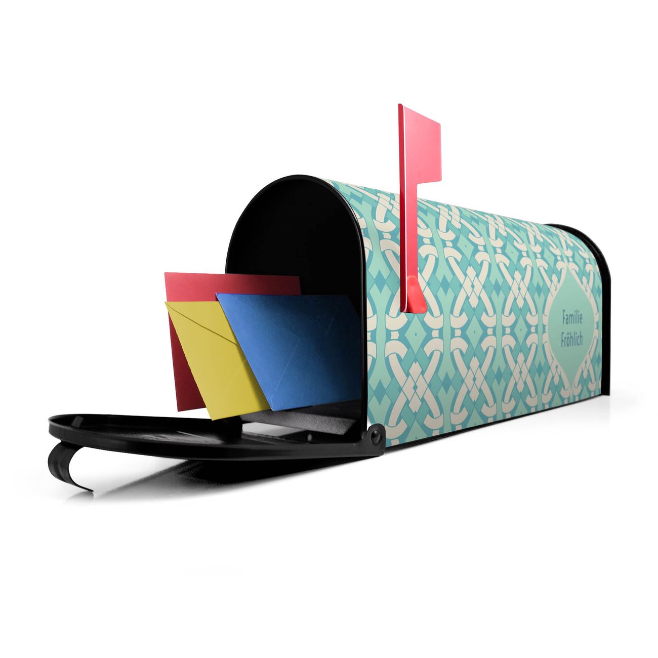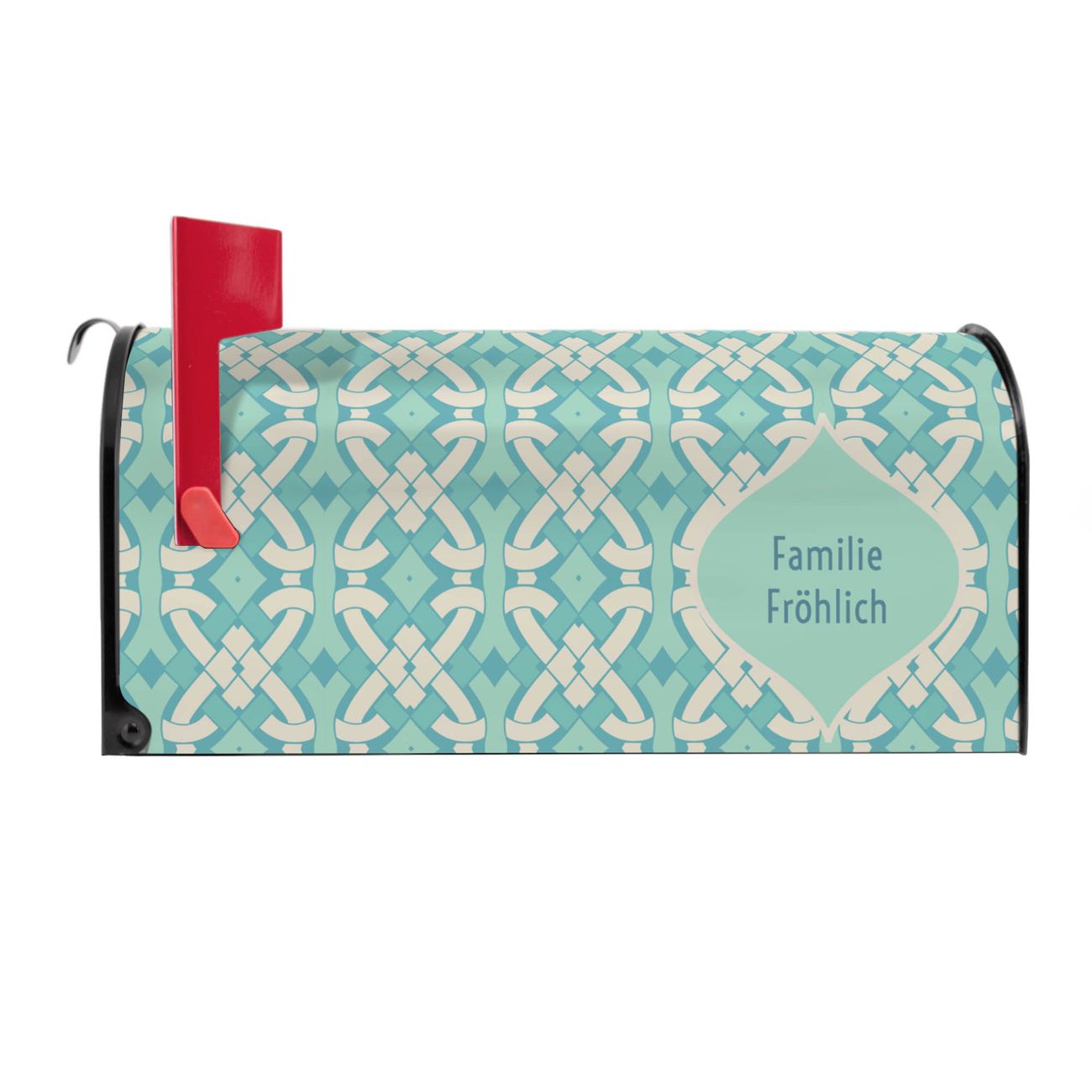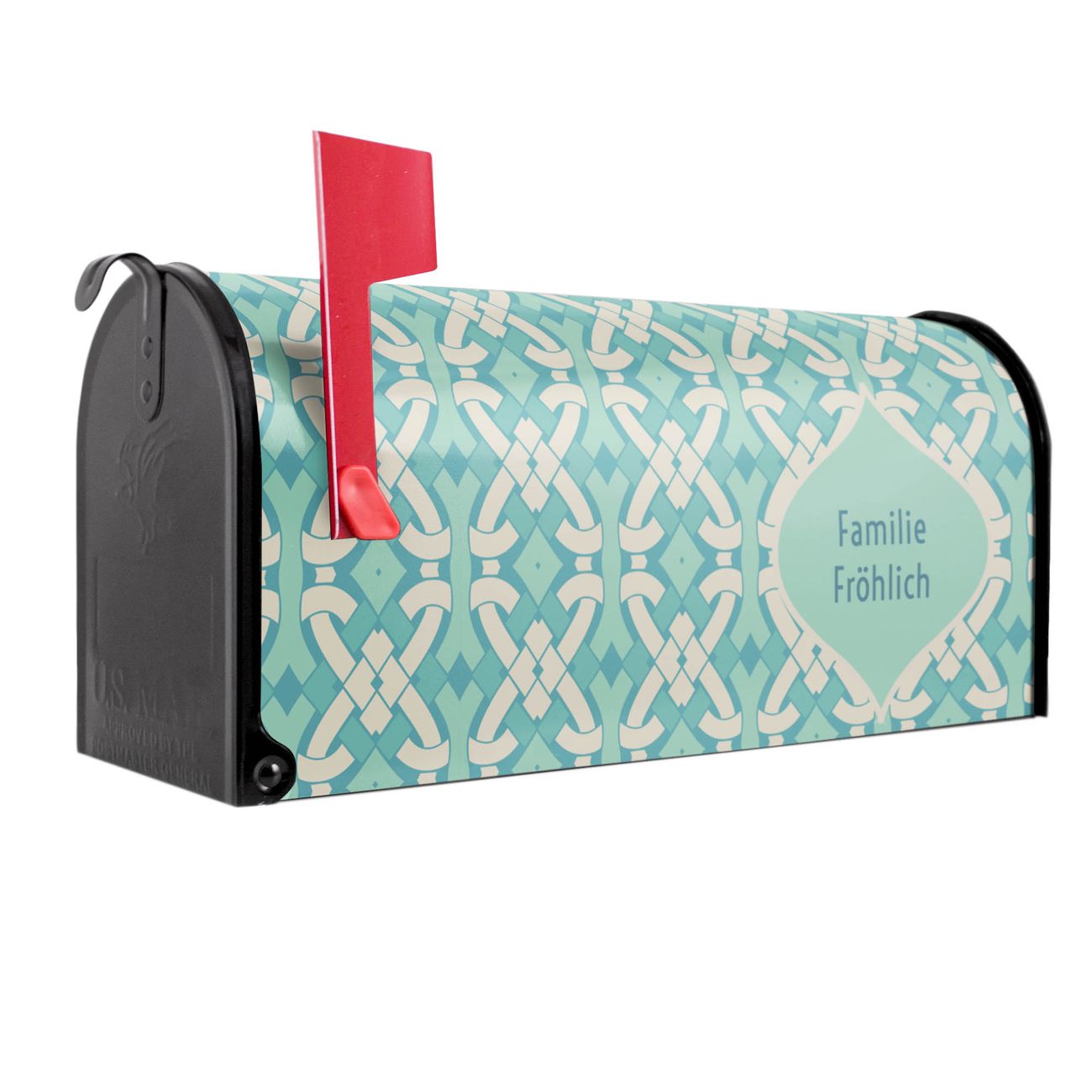 Unser amerikanischer Briefkasten mit dem Motiv Knoten Türkis hat ein sehr ansprechendes und ausgefallenes Design, ist in der Grundfarbe weiß, grün oder schwarz erhältlich. Damit entlocken Sie Ihren Nachbarn und dem Postboten immer wieder ein Lächeln. Die Mailbox ist ein Original Import aus Mississippi USA und wird von unserer kleinen Manufaktur in Sachsen von Hand veredelt. Die US-Mailbox bietet ausreichend Platz auch für große Sendungen, eine Fahne die Ihnen Post anzeigt, wetterfestes und äußerst stabiles Material - so macht Post empfangen Freude.