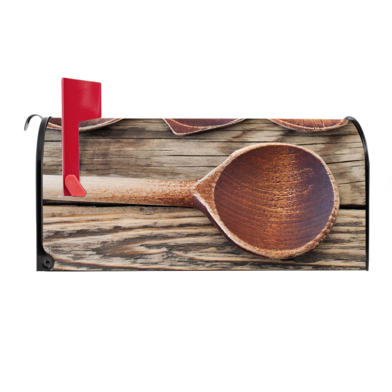 Der amerikanische Briefkasten von banjado mit Kochlöffel Motiv bietet Ihnen ausreichend Fassungsvermögen, um große A4 Sendungen und Zeitschriften zu empfangen. Die typisch amerikanische rote Fahne zeigt Ihnen an, wenn Sie Post erhalten haben. Die US-Mailbox besteht aus verzinktem Stahlblech welches lackiert wurde und ist 48 x 22 x 16 CM (BxHxT) groß. Die Folie mit Motiv Kochlöffel besteht aus einer wetter- und UV-resistenten Folie, die mit einem Schutzlaminat überzogen ist, sodass die US Mailbox zusätzlich vor Kratzern geschützt ist. An der Unterkante sind 4 Löcher je Seite um die Mailbox, typisch amerikanisch, an einem Holzpfahl oder einem Zaun zu befestigen. Auf Wunsch können Sie bei uns den passenden Standfuß oder die passende Wandhalterung kaufen um die US-Mailbox sicher zu befestigen. Wir bieten Ihnen ebenfalls Namensschilder, bereits beschriftet oder frei zu beschriften, und verschiedene selbst gestaltete Bitte-Keine-Werbung-Aufkleber.