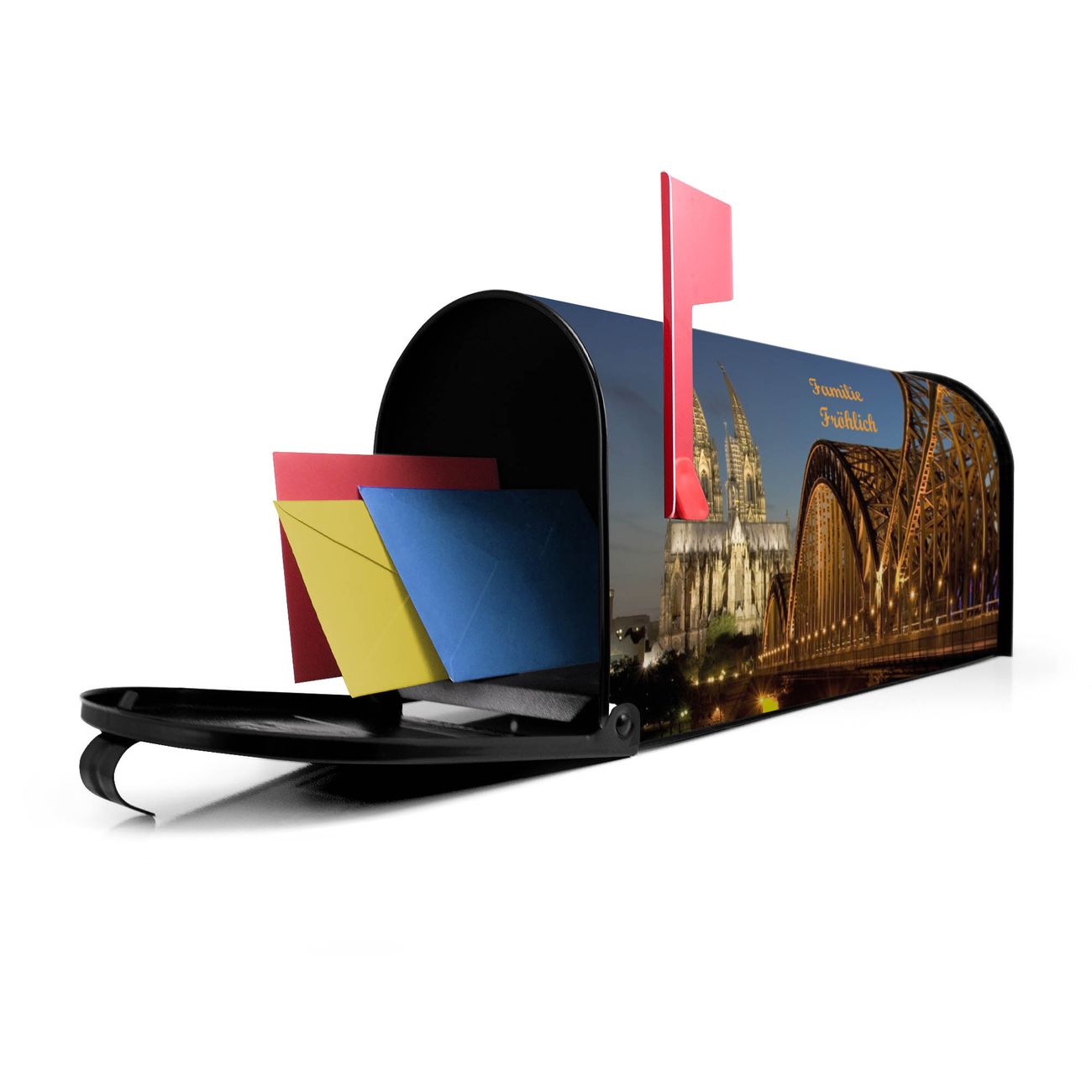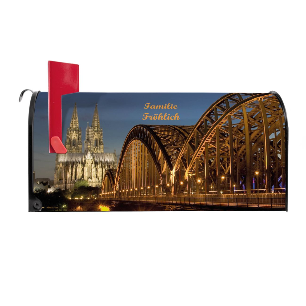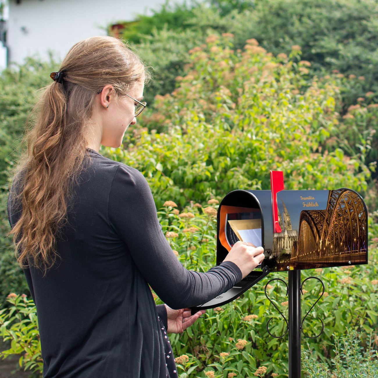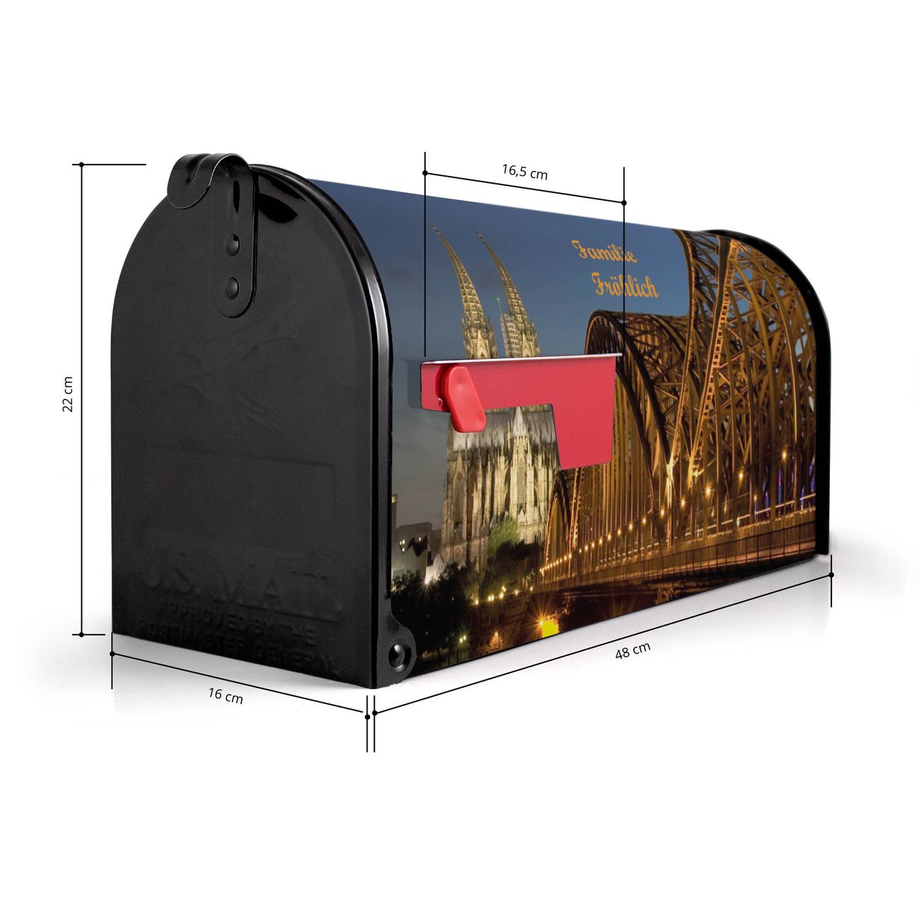 Der amerikanische Briefkasten von banjado mit Köln Motiv bietet Ihnen ausreichend Fassungsvermögen, um große A4 Sendungen und Zeitschriften zu empfangen. Die typisch amerikanische rote Fahne zeigt Ihnen an, wenn Sie Post erhalten haben. Die US-Mailbox besteht aus verzinktem Stahlblech welches lackiert wurde und ist 48 x 22 x 16 CM (BxHxT) groß. Die Folie mit Motiv Köln besteht aus einer wetter- und UV-resistenten Folie, die mit einem Schutzlaminat überzogen ist, sodass die US Mailbox zusätzlich vor Kratzern geschützt ist. An der Unterkante sind 4 Löcher je Seite um die Mailbox, typisch amerikanisch, an einem Holzpfahl oder einem Zaun zu befestigen. Auf Wunsch können Sie bei uns den passenden Standfuß oder die passende Wandhalterung kaufen um die US-Mailbox sicher zu befestigen. Wir bieten Ihnen ebenfalls Namensschilder, bereits beschriftet oder frei zu beschriften, und verschiedene selbst gestaltete Bitte-Keine-Werbung-Aufkleber.