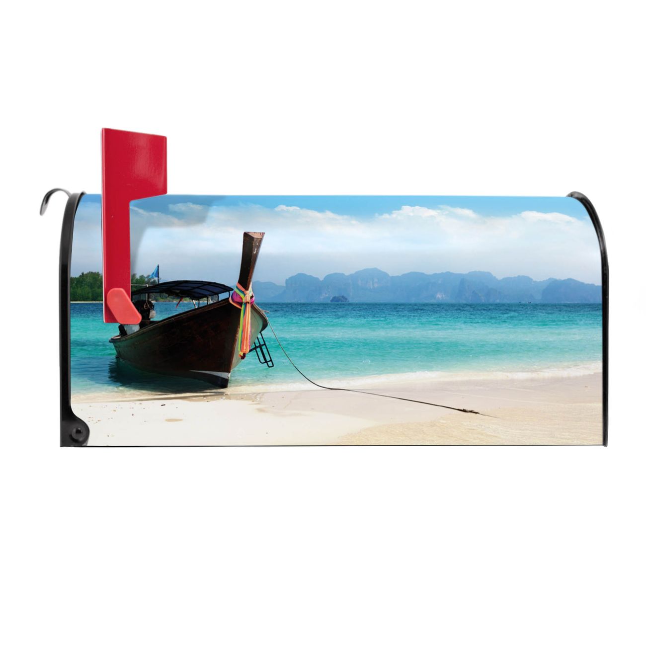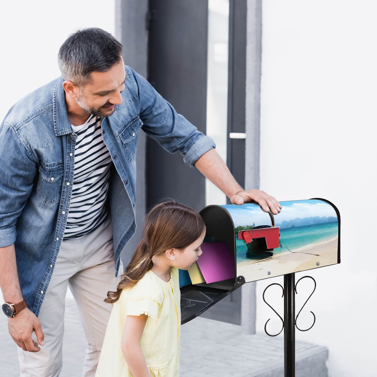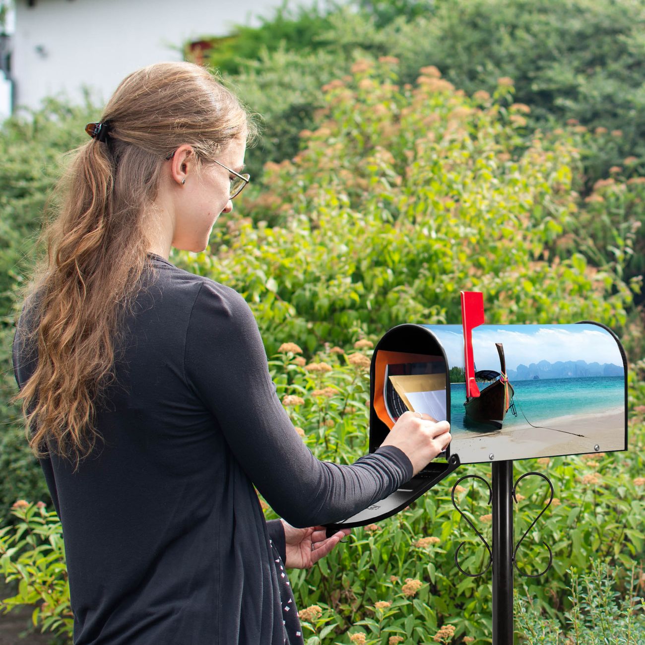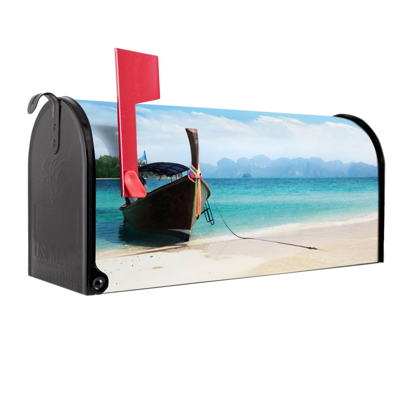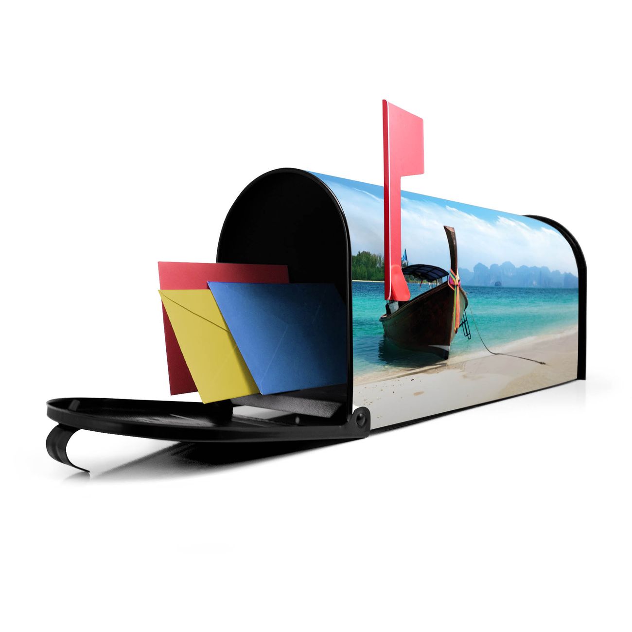 Der amerikanische Briefkasten von banjado mit Koh Poda Motiv bietet Ihnen ausreichend Fassungsvermögen, um große A4 Sendungen und Zeitschriften zu empfangen. Die typisch amerikanische rote Fahne zeigt Ihnen an, wenn Sie Post erhalten haben. Die US-Mailbox besteht aus verzinktem Stahlblech welches lackiert wurde und ist 48 x 22 x 16 CM (BxHxT) groß. Die Folie mit Motiv Koh Poda besteht aus einer wetter- und UV-resistenten Folie, die mit einem Schutzlaminat überzogen ist, sodass die US Mailbox zusätzlich vor Kratzern geschützt ist. An der Unterkante sind 4 Löcher je Seite um die Mailbox, typisch amerikanisch, an einem Holzpfahl oder einem Zaun zu befestigen. Auf Wunsch können Sie bei uns den passenden Standfuß oder die passende Wandhalterung kaufen um die US-Mailbox sicher zu befestigen. Wir bieten Ihnen ebenfalls Namensschilder, bereits beschriftet oder frei zu beschriften, und verschiedene selbst gestaltete Bitte-Keine-Werbung-Aufkleber.
