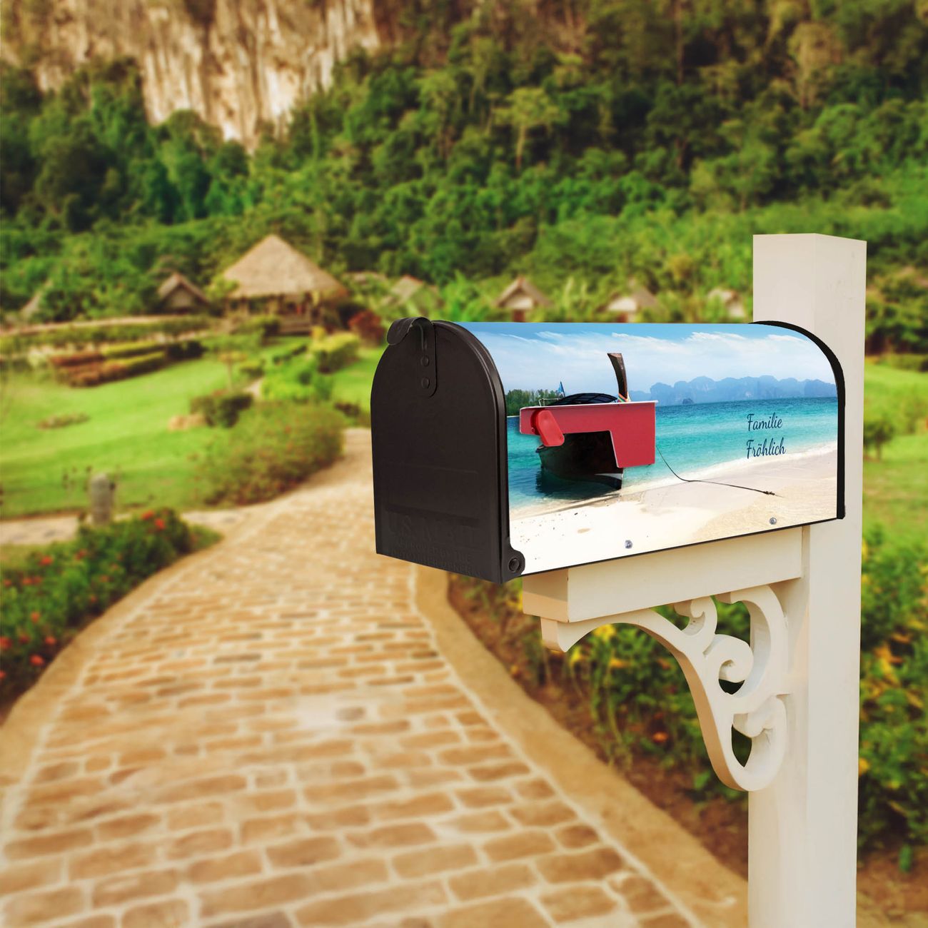 Der amerikanische Briefkasten von banjado mit Koh Poda Motiv bietet Ihnen ausreichend Fassungsvermögen, um große A4 Sendungen und Zeitschriften zu empfangen. Die typisch amerikanische rote Fahne zeigt Ihnen an, wenn Sie Post erhalten haben. Die US-Mailbox besteht aus verzinktem Stahlblech welches lackiert wurde und ist 48 x 22 x 16 CM (BxHxT) groß. Die Folie mit Motiv Koh Poda besteht aus einer wetter- und UV-resistenten Folie, die mit einem Schutzlaminat überzogen ist, sodass die US Mailbox zusätzlich vor Kratzern geschützt ist. An der Unterkante sind 4 Löcher je Seite um die Mailbox, typisch amerikanisch, an einem Holzpfahl oder einem Zaun zu befestigen. Auf Wunsch können Sie bei uns den passenden Standfuß oder die passende Wandhalterung kaufen um die US-Mailbox sicher zu befestigen. Wir bieten Ihnen ebenfalls Namensschilder, bereits beschriftet oder frei zu beschriften, und verschiedene selbst gestaltete Bitte-Keine-Werbung-Aufkleber.