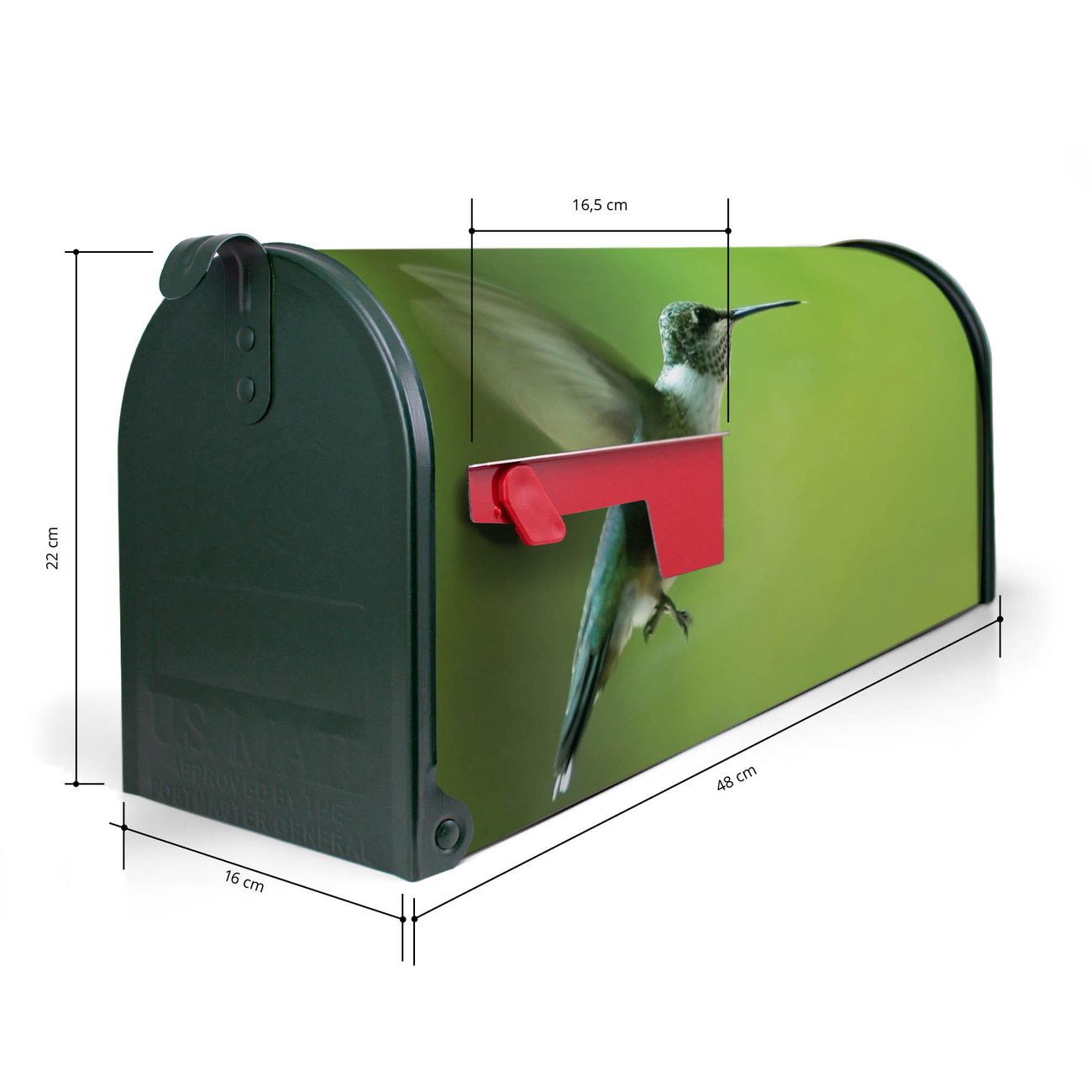 Der amerikanische Briefkasten von banjado mit Kolibri Motiv bietet Ihnen ausreichend Fassungsvermögen, um große A4 Sendungen und Zeitschriften zu empfangen. Die typisch amerikanische rote Fahne zeigt Ihnen an, wenn Sie Post erhalten haben. Die US-Mailbox besteht aus verzinktem Stahlblech welches lackiert wurde und ist 48 x 22 x 16 CM (BxHxT) groß. Die Folie mit Motiv Kolibri besteht aus einer wetter- und UV-resistenten Folie, die mit einem Schutzlaminat überzogen ist, sodass die US Mailbox zusätzlich vor Kratzern geschützt ist. An der Unterkante sind 4 Löcher je Seite um die Mailbox, typisch amerikanisch, an einem Holzpfahl oder einem Zaun zu befestigen. Auf Wunsch können Sie bei uns den passenden Standfuß oder die passende Wandhalterung kaufen um die US-Mailbox sicher zu befestigen. Wir bieten Ihnen ebenfalls Namensschilder, bereits beschriftet oder frei zu beschriften, und verschiedene selbst gestaltete Bitte-Keine-Werbung-Aufkleber.