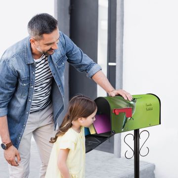Der amerikanische Briefkasten von banjado mit Kolibri Motiv bietet Ihnen ausreichend Fassungsvermögen, um große A4 Sendungen und Zeitschriften zu empfangen. Die typisch amerikanische rote Fahne zeigt Ihnen an, wenn Sie Post erhalten haben. Die US-Mailbox besteht aus verzinktem Stahlblech welches lackiert wurde und ist 48 x 22 x 16 CM (BxHxT) groß. Die Folie mit Motiv Kolibri besteht aus einer wetter- und UV-resistenten Folie, die mit einem Schutzlaminat überzogen ist, sodass die US Mailbox zusätzlich vor Kratzern geschützt ist. An der Unterkante sind 4 Löcher je Seite um die Mailbox, typisch amerikanisch, an einem Holzpfahl oder einem Zaun zu befestigen. Auf Wunsch können Sie bei uns den passenden Standfuß oder die passende Wandhalterung kaufen um die US-Mailbox sicher zu befestigen. Wir bieten Ihnen ebenfalls Namensschilder, bereits beschriftet oder frei zu beschriften, und verschiedene selbst gestaltete Bitte-Keine-Werbung-Aufkleber.