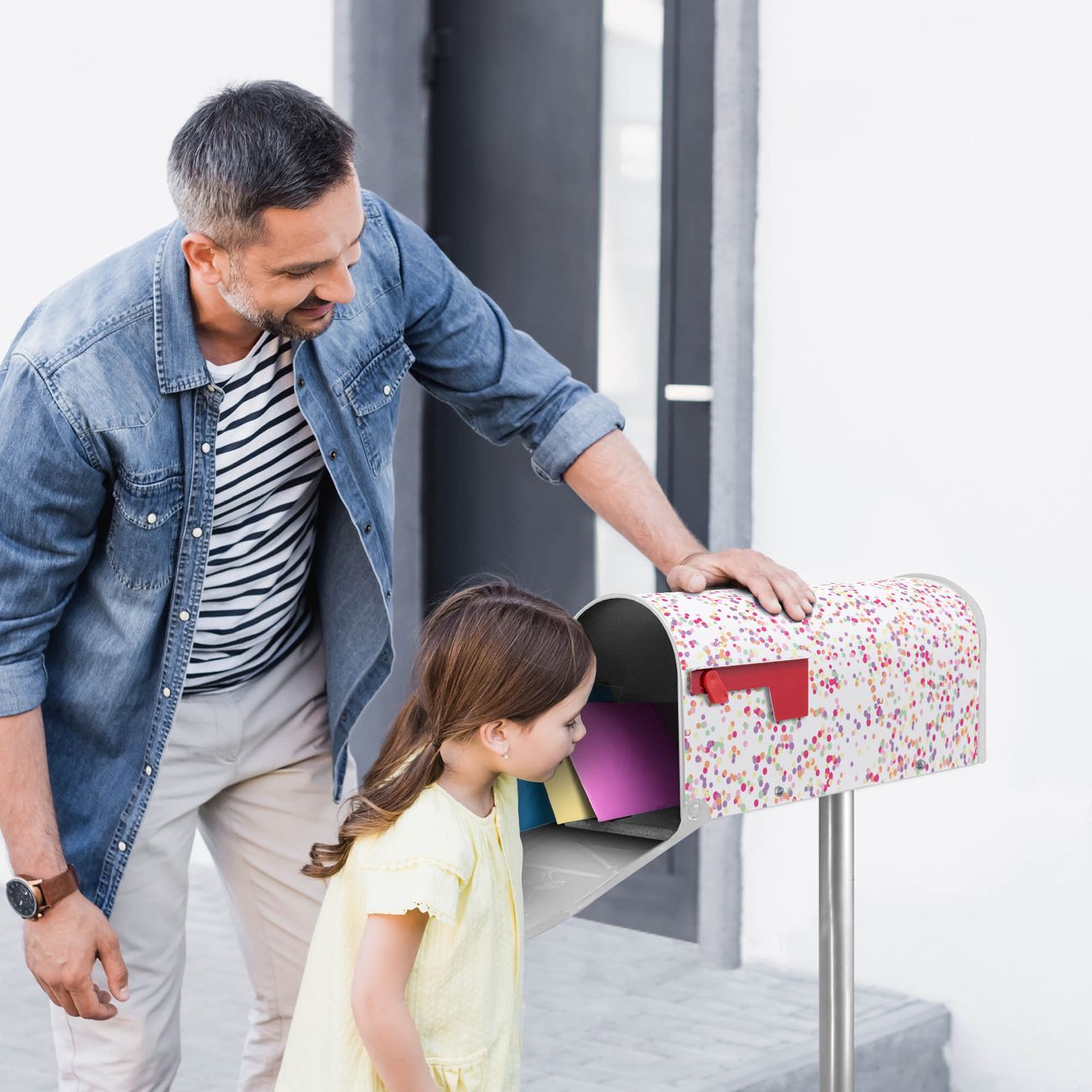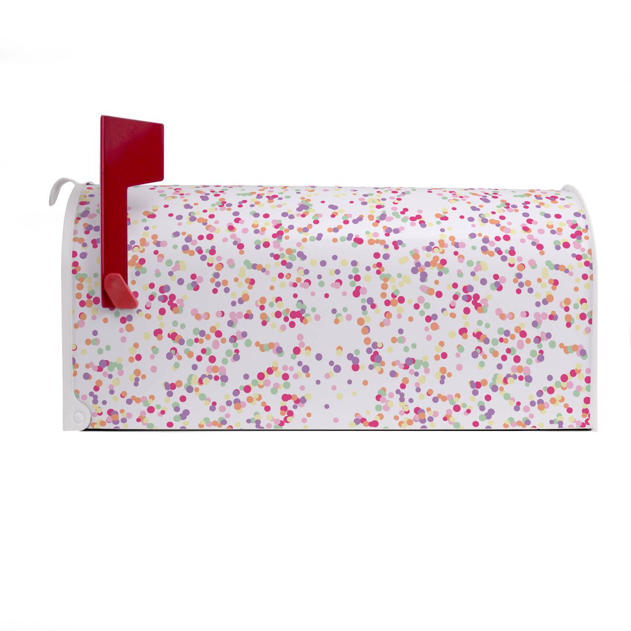 Der amerikanische Briefkasten von banjado mit Konfettiregen Motiv bietet Ihnen ausreichend Fassungsvermögen, um große A4 Sendungen und Zeitschriften zu empfangen. Die typisch amerikanische rote Fahne zeigt Ihnen an, wenn Sie Post erhalten haben. Die US-Mailbox besteht aus verzinktem Stahlblech welches lackiert wurde und ist 48 x 22 x 16 CM (BxHxT) groß. Die Folie mit Motiv Konfettiregen besteht aus einer wetter- und UV-resistenten Folie, die mit einem Schutzlaminat überzogen ist, sodass die US Mailbox zusätzlich vor Kratzern geschützt ist. An der Unterkante sind 4 Löcher je Seite um die Mailbox, typisch amerikanisch, an einem Holzpfahl oder einem Zaun zu befestigen. Auf Wunsch können Sie bei uns den passenden Standfuß oder die passende Wandhalterung kaufen um die US-Mailbox sicher zu befestigen. Wir bieten Ihnen ebenfalls Namensschilder, bereits beschriftet oder frei zu beschriften, und verschiedene selbst gestaltete Bitte-Keine-Werbung-Aufkleber.