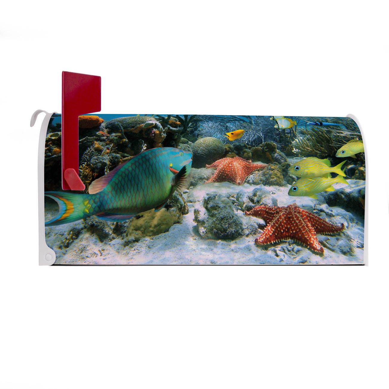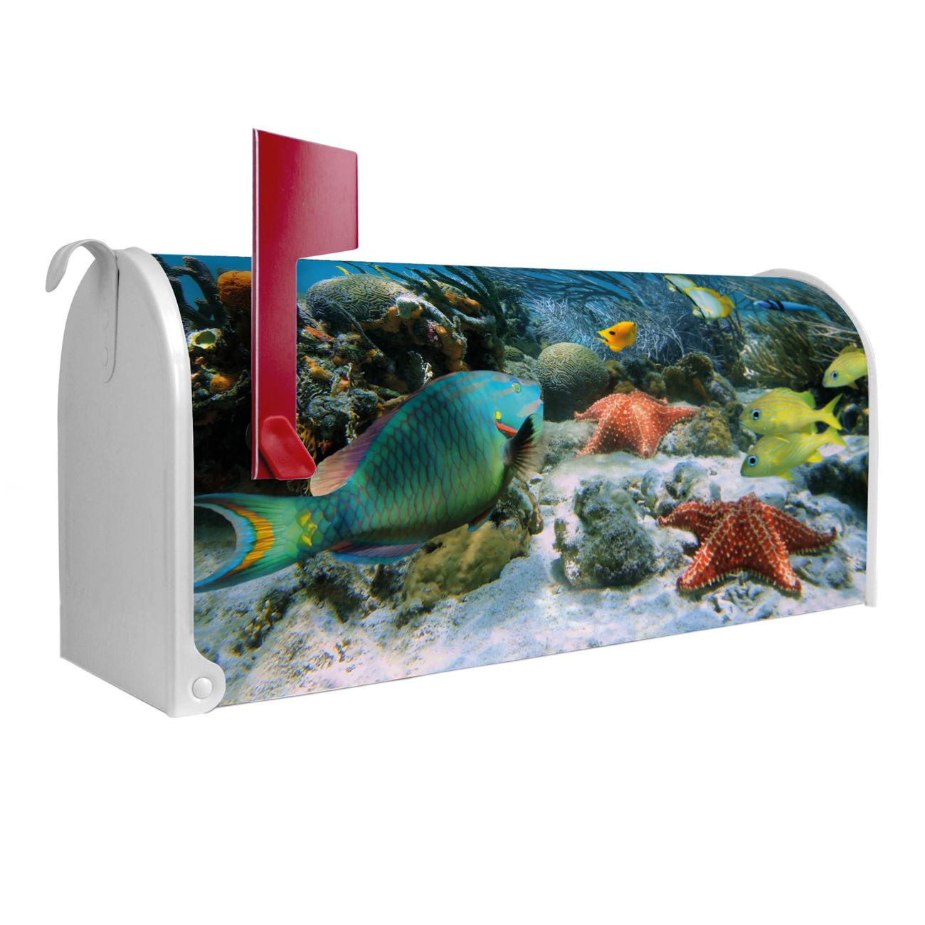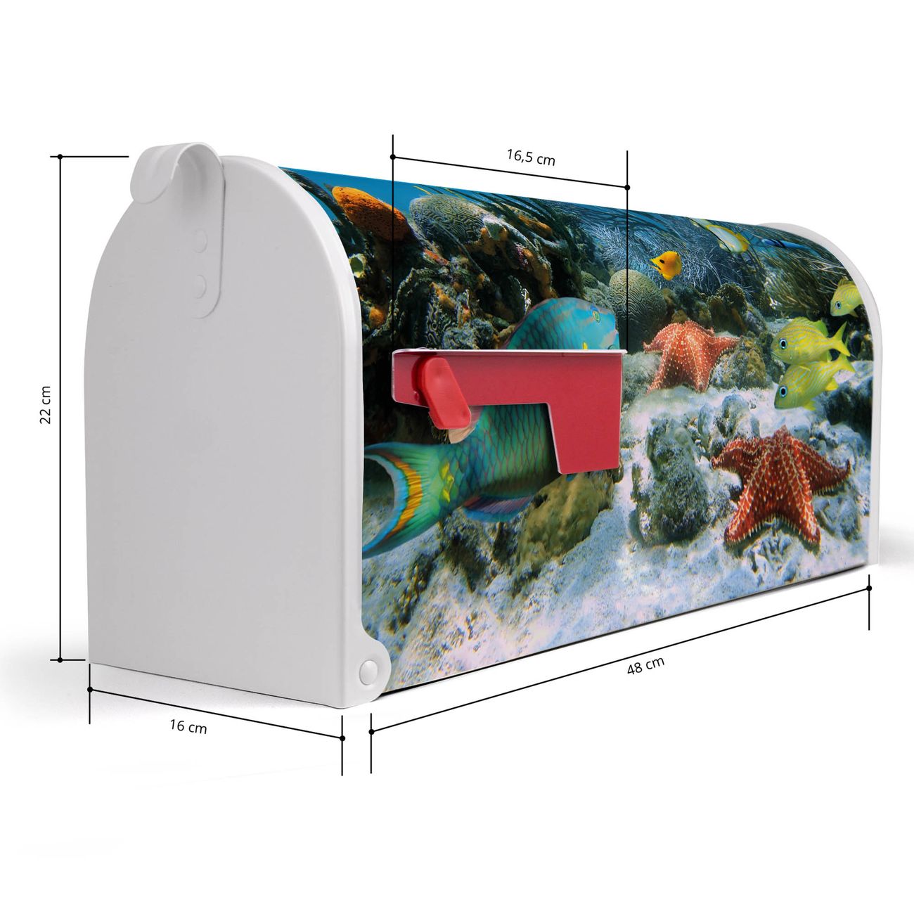 Der amerikanische Briefkasten von banjado mit Korallenriff 1 Motiv bietet Ihnen ausreichend Fassungsvermögen, um große A4 Sendungen und Zeitschriften zu empfangen. Die typisch amerikanische rote Fahne zeigt Ihnen an, wenn Sie Post erhalten haben. Die US-Mailbox besteht aus verzinktem Stahlblech welches lackiert wurde und ist 48 x 22 x 16 CM (BxHxT) groß. Die Folie mit Motiv Korallenriff 1 besteht aus einer wetter- und UV-resistenten Folie, die mit einem Schutzlaminat überzogen ist, sodass die US Mailbox zusätzlich vor Kratzern geschützt ist. An der Unterkante sind 4 Löcher je Seite um die Mailbox, typisch amerikanisch, an einem Holzpfahl oder einem Zaun zu befestigen. Auf Wunsch können Sie bei uns den passenden Standfuß oder die passende Wandhalterung kaufen um die US-Mailbox sicher zu befestigen. Wir bieten Ihnen ebenfalls Namensschilder, bereits beschriftet oder frei zu beschriften, und verschiedene selbst gestaltete Bitte-Keine-Werbung-Aufkleber.