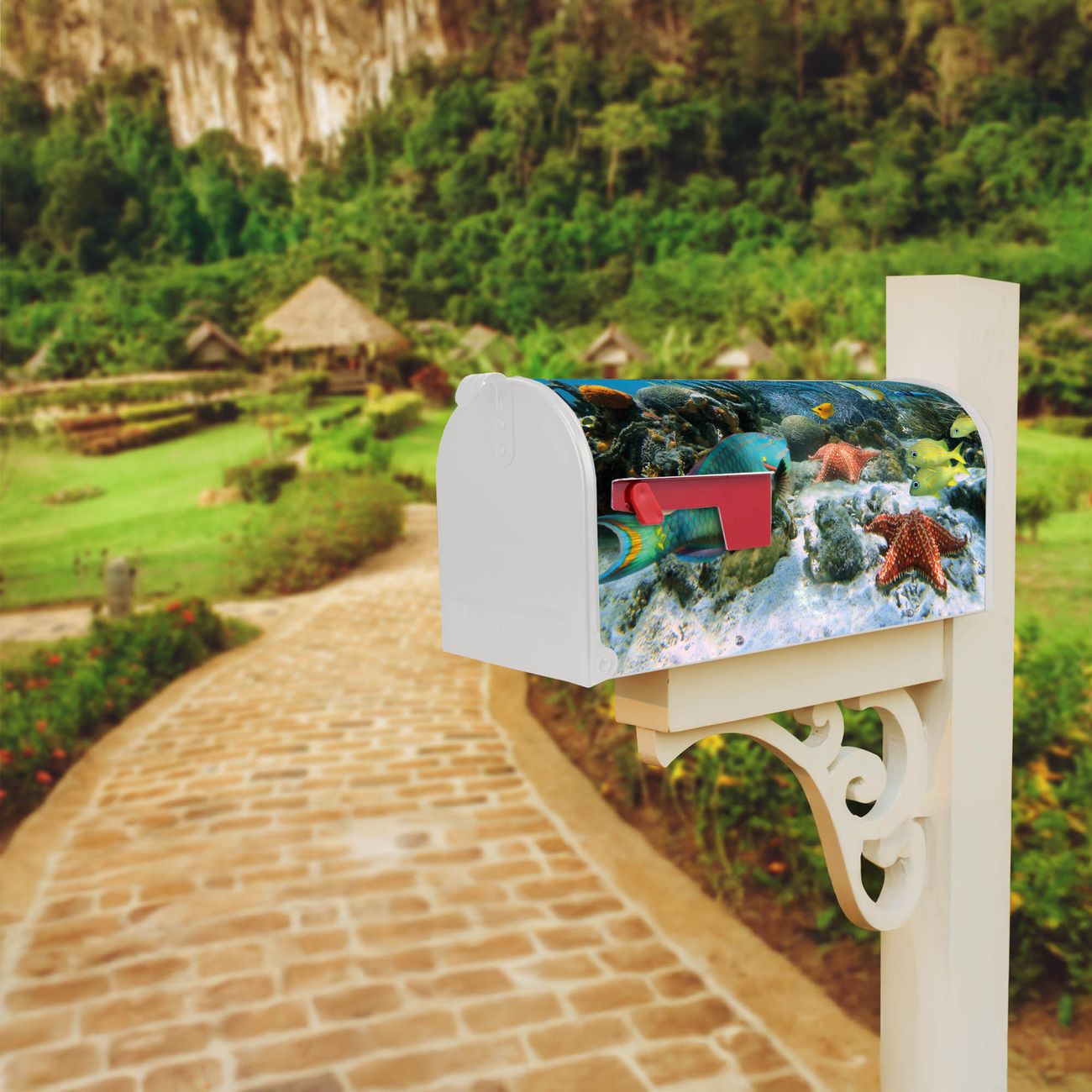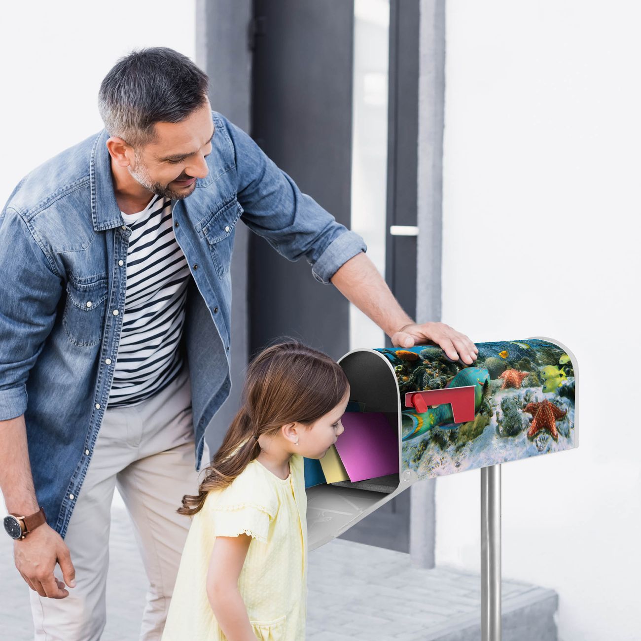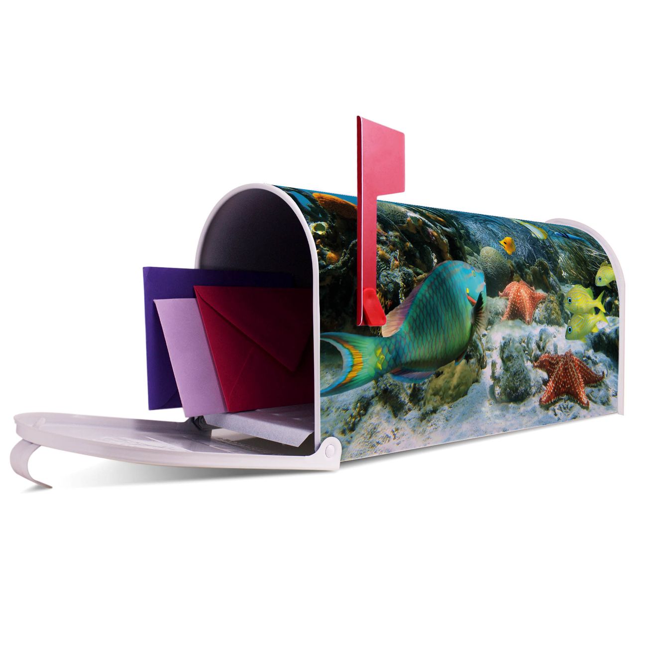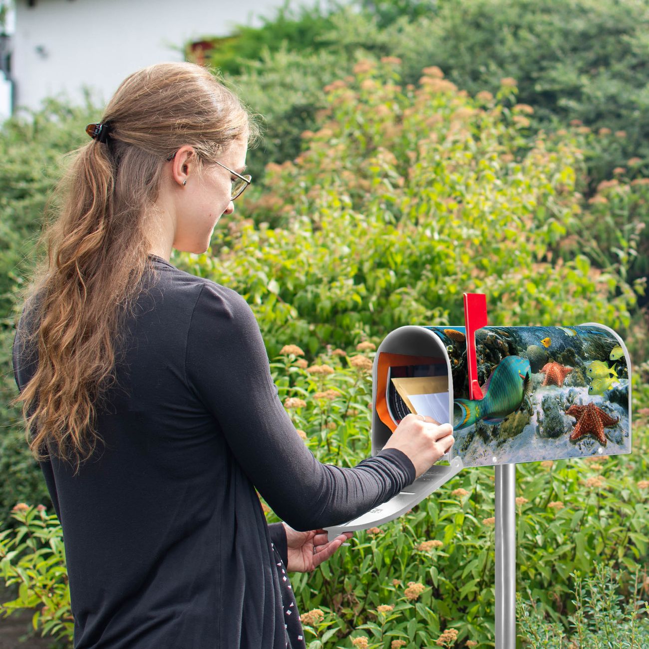 Der amerikanische Briefkasten von banjado mit Korallenriff 1 Motiv bietet Ihnen ausreichend Fassungsvermögen, um große A4 Sendungen und Zeitschriften zu empfangen. Die typisch amerikanische rote Fahne zeigt Ihnen an, wenn Sie Post erhalten haben. Die US-Mailbox besteht aus verzinktem Stahlblech welches lackiert wurde und ist 48 x 22 x 16 CM (BxHxT) groß. Die Folie mit Motiv Korallenriff 1 besteht aus einer wetter- und UV-resistenten Folie, die mit einem Schutzlaminat überzogen ist, sodass die US Mailbox zusätzlich vor Kratzern geschützt ist. An der Unterkante sind 4 Löcher je Seite um die Mailbox, typisch amerikanisch, an einem Holzpfahl oder einem Zaun zu befestigen. Auf Wunsch können Sie bei uns den passenden Standfuß oder die passende Wandhalterung kaufen um die US-Mailbox sicher zu befestigen. Wir bieten Ihnen ebenfalls Namensschilder, bereits beschriftet oder frei zu beschriften, und verschiedene selbst gestaltete Bitte-Keine-Werbung-Aufkleber.