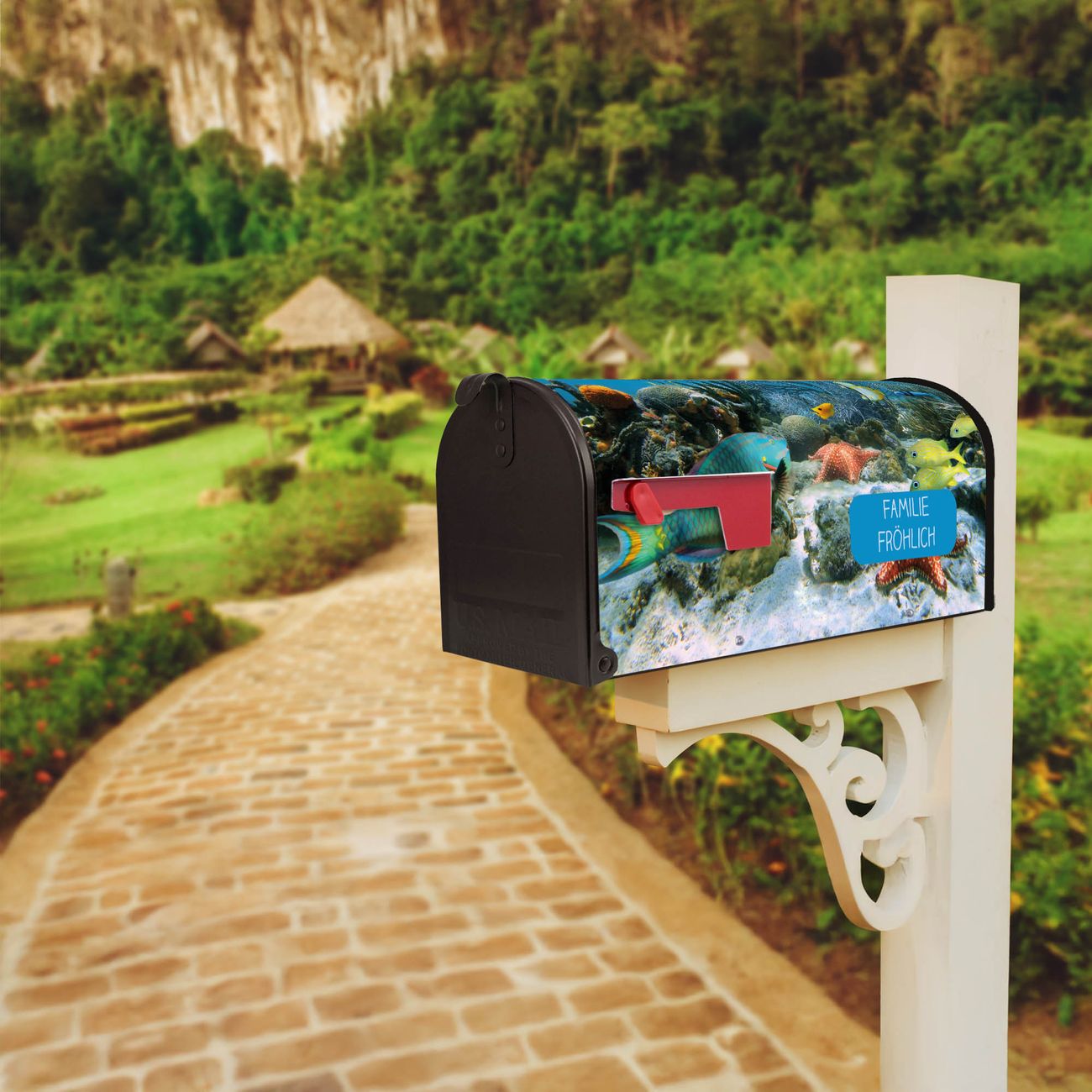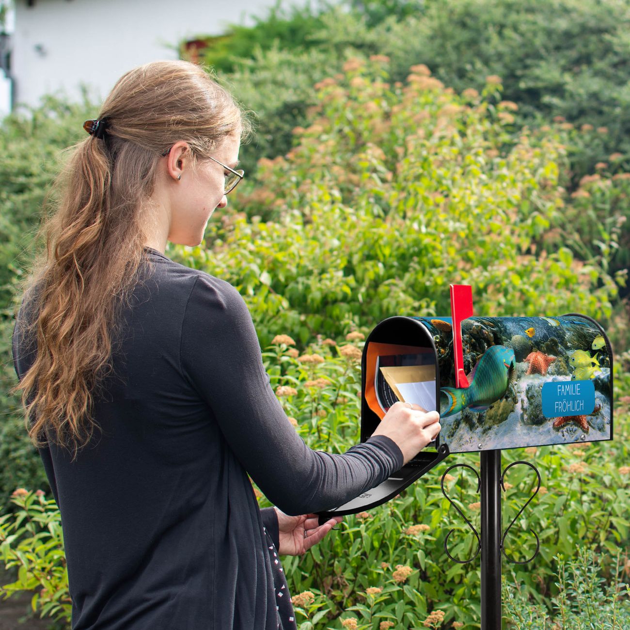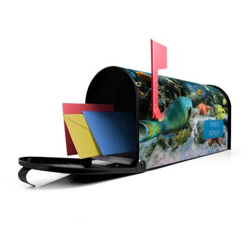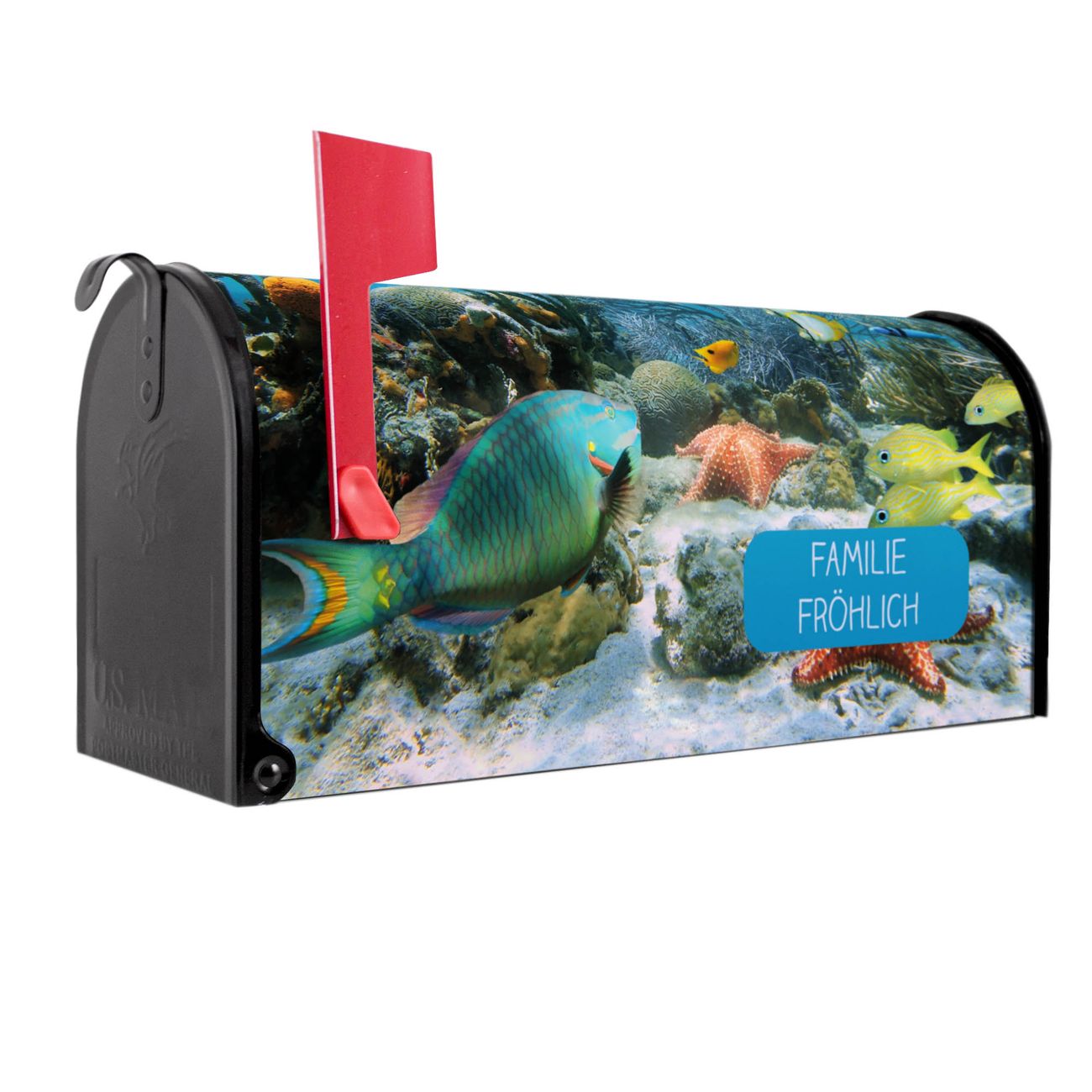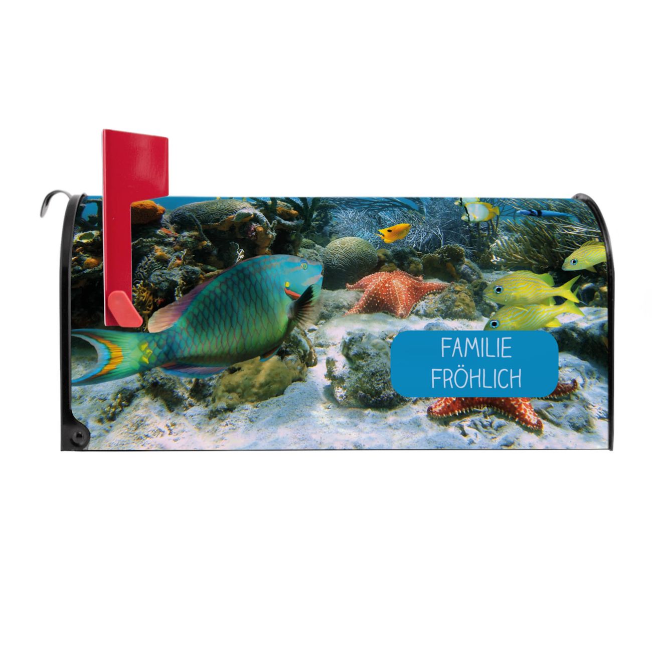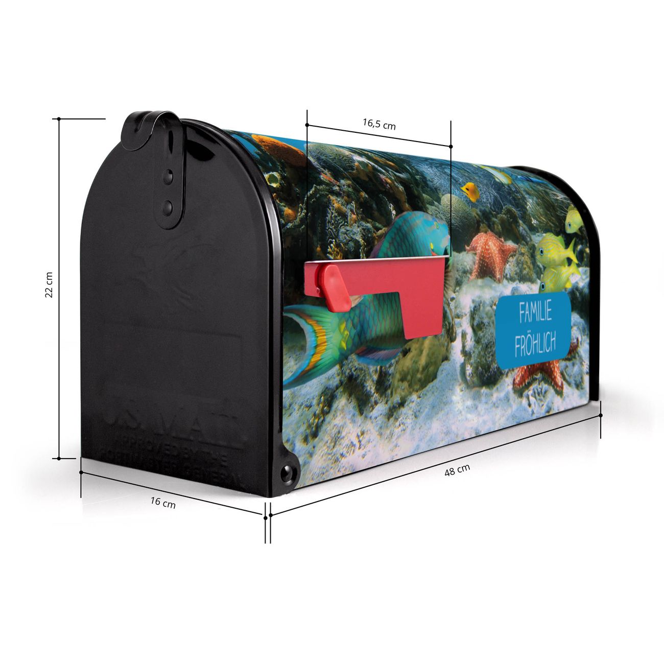 Der amerikanische Briefkasten von banjado mit Korallenriff 1 Motiv bietet Ihnen ausreichend Fassungsvermögen, um große A4 Sendungen und Zeitschriften zu empfangen. Die typisch amerikanische rote Fahne zeigt Ihnen an, wenn Sie Post erhalten haben. Die US-Mailbox besteht aus verzinktem Stahlblech welches lackiert wurde und ist 48 x 22 x 16 CM (BxHxT) groß. Die Folie mit Motiv Korallenriff 1 besteht aus einer wetter- und UV-resistenten Folie, die mit einem Schutzlaminat überzogen ist, sodass die US Mailbox zusätzlich vor Kratzern geschützt ist. An der Unterkante sind 4 Löcher je Seite um die Mailbox, typisch amerikanisch, an einem Holzpfahl oder einem Zaun zu befestigen. Auf Wunsch können Sie bei uns den passenden Standfuß oder die passende Wandhalterung kaufen um die US-Mailbox sicher zu befestigen. Wir bieten Ihnen ebenfalls Namensschilder, bereits beschriftet oder frei zu beschriften, und verschiedene selbst gestaltete Bitte-Keine-Werbung-Aufkleber.