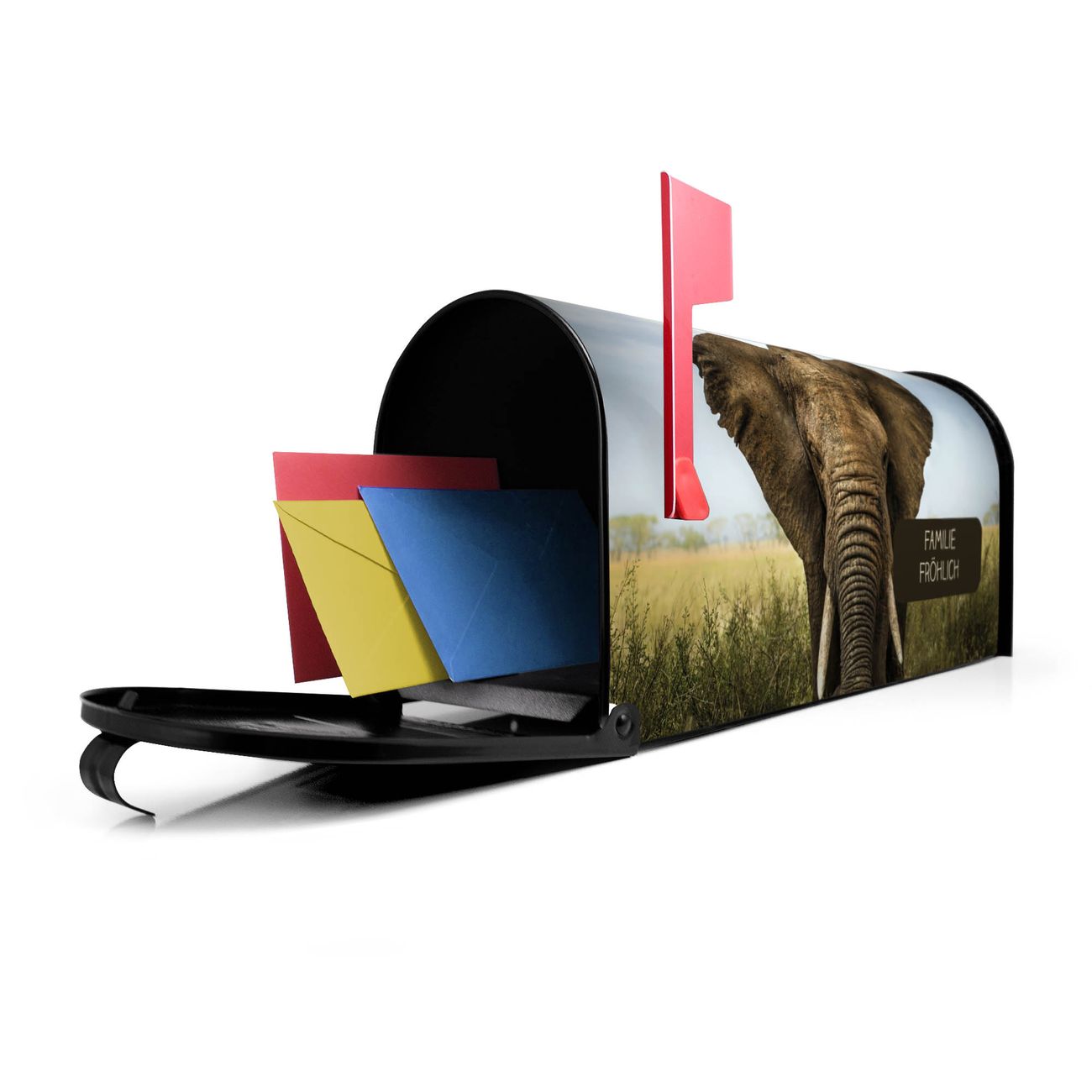 Der amerikanische Briefkasten von banjado mit Korbinian Motiv bietet Ihnen ausreichend Fassungsvermögen, um große A4 Sendungen und Zeitschriften zu empfangen. Die typisch amerikanische rote Fahne zeigt Ihnen an, wenn Sie Post erhalten haben. Die US-Mailbox besteht aus verzinktem Stahlblech welches lackiert wurde und ist 48 x 22 x 16 CM (BxHxT) groß. Die Folie mit Motiv Korbinian besteht aus einer wetter- und UV-resistenten Folie, die mit einem Schutzlaminat überzogen ist, sodass die US Mailbox zusätzlich vor Kratzern geschützt ist. An der Unterkante sind 4 Löcher je Seite um die Mailbox, typisch amerikanisch, an einem Holzpfahl oder einem Zaun zu befestigen. Auf Wunsch können Sie bei uns den passenden Standfuß oder die passende Wandhalterung kaufen um die US-Mailbox sicher zu befestigen. Wir bieten Ihnen ebenfalls Namensschilder, bereits beschriftet oder frei zu beschriften, und verschiedene selbst gestaltete Bitte-Keine-Werbung-Aufkleber.